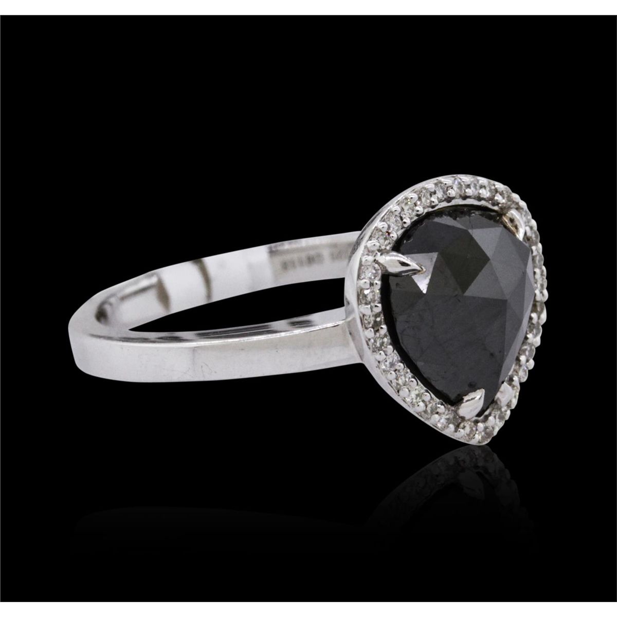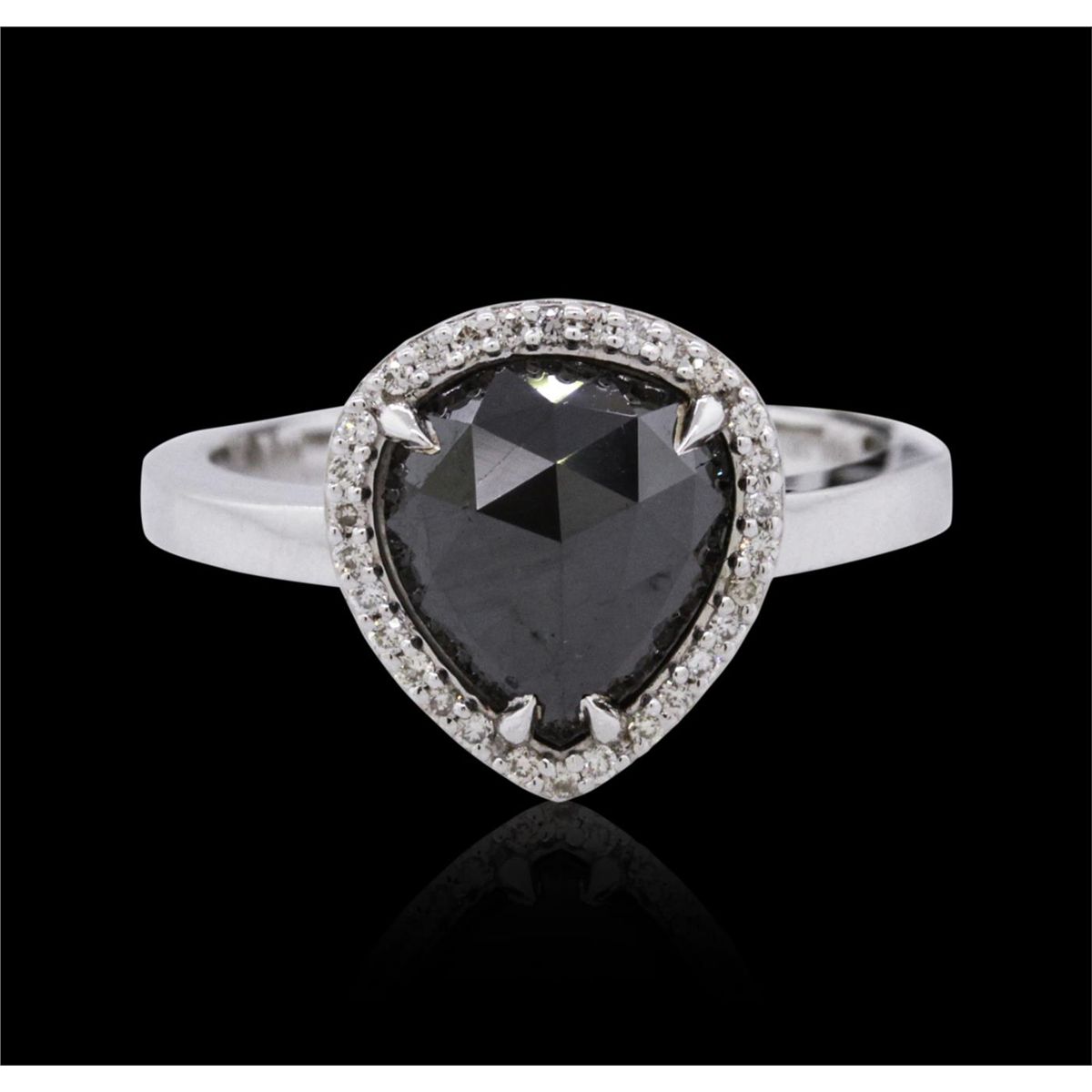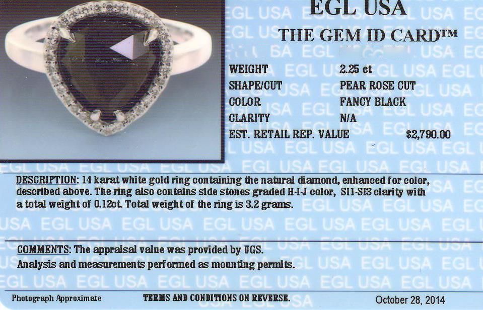 One 14KT white gold ring containing one natural pear rose cut fancy black diamond, enhanced for color, with a total weight of 2.25ct. The ring also contains side stones graded H-I-J color, SI1-SI3 clarity with a total weight of 0.12ct. Total weight of the ring is 3.20 grams. EGL Appraised at $2,790.00.