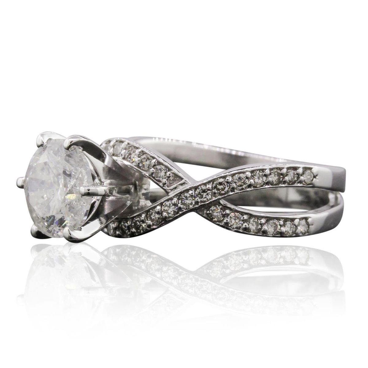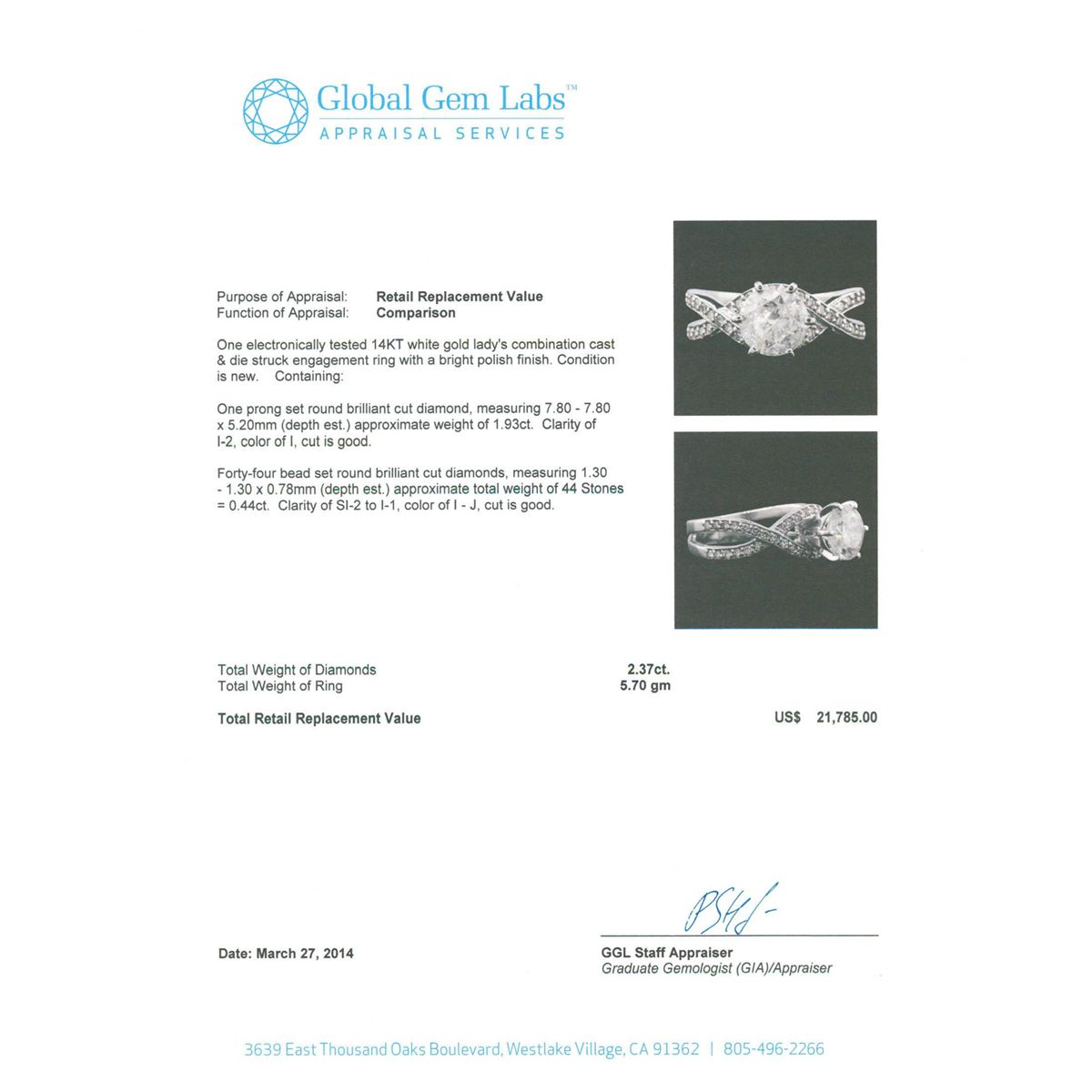 One electronically tested 14KT white gold Ladies combination cast & die struck engagement ring with a bright polish finish. Condition is new. Containing: One prong set round brilliant cut diamond, measuring 7.80 - 7.80 x 5.20mm (depth est.) approximate weight of 1.93ct. Clarity: I-2. Color: I, Cut is Good. Forty-Four bead set round brilliant cut diamonds, measuring 1.30 - 1.30 x 0.78mm (depth est.) approximate. Total Weight of 44 Stones = 0.44ct. Clarity: SI-2 to I-1. Color: I - J, Cut is Good. Total Weight of Diamonds 2.37ct. Total Weight of Ring 5.70 grams. GGL Appraised at $21,785.00.