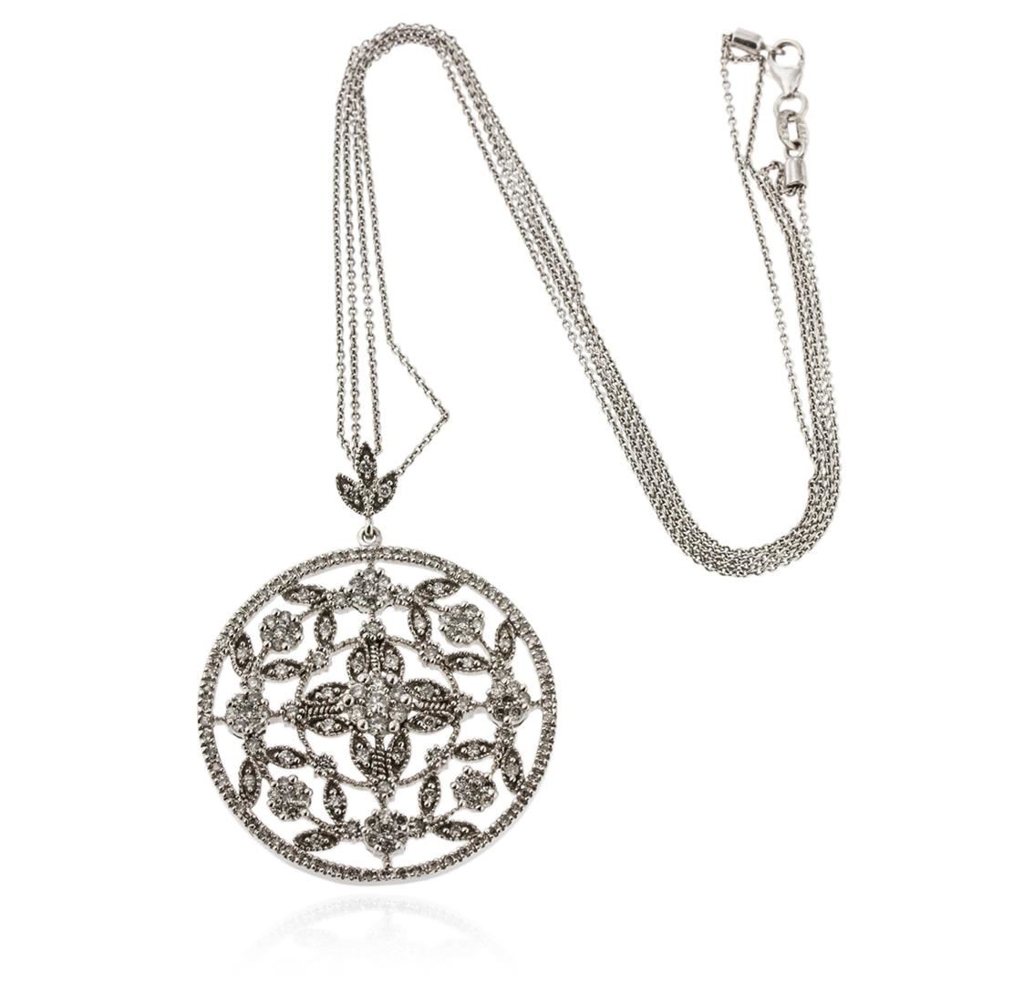 One electronically tested 14KT white gold ladies combination cast & assembled diamond pendant & chain 16.0" long, thin oval cable link with a lobster claw clasp with a bright polish finish. Identified with markings of "14K". Condition is new. Containing: Nine prong set round brilliant cut diamonds, measuring 2.50 - 2.00 x 1.35mm (depth est.) approximate total weight of 9 Stones = 0.37ct. Clarity of I-1 to I-3, Color of I - J. One Hundred Sixty-Three prong set round brilliant cut diamonds, measuring 1.50 - 1.50 x 0.90mm (depth est.) approximate total weight of 163 Stones = 2.01ct. Clarity of SI-2 to I-2, Color of I - J. All diamonds are graded in the mounting, unless otherwise stated. Total Weight of Diamonds 2.38ct. Total Weight of Pendant & Chain 15.60 grams. GGL Appraised at $6,555.00.