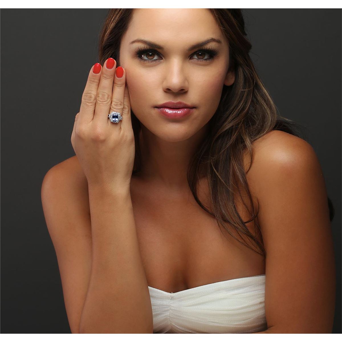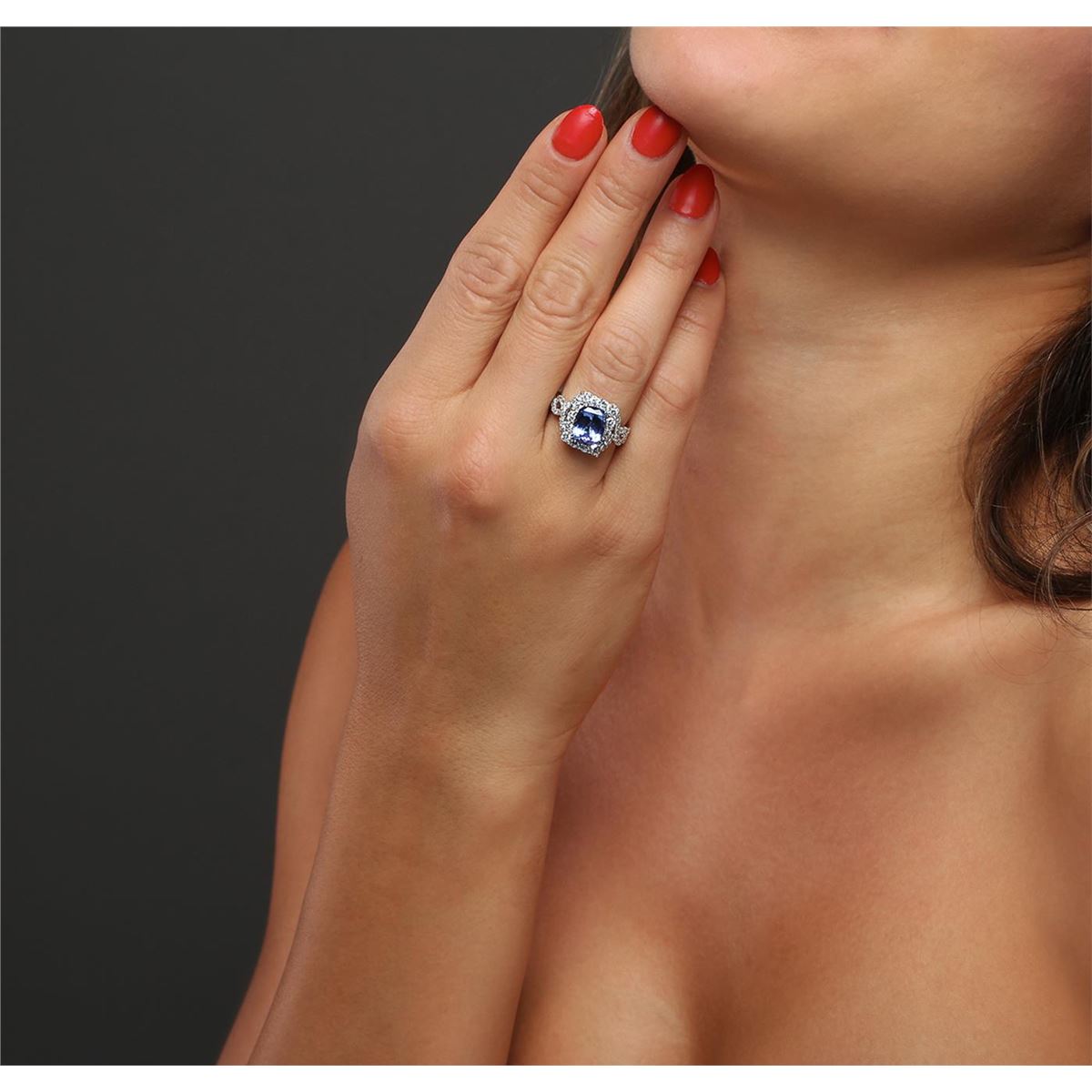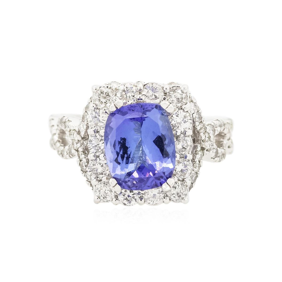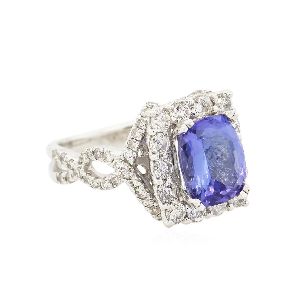 One electronically tested 14KT white gold Ladies combination cast & assembled ring with a bright polish finish. Condition is new. Identified with markings of "14K". Containing: One prong set rectangular cushion modified brilliant cut natural tanzanite, measuring 9.60 x 7.70 x 4.09mm, approximate weight of 2.38ct., clarity is eye clean, type I, medium light, very slightly grayish, bluish violet color, (GIA bV 4/3), cut is good. Colored gemstones are presumed to have been subjected to commonly used color/clarity enhancement processes. Seventy-Four prong set round brilliant cut diamonds, measuring 2.40 - 1.80 x 1.26mm (depth est.) approximate. Total Weight of 74 Stones = 1.05ct. Clarity: I-1 to I-2. Color: I - J, Cut is Good. Total Weight of Colored Stones 2.38ct. Total Weight of Diamonds 1.05ct. Total Weight of Ring 7.70 grams. GGL Appraised at $8,550.00.