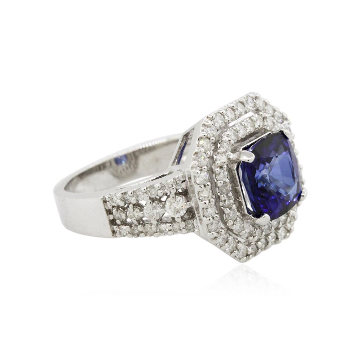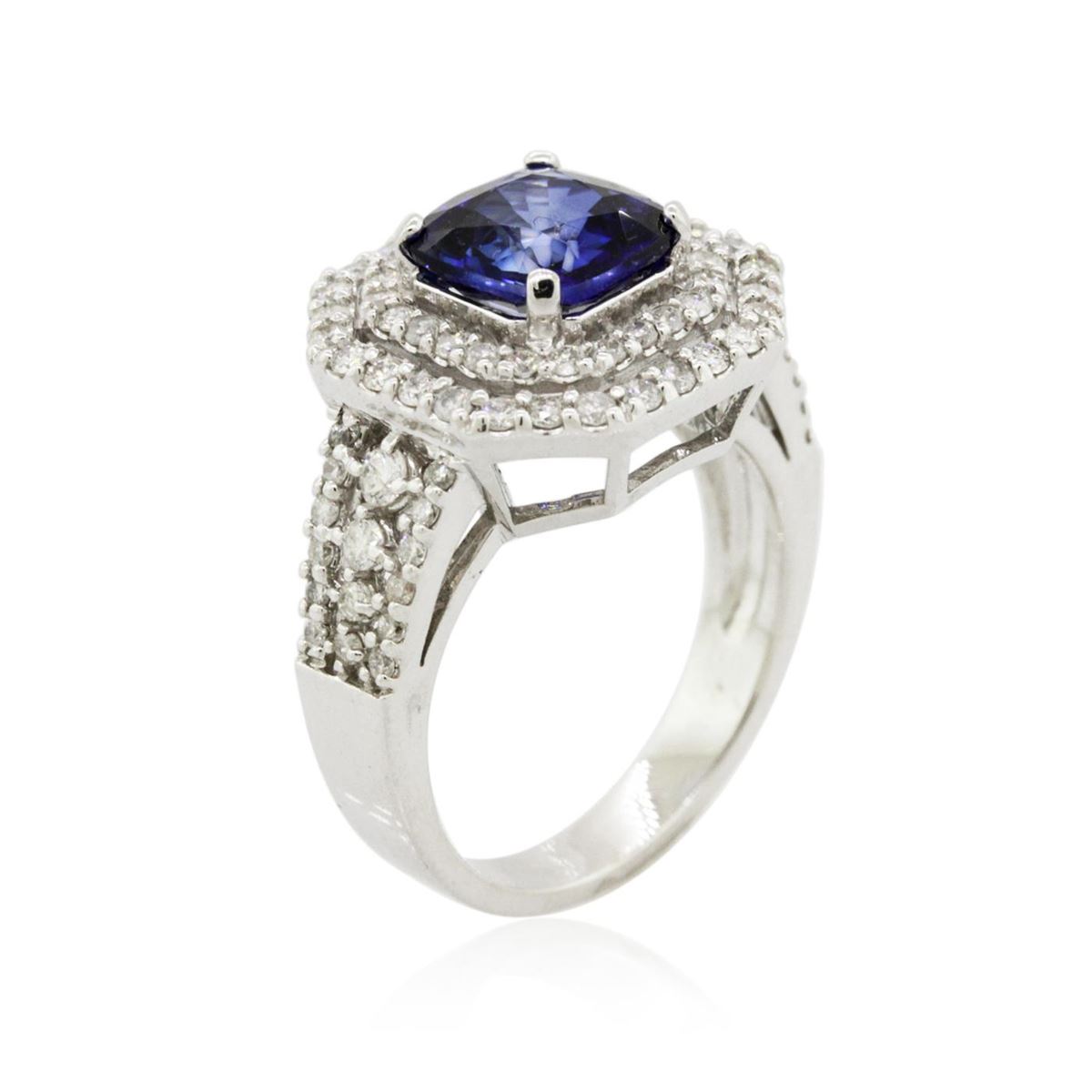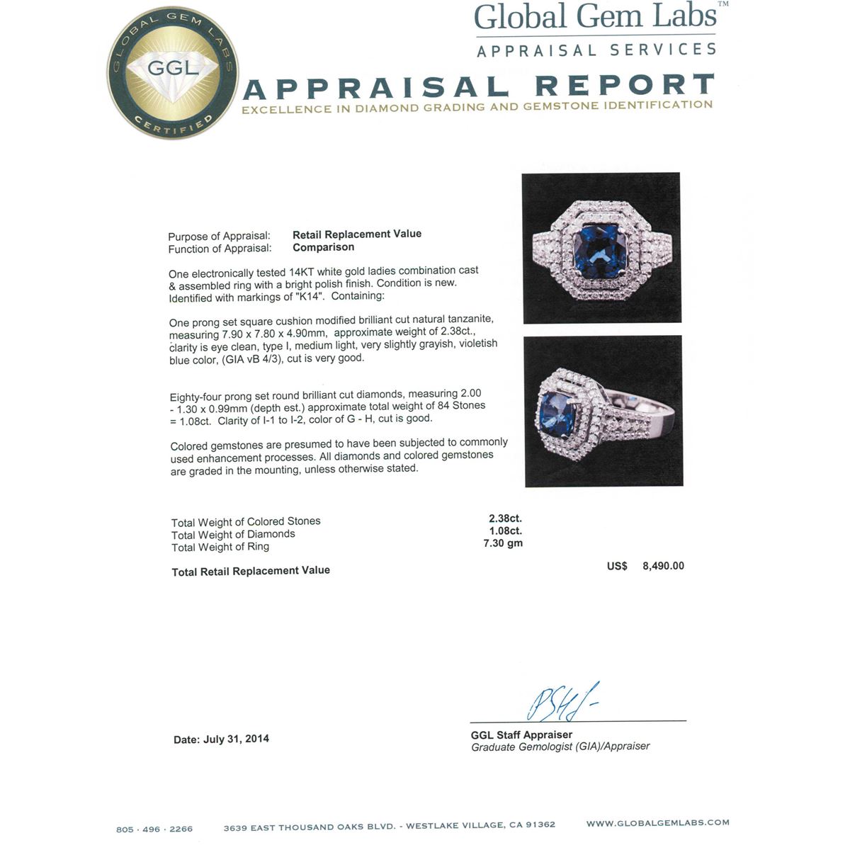 One electronically tested 14KT white gold ladies combination cast & assembled ring with a bright polish finish. Condition is new. Identified with markings of "K14".  Containing: One prong set square cushion modified brilliant cut natural tanzanite, measuring 7.90 x 7.80 x 4.90mm, approximate weight of 2.38ct., clarity is eye clean, type I, medium light, very slightly grayish, violetish blue color, (GIA vB 4/3), cut is very good. Eighty-Four prong set round brilliant cut diamonds, measuring 2.00 - 1.30 x 0.99mm (depth est.) approximate. Total Weight of 84 Stones = 1.08ct. Clarity: I-1 to I-2. Color: G - H, Cut is Good. Colored gemstones are presumed to have been subjected to commonly used enhancement processes. All diamonds and colored gemstones are graded in the mounting, unless otherwise stated. Total Weight of Colored Stones 2.38ct. Total Weight of Diamonds 1.08ct. Total Weight of Ring 7.30 grams. GGL Appraised at $8,490.00.