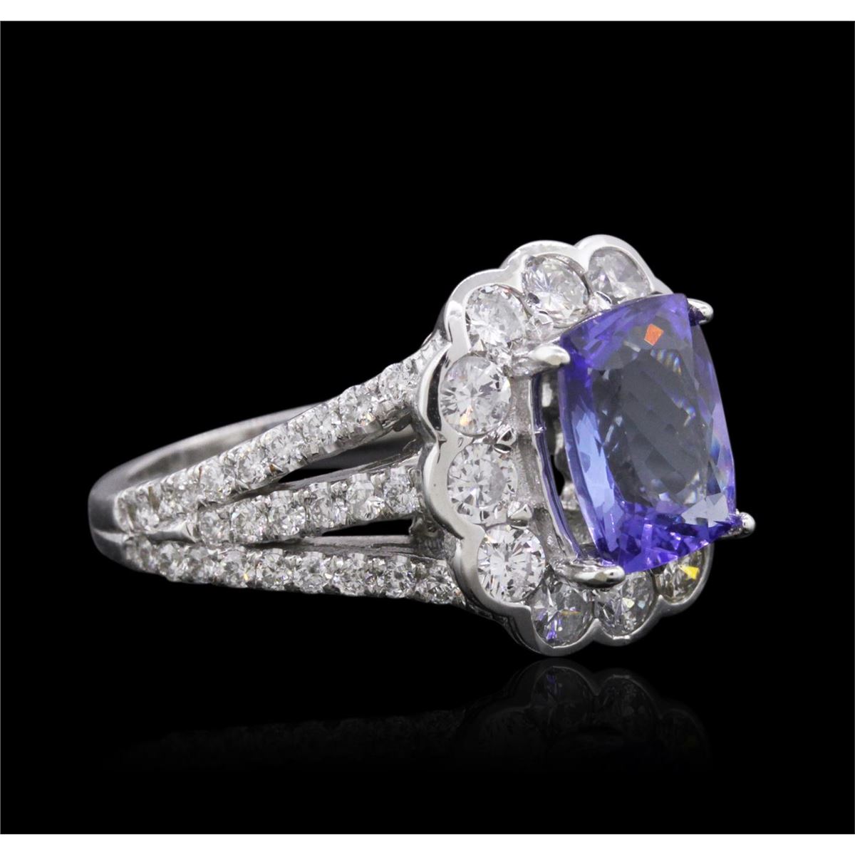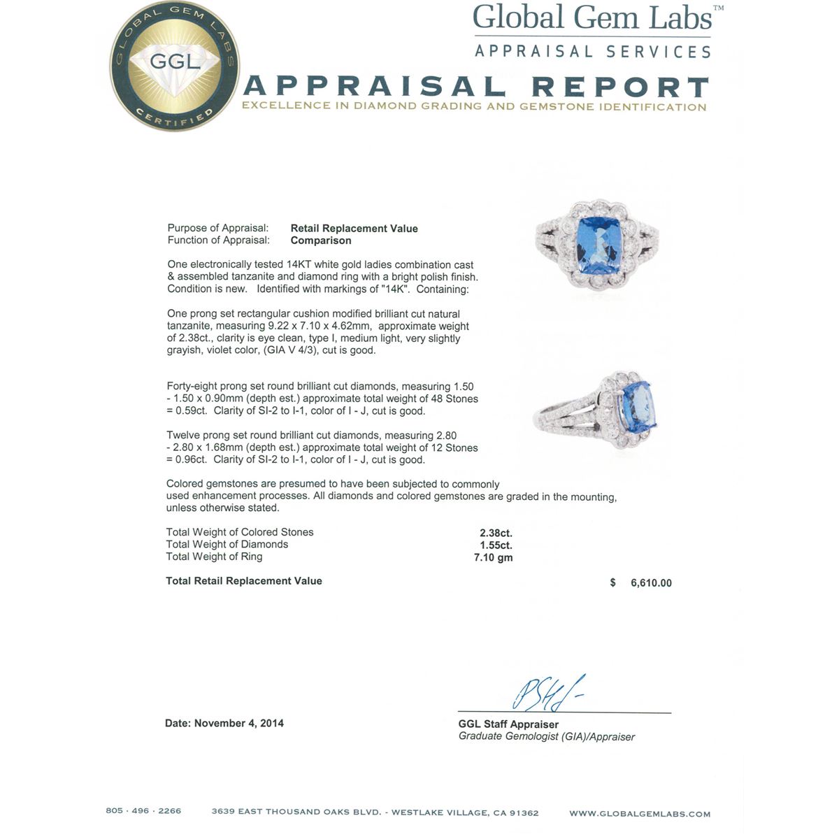 One electronically tested 14KT white gold ladies combination cast & assembled tanzanite and diamond ring with a bright polish finish. Identified with markings of "14K". Condition is new. Containing: One prong set rectangular cushion modified brilliant cut natural tanzanite, measuring 9.22 x 7.10 x 4.62mm, approximate weight of 2.38ct., clarity is eye clean, type I, medium light, very slightly grayish, violet color, (GIA V 4/3), cut is good. Forty-Eight prong set round brilliant cut diamonds, measuring 1.50 - 1.50 x 0.90mm (depth est.) approximate total weight of 48 Stones = 0.59ct. Clarity: SI-2 to I-1. Color: I - J, Cut is Good. Twelve prong set round brilliant cut diamonds, measuring 2.80 - 2.80 x 1.68mm (depth est.) approximate total weight of 12 Stones = 0.96ct. Clarity: SI-2 to I-1. Color: I - J, Cut is Good. Colored gemstones are presumed to have been subjected to commonly used enhancement processes. All diamonds and colored gemstones are graded in the mounting, unless otherwise stated. Total Weight of Colored Stones 2.38ct. Total Weight of Diamonds 1.55ct. Total Weight of Ring 7.10 grams. GGL Appraised at $6,610.00.