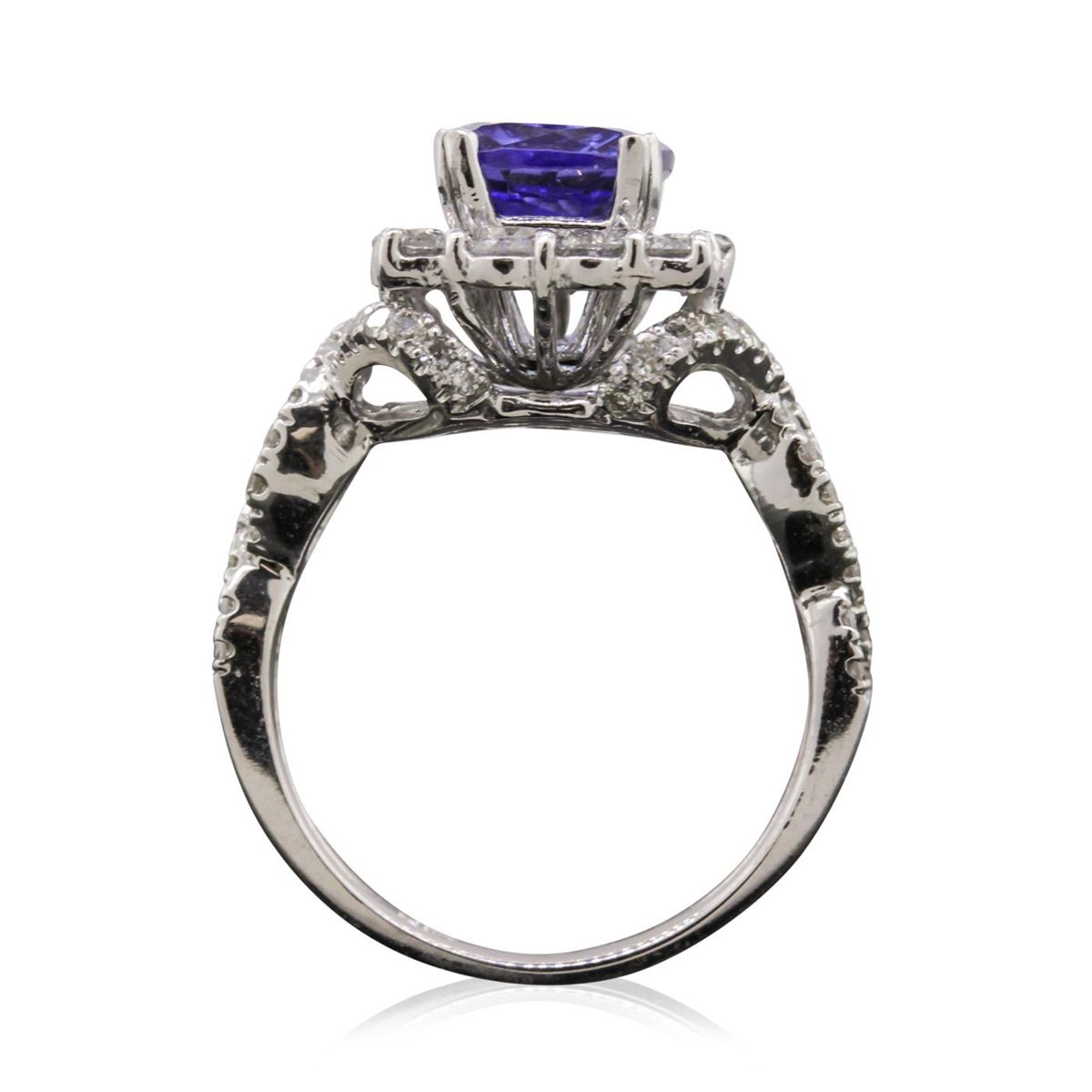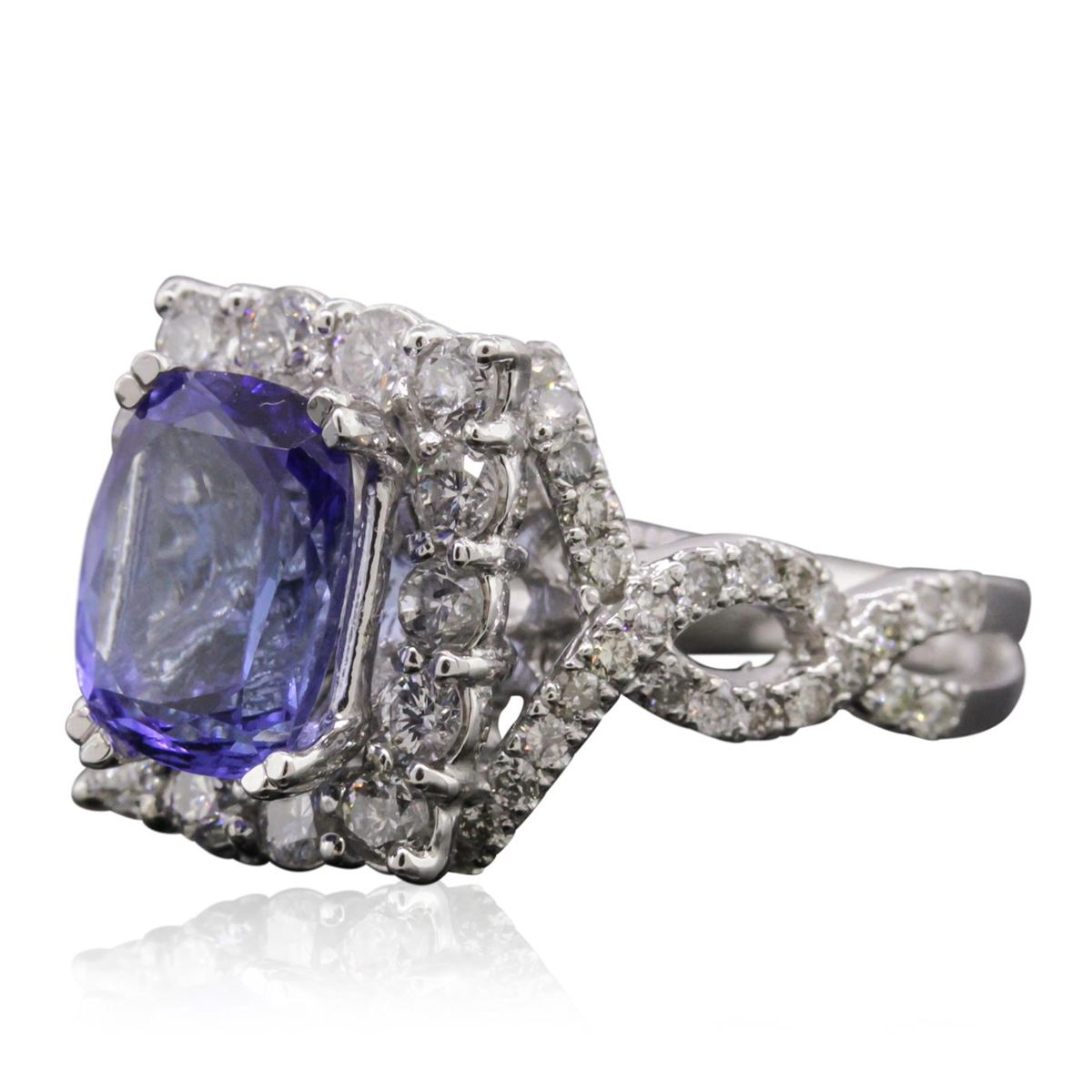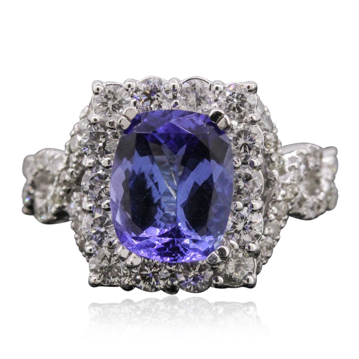 One electronically tested 14KT white gold Ladies combination cast & assembled ring with a bright polish finish. Condition is new. Identified with markings of "14K". Containing: One prong set rectangular cushion modified brilliant cut natural tanzanite, measuring 9.60 x 7.70 x 4.09mm, approximate weight of 2.38ct., clarity is eye clean, type I, medium light, very slightly grayish, bluish violet color, (GIA bV 4/3), cut is good. Colored gemstones are presumed to have been subjected to commonly used color/clarity enhancement processes. Seventy-Four prong set round brilliant cut diamonds, measuring 2.40 - 1.80 x 1.26mm (depth est.) approximate. Total Weight of 74 Stones = 1.05ct. Clarity: I-1 to I-2. Color: I - J, Cut is Good. Total Weight of Colored Stones 2.38ct. Total Weight of Diamonds 1.05ct. Total Weight of Ring 7.70 grams. GGL Appraised at $8,550.00.