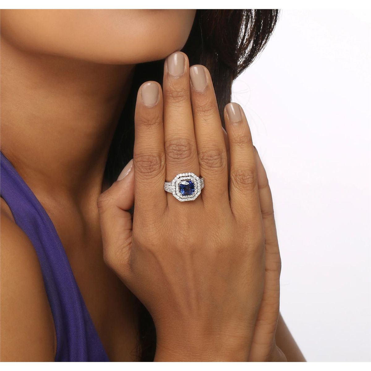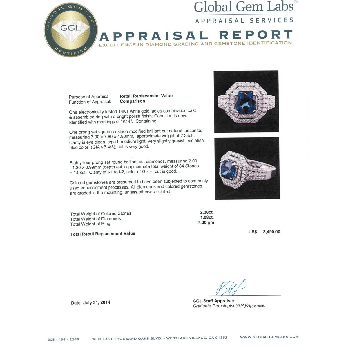 One electronically tested 14KT white gold ladies combination cast & assembled ring with a bright polish finish. Condition is new. Identified with markings of "K14". Containing: One prong set square cushion modified brilliant cut natural tanzanite, measuring 7.90 x 7.80 x 4.90mm, approximate weight of 2.38ct., clarity is eye clean, type I, medium light, very slightly grayish, violetish blue color, (GIA vB 4/3), cut is very good. Eighty-Four prong set round brilliant cut diamonds, measuring 2.00 - 1.30 x 0.99mm (depth est.) approximate. Total Weight of 84 Stones = 1.08ct. Clarity: I-1 to I-2. Color: G - H, Cut is Good. Colored gemstones are presumed to have been subjected to commonly used enhancement processes. All diamonds and colored gemstones are graded in the mounting, unless otherwise stated. Total Weight of Colored Stones 2.38ct. Total Weight of Diamonds 1.08ct. Total Weight of Ring 7.30 grams. GGL Appraised at $8,490.00.