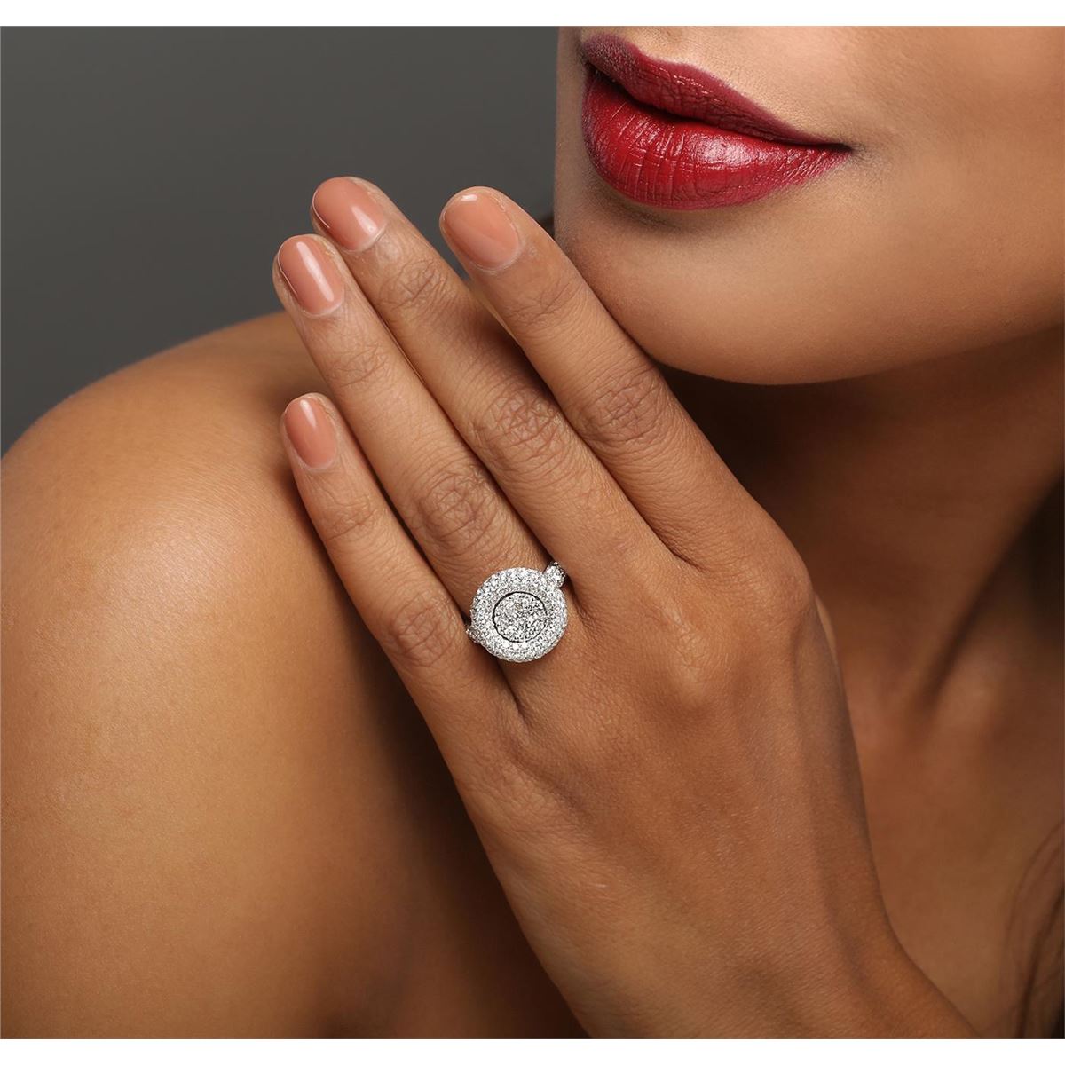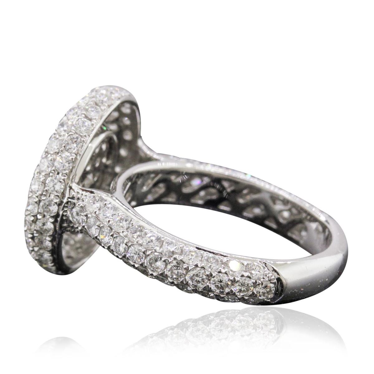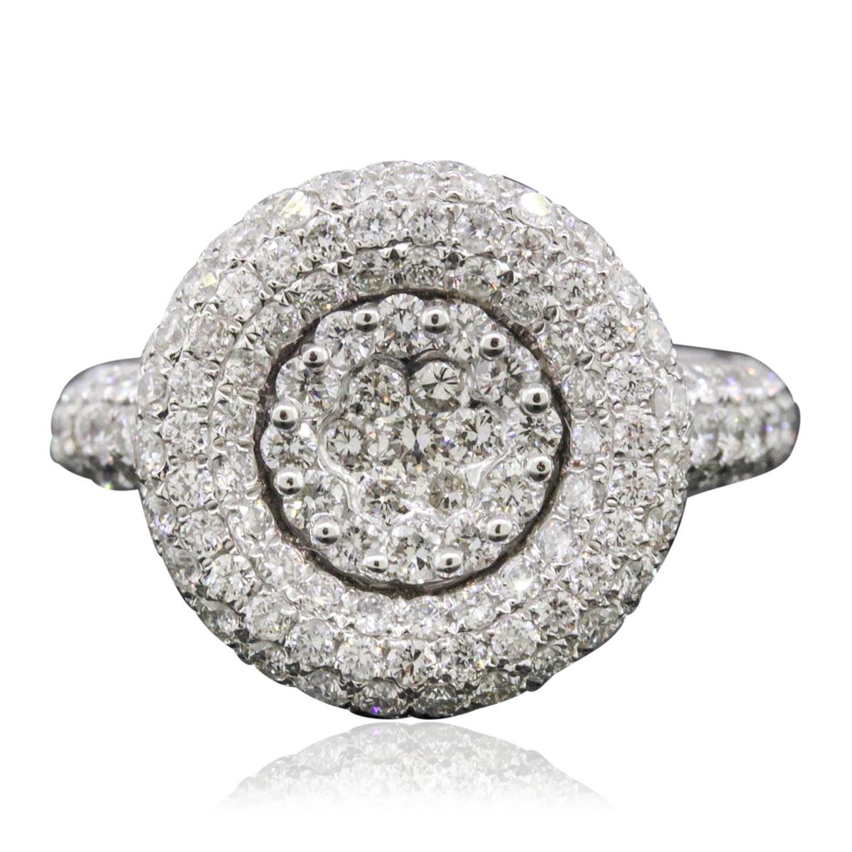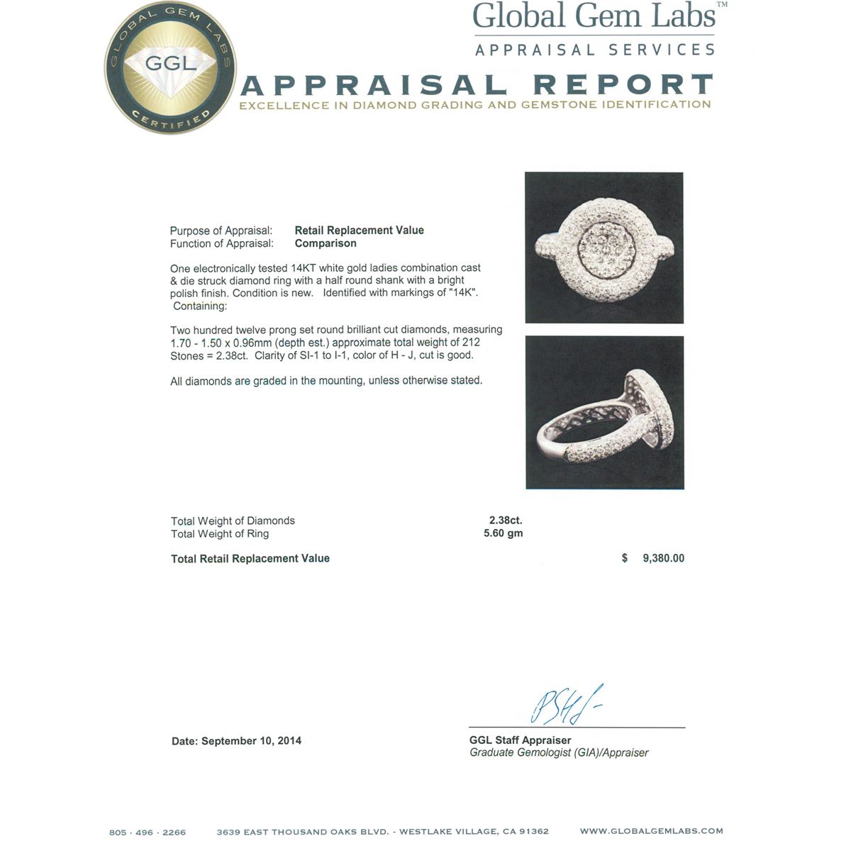 One electronically tested 14KT white gold ladies combination cast & die struck diamond ring with a half round shank with a bright polish finish. Identified with markings of "14K". Condition is new. Containing: Two Hundred Twelve prong set round brilliant cut diamonds, measuring 1.70 - 1.50 x 0.96mm (depth est.) approximate total weight of 212 Stones = 2.38ct. Clarity: SI-1 to I-1. Color: H - J, Cut is Good. All diamonds are graded in the mounting, unless otherwise stated. Total Weight of Diamonds 2.38ct. Total Weight of Ring 5.60 grams. GGL Appraised at $9,380.00.