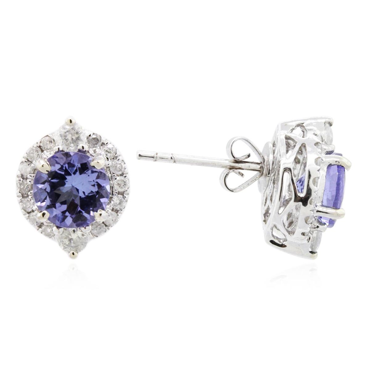 One pair electronically tested 14KT white gold ladies cast & assembled tanzanite and diamond earrings with standard backs. Bright polish finish. Trademark is Orianne. Identified with markings of "14K". Condition is new, good workmanship. Containing: Two prong set round brilliant cut natural tanzanites, measuring 6.50 - 6.40 x 4.19 mm, approximate total weight of 2.38ct., clarity is eye clean, type I, medium, very slightly grayish, bluish violet color, (GIA bV 5/3), cut is good. Transmitting light with no distortion, transparent. The color grade is an average for the pair. Graded in the setting. Tanzanite is a very rare gemstone that is only found in the country of Tanzania. Originally discovered in 1967. Tiffany & Company, named the stone Tanzanite. It is found in the Usumburu Mountains that border the Umba Valley of northern Tanzania. Tanzanite occurs in gray, brown, violet, blue, reddish-purple, & green. The gem is interesting because of its exceptional pleochroism. Rotated in different directions a tanzanite will exhibit multiple changes of color. Tanzanite has a low tolerance to ultrasonic cleaning, and should not be cleaned using this method. Four prong set round brilliant cut diamonds, measuring 2.60 - 2.50 x 1.53mm (depth est.) approximate total weight of 4 Stones = 0.30ct. Graded in the setting. Clarity: I-1 to I-2. Color: H - I Twenty-Eight prong set round brilliant cut diamonds, measuring 1.50 - 1.40 x 0.87mm (depth est.) approximate total weight of 28 Stones = 0.40ct. Graded in the setting. Clarity: I-1 to I-3. Color: H - J. Total Weight of Colored Stones 2.38ct. Total Weight of Diamonds 0.70ct. Total Weight of Earrings 3.33gm. AIG Appraised at $5,255.00.