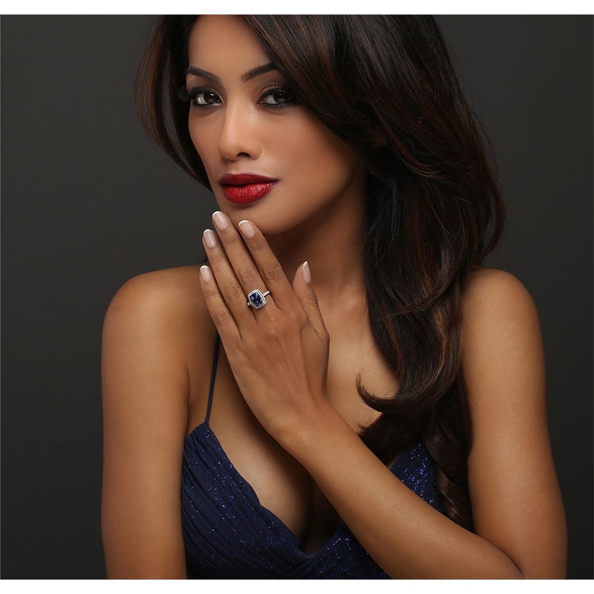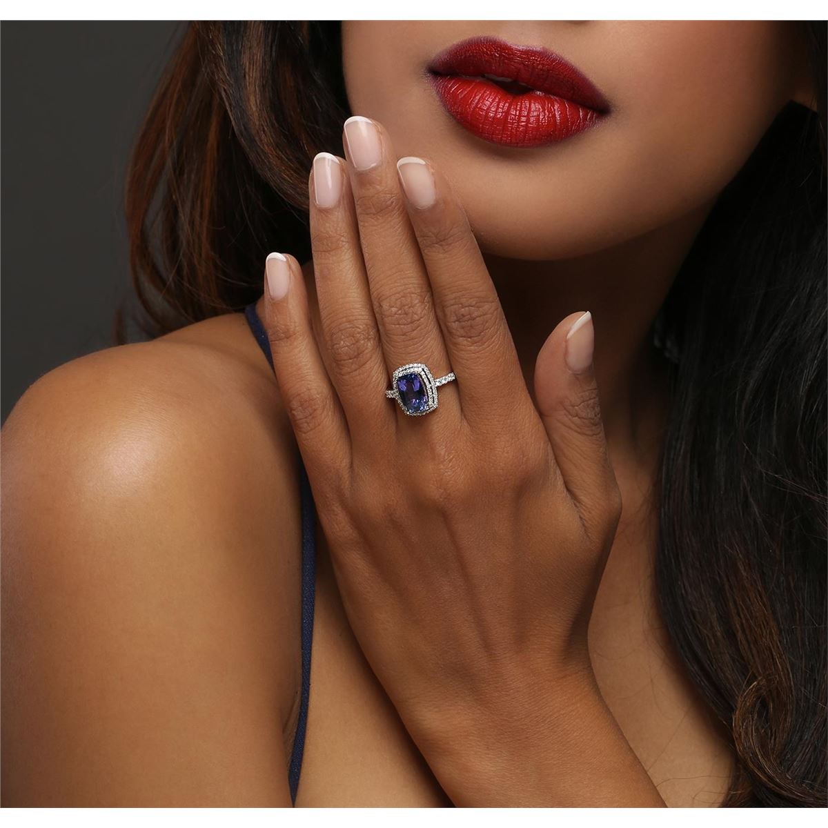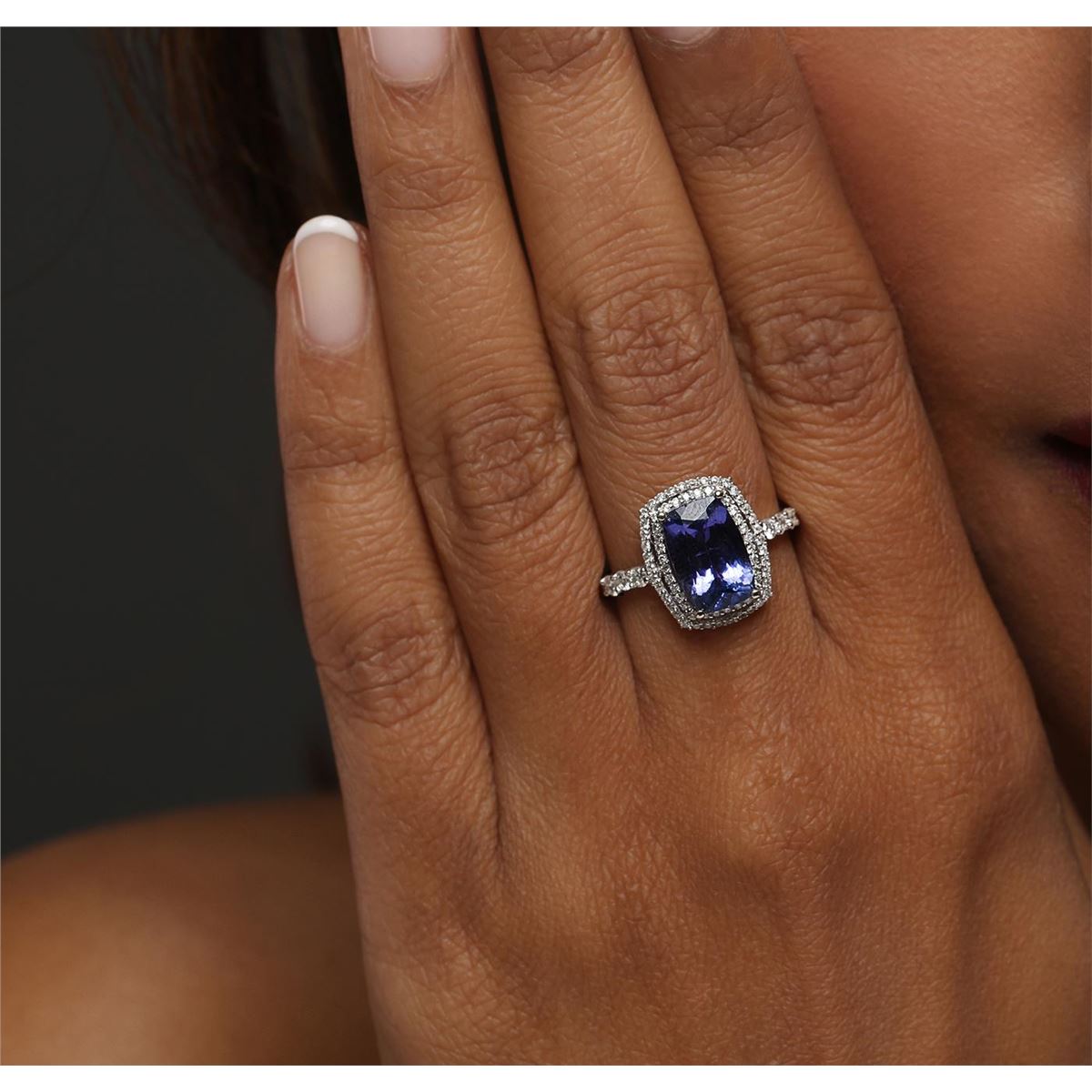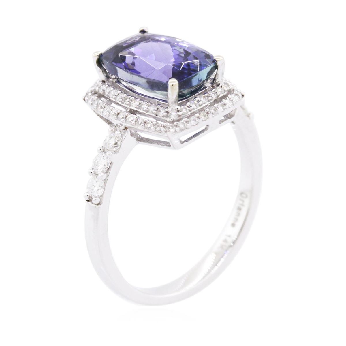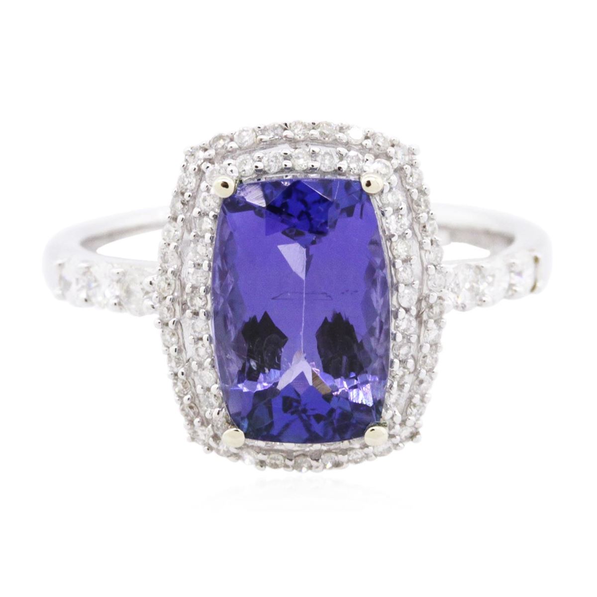 One electronically tested 14KT white gold ladies combination cast & assembled tanzanite and diamond ring with a flat shank with a bright polish finish. Identified with markings of "14K". Condition is new. Containing: One prong set rectangular cushion modified brilliant cut natural tanzanite, measuring 10.20 x 6.90 x 4.32mm, approximate weight of 2.39ct., clarity is eye clean, type I, medium, very slightly grayish, violet color, (GIA V 5/3), cut is good. Six prong set round brilliant cut diamonds, measuring 1.80 - 1.80 x 1.08mm (depth est.) approximate total weight of 6 Stones = 0.13ct. Clarity: SI-2 to I-2. Color: I - J, Cut is Good. Seventy-Two prong set round brilliant cut diamonds, measuring 1.10 - 1.10 x 0.66mm (depth est.) approximate total weight of 72 Stones = 0.35ct. Clarity: I-1 to I-2. Color: I - J, Cut is Good. Colored gemstones are presumed to have been subjected to commonly used enhancement processes. All diamonds and colored gemstones are graded in the mounting, unless otherwise stated. Total Weight of Colored Stones 2.39ct. Total Weight of Diamonds 0.47ct. Total Weight of Ring 3.40 grams. GGL Appraised at $6,105.00.