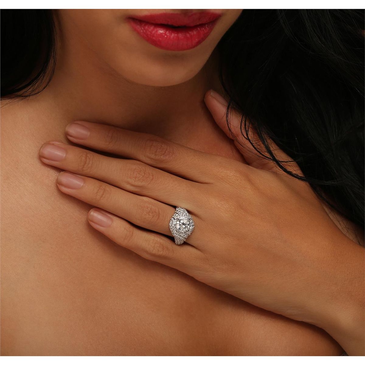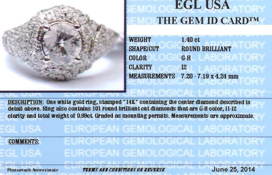 One electronically tested 14KT white gold Ladies combination cast & assembled engagement ring with a bright polish finish. Condition is new. Identified with markings of "14K". Containing: One prong set round brilliant cut diamond, measuring 7.20 - 7.19 x 4.24mm (depth est.) approximate weight of 1.40ct. Clarity: I-2. Color: G, Cut is Good. One Hundred One prong set round brilliant cut diamonds, measuring 1.30 - 1.30 x 0.78mm (depth est.) approximate. Total Weight of 101 Stones = 0.99ct. Clarity: I-1 to I-2. Color: G - H, Cut is Good. EGL USA GEM ID# US 911348423D. All diamonds are graded in the mounting, unless otherwise stated. Total Weight of Diamonds 2.39ct. Total Weight of Engagement Ring 5.20 grams. GGL Appraised at $16,145.00.