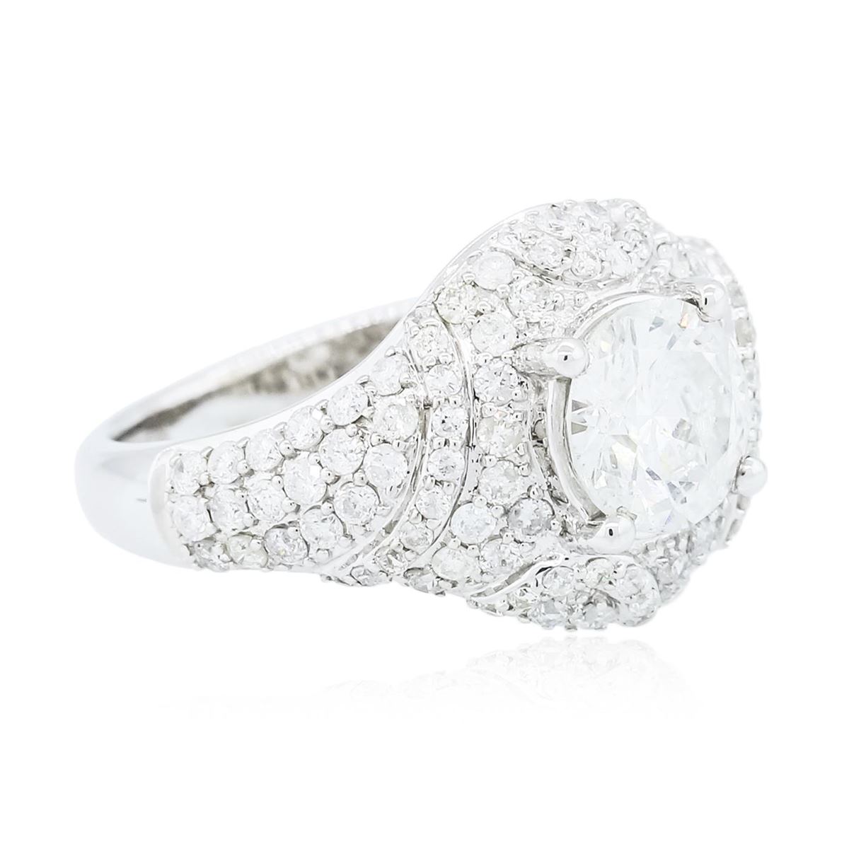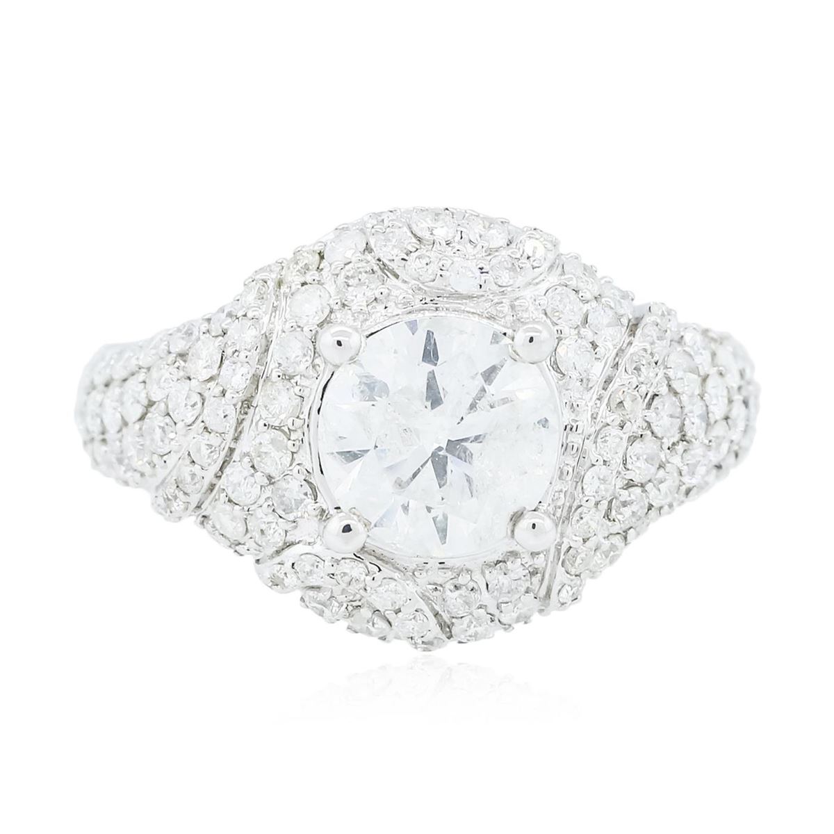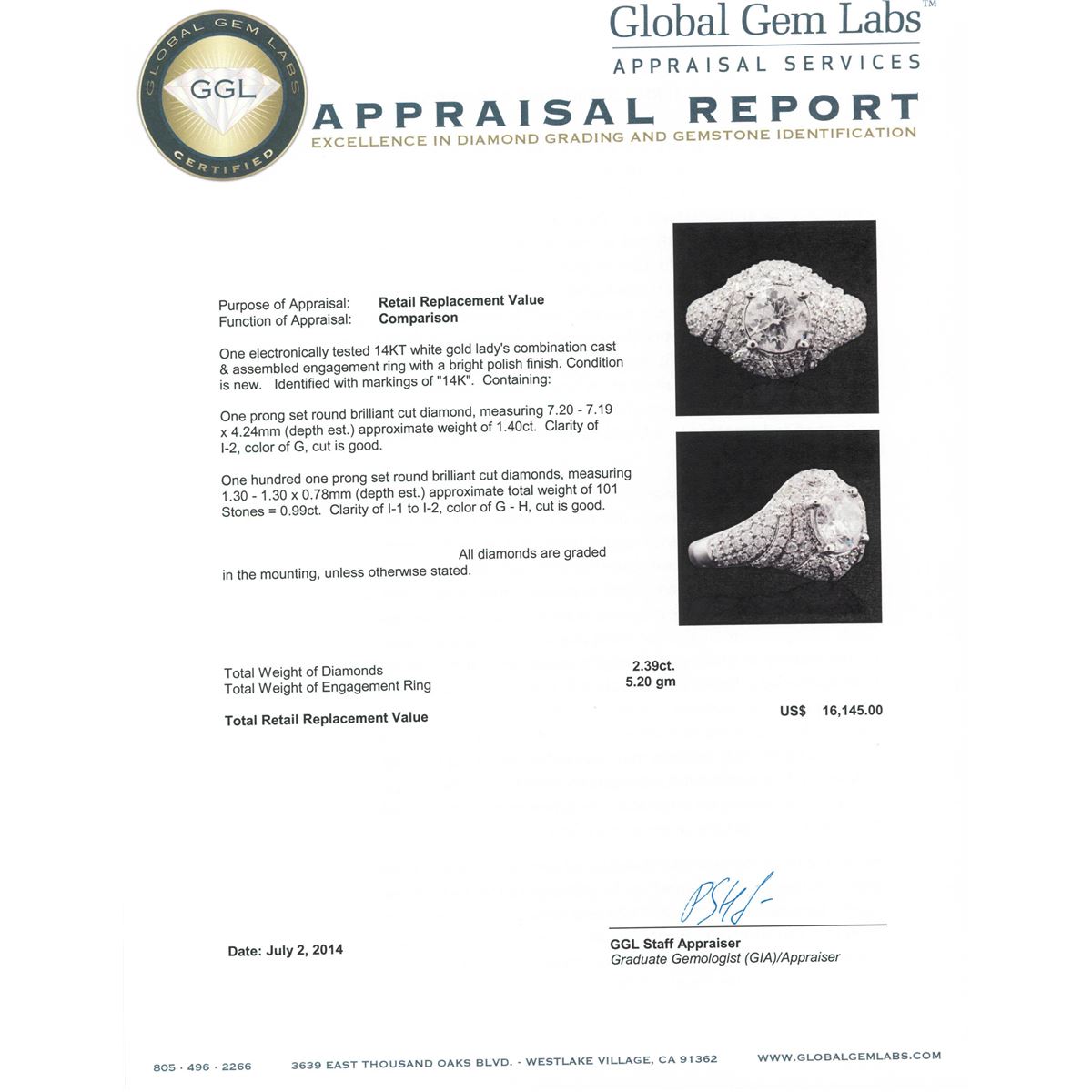 One electronically tested 14KT white gold Ladies combination cast & assembled engagement ring with a bright polish finish. Condition is new. Identified with markings of "14K". Containing: One prong set round brilliant cut diamond, measuring 7.20 - 7.19 x 4.24mm (depth est.) approximate weight of 1.40ct. Clarity: I-2. Color: G, Cut is Good. One Hundred One prong set round brilliant cut diamonds, measuring 1.30 - 1.30 x 0.78mm (depth est.) approximate. Total Weight of 101 Stones = 0.99ct. Clarity: I-1 to I-2. Color: G - H, Cut is Good. EGL USA GEM ID# US 911348423D. All diamonds are graded in the mounting, unless otherwise stated. Total Weight of Diamonds 2.39ct. Total Weight of Engagement Ring 5.20 grams. GGL Appraised at $16,145.00.