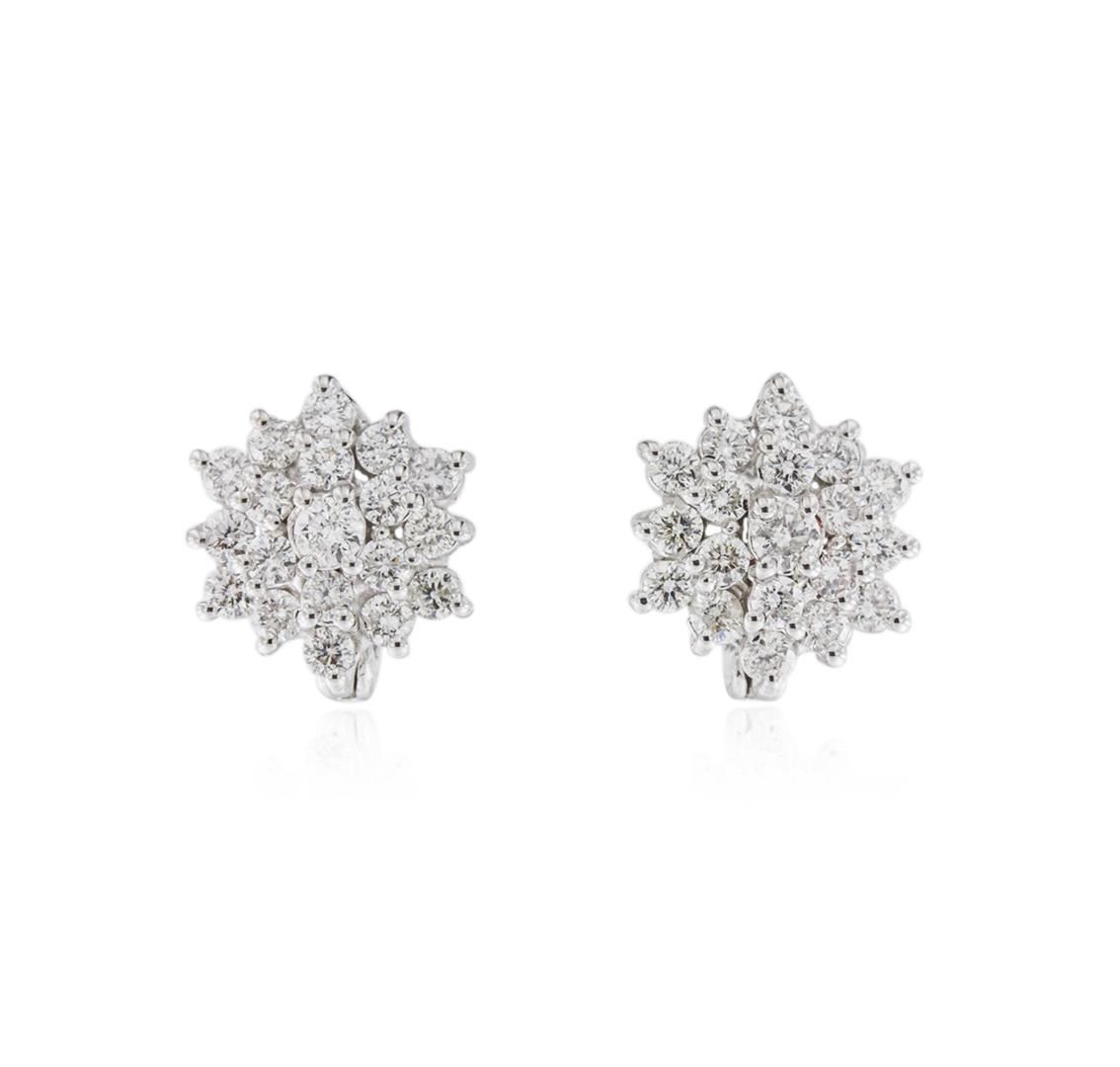 One pair electronically tested 14KT white gold ladies cast diamond earrings with hinged clip backs with a bright polish finish. Identified with markings of "14K". Condition is new. Containing: Thirty-Eight prong set round brilliant cut diamonds, measuring 3.50 - 2.50 x 1.80mm (depth est.) approximate total weight of 38 Stones = 2.40ct. Clarity: SI-1 to SI-2. Color: J, Cut is Good. All diamonds are graded in the mounting, unless otherwise stated. Total Weight of Diamonds 2.40ct. Total Weight of Earrings 7.50 grams. GGL Appraised at $5,975.00.