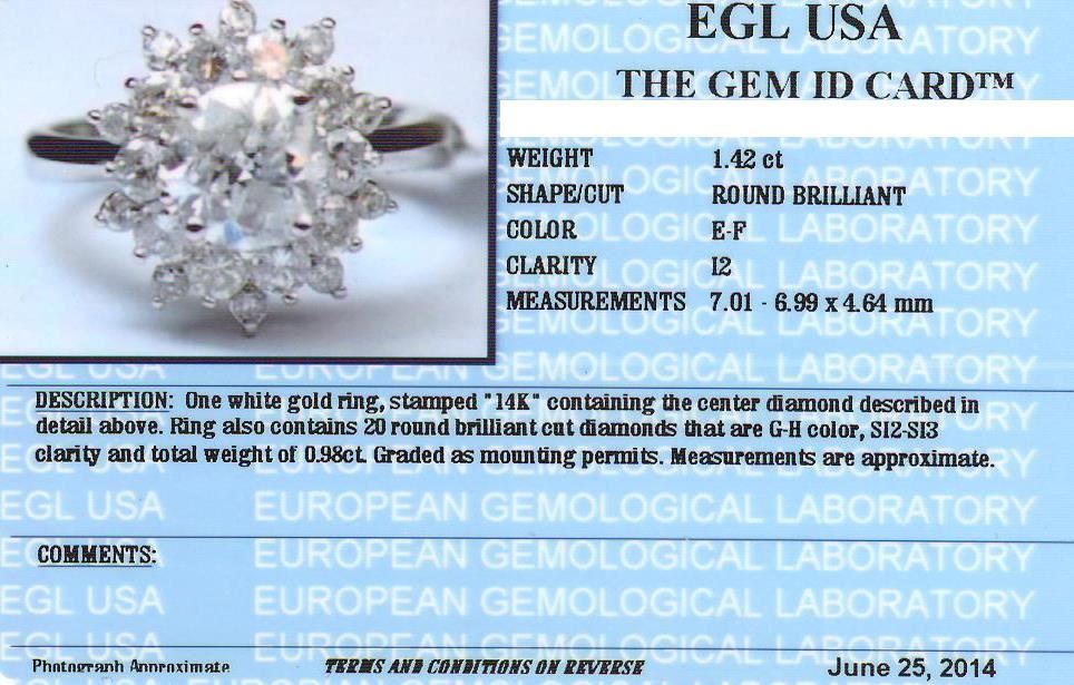 One electronically tested 14KT white gold Ladies combination cast & assembled engagement ring with a bright polish finish. Condition is new. Identified with markings of "14K". Containing: One prong set round brilliant cut diamond, measuring 7.01 - 6.99 x 4.64mm (depth est.) approximate. Total Weight of 1.42ct. Clarity: I-2. Color: E, Cut is Good. Twenty prong set round brilliant cut diamonds, measuring 2.30 - 2.30 x 1.38mm (depth est.) approximate. Total Weight of 20 Stones = 0.98ct. Clarity: SI-2 to SI-3. Color: G - H, Cut is Good. EGL USA GEM ID# US 911348429D. All diamonds are graded in the mounting, unless otherwise stated. Total Weight of Diamonds 2.40ct. Total Weight of Engagement Ring 4.40 grams. GGL Appraised at $19,315.00.