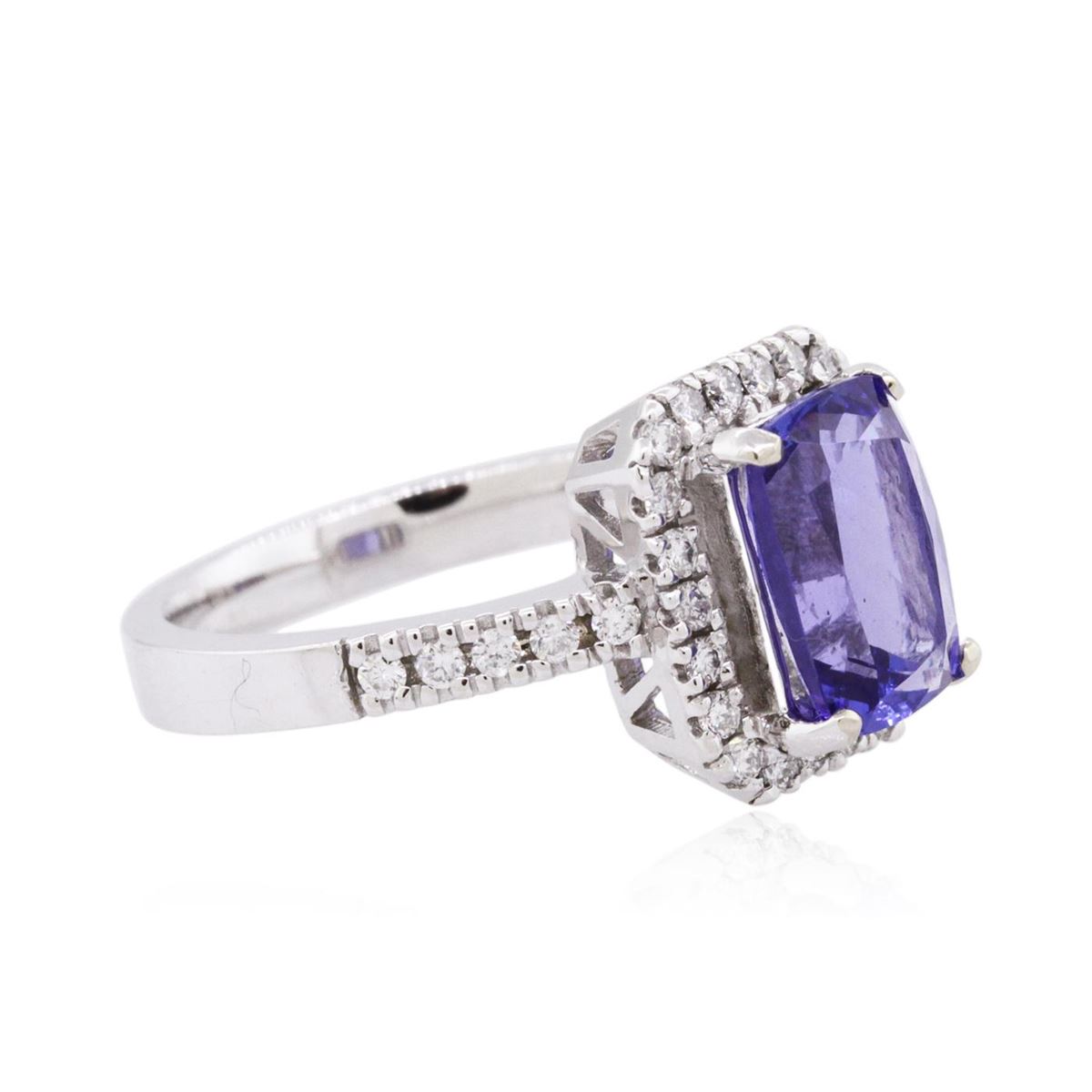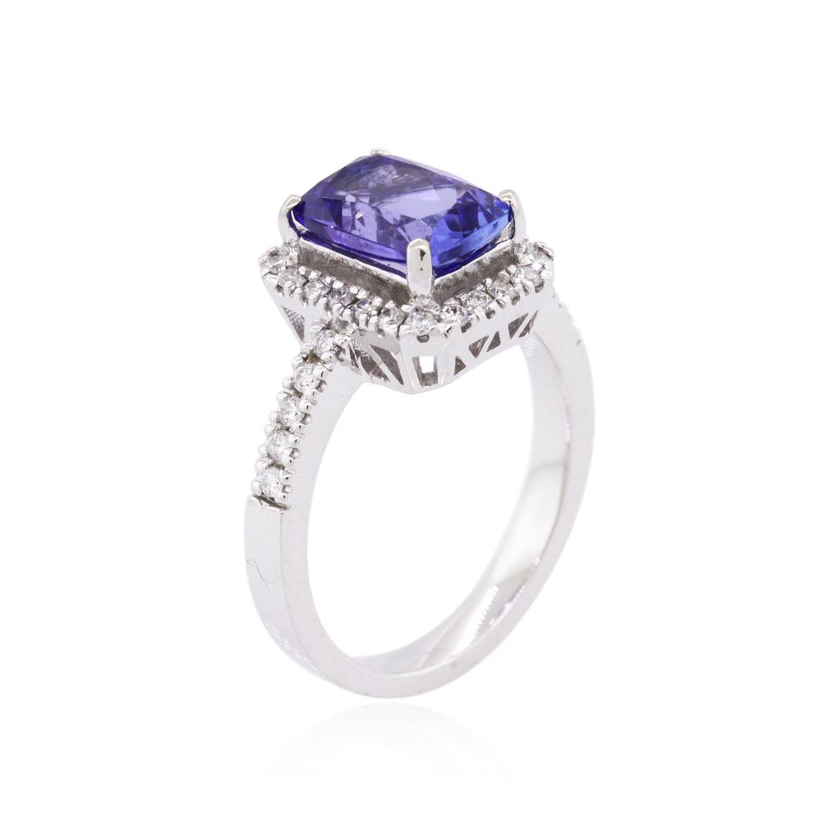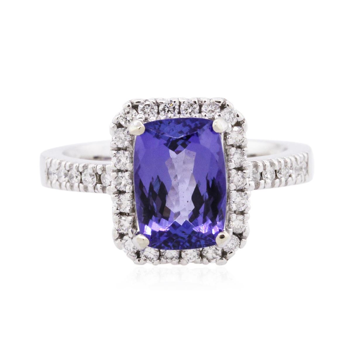 One electronically tested 14KT white gold ladies combination cast & assembled tanzanite and diamond ring with a flat shank with a bright polish finish. Identified with markings of "K14". Condition is new. Containing: One prong set rectangular cushion modified brilliant cut natural tanzanite, measuring 9.74 x 6.83 x 4.58mm, approximate weight of 2.40ct., clarity is eye clean, type I, medium, moderately strong, violet color, (GIA V 5/4), cut is good. Thirty-Two prong set round brilliant cut diamonds, measuring 1.50 - 1.40 x 0.87mm (depth est.) approximate total weight of 32 Stones = 0.36ct. Clarity: I-1 to I-2. Color: H - I, Cut is Good. Colored gemstones are presumed to have been subjected to commonly used enhancement processes. All diamonds and colored gemstones are graded in the mounting, unless otherwise stated. Total Weight of Colored Stones 2.40ct. Total Weight of Diamonds 0.36ct. Total Weight of Ring 5.50 grams. GGL Appraised at $5,830.00.