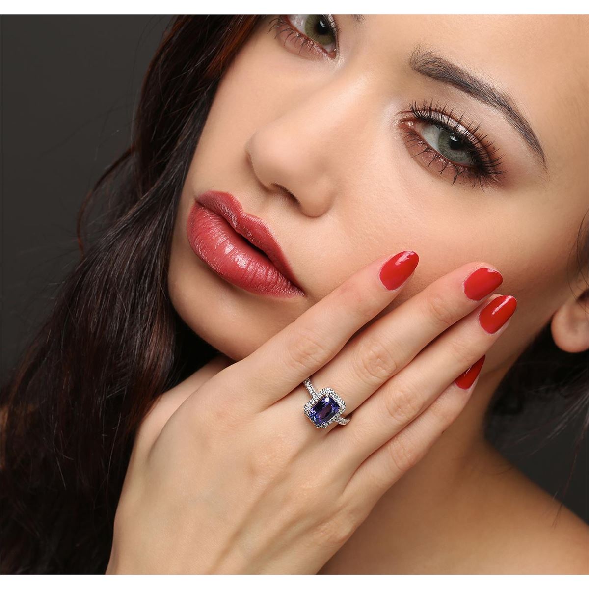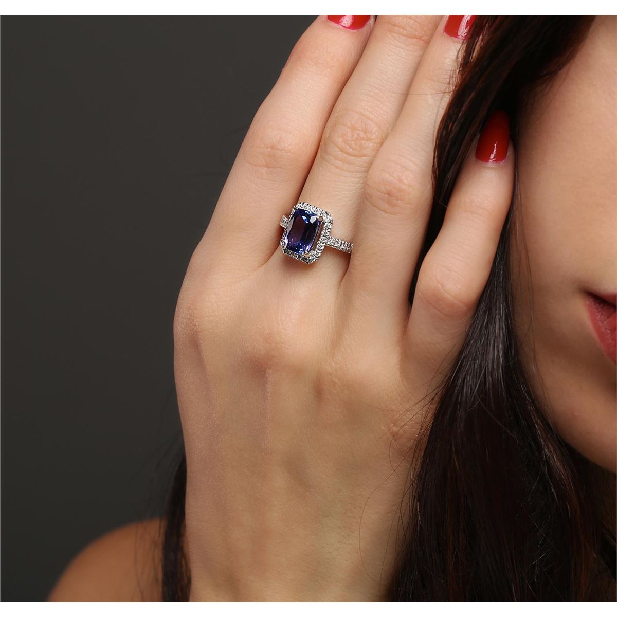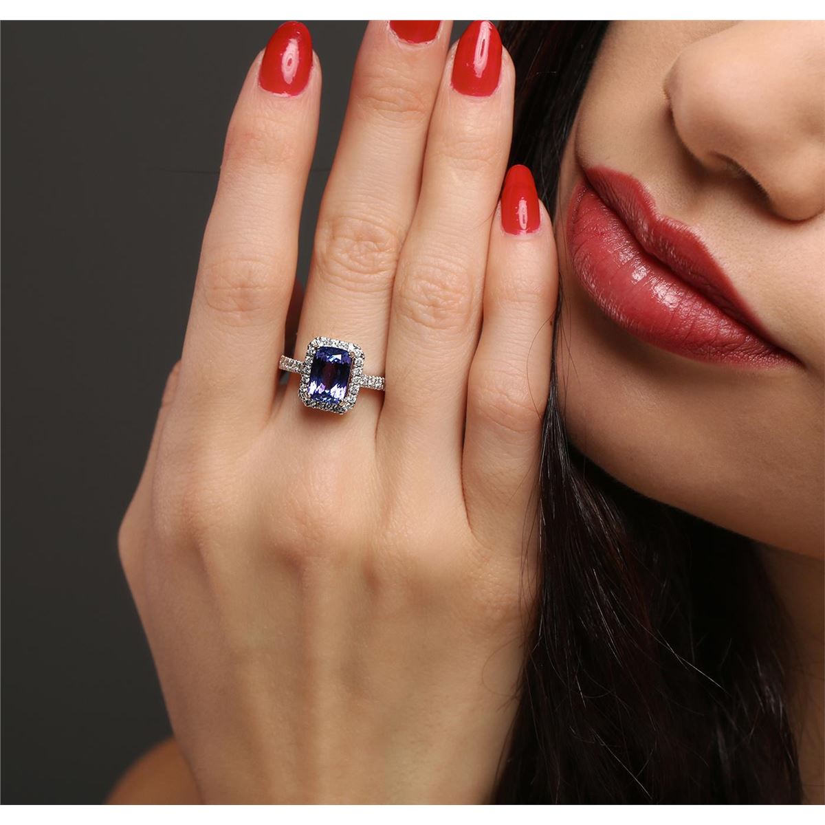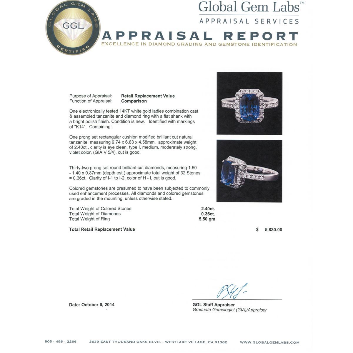 One electronically tested 14KT white gold ladies combination cast & assembled tanzanite and diamond ring with a flat shank with a bright polish finish. Identified with markings of "K14". Condition is new. Containing: One prong set rectangular cushion modified brilliant cut natural tanzanite, measuring 9.74 x 6.83 x 4.58mm, approximate weight of 2.40ct., clarity is eye clean, type I, medium, moderately strong, violet color, (GIA V 5/4), cut is good. Thirty-Two prong set round brilliant cut diamonds, measuring 1.50 - 1.40 x 0.87mm (depth est.) approximate total weight of 32 Stones = 0.36ct. Clarity: I-1 to I-2. Color: H - I, Cut is Good. Colored gemstones are presumed to have been subjected to commonly used enhancement processes. All diamonds and colored gemstones are graded in the mounting, unless otherwise stated. Total Weight of Colored Stones 2.40ct. Total Weight of Diamonds 0.36ct. Total Weight of Ring 5.50 grams. GGL Appraised at $5,830.00.
