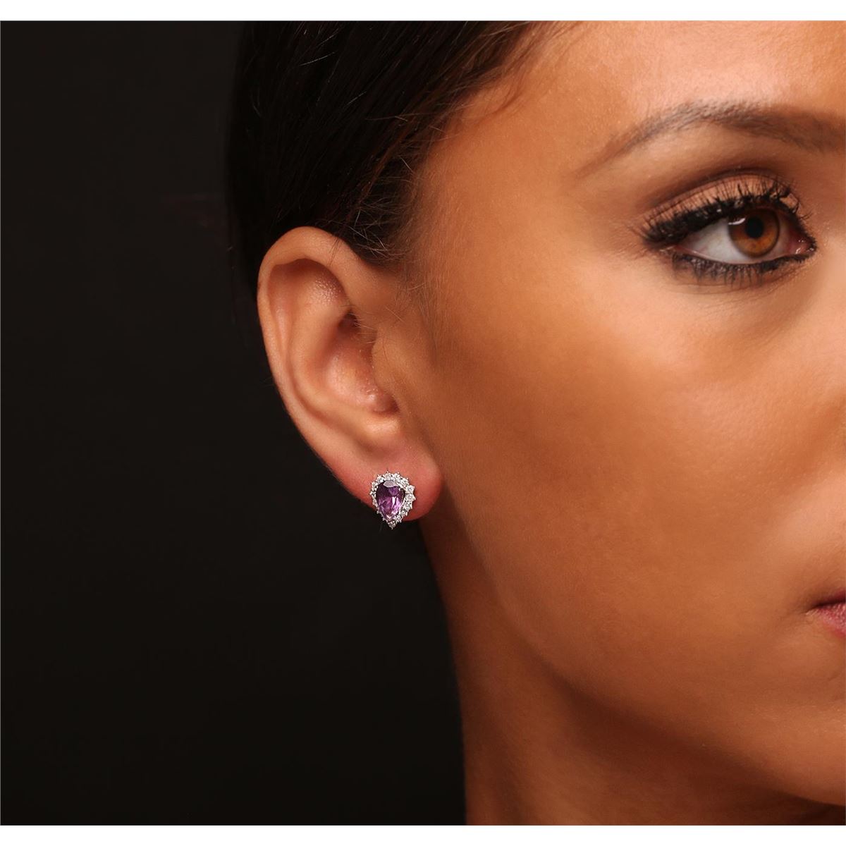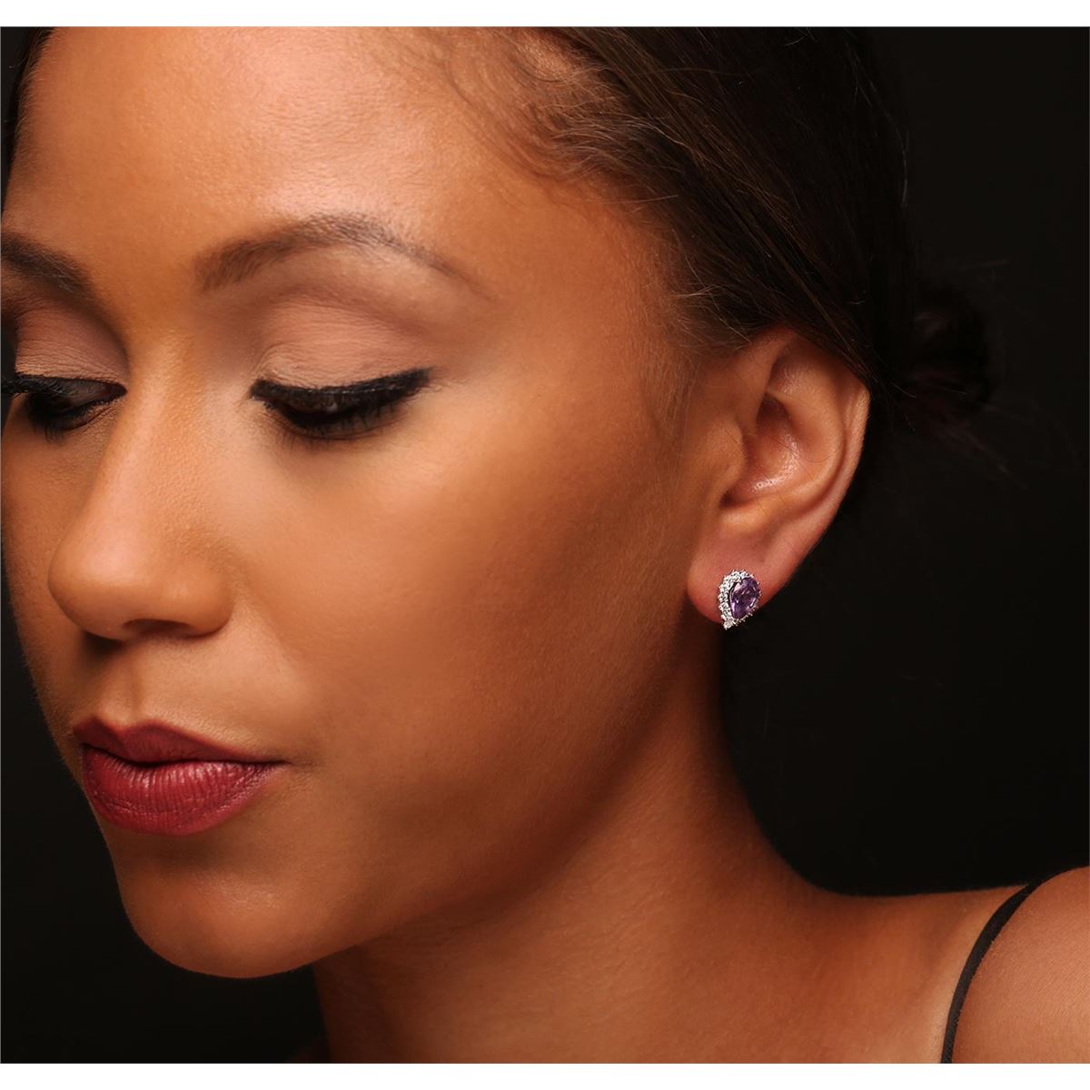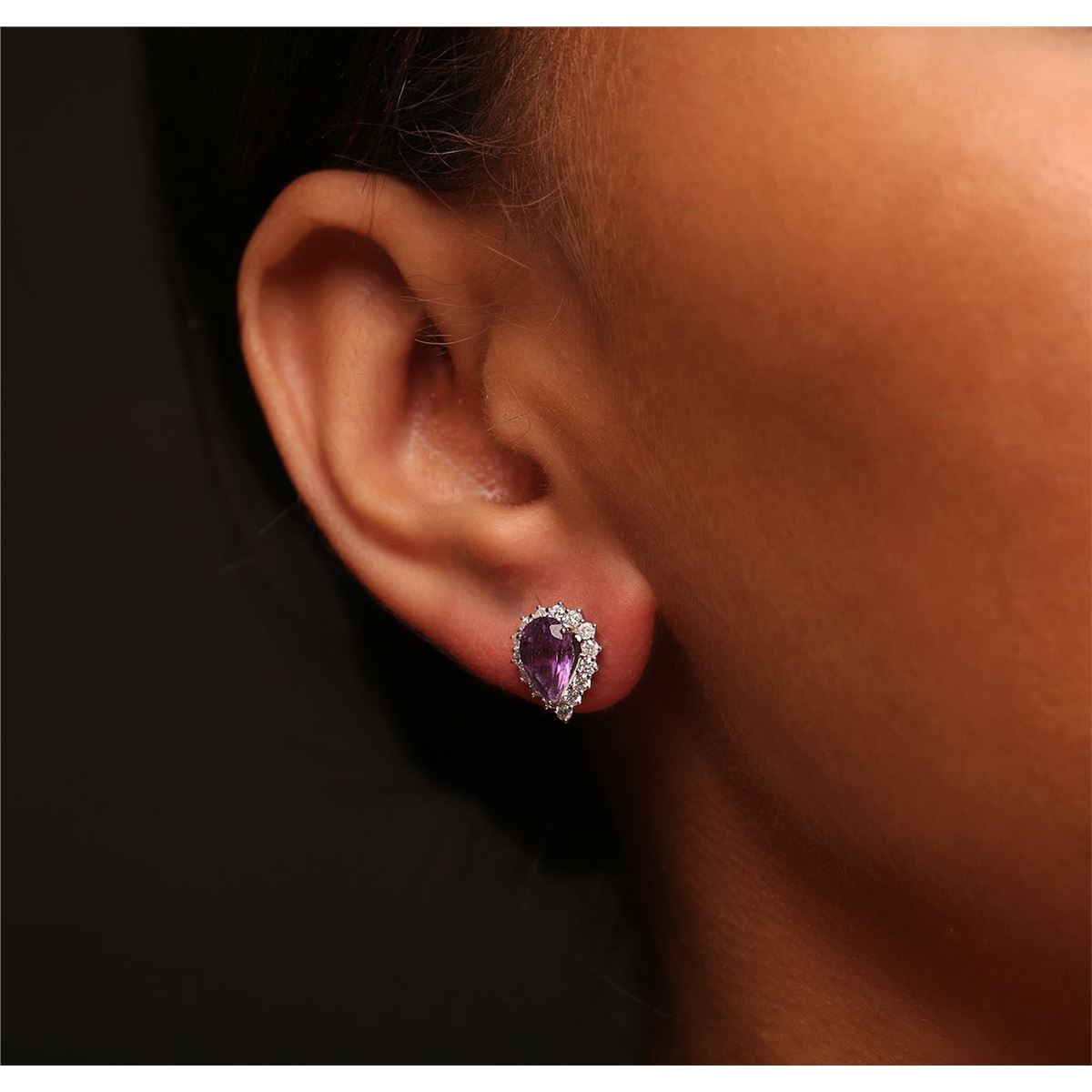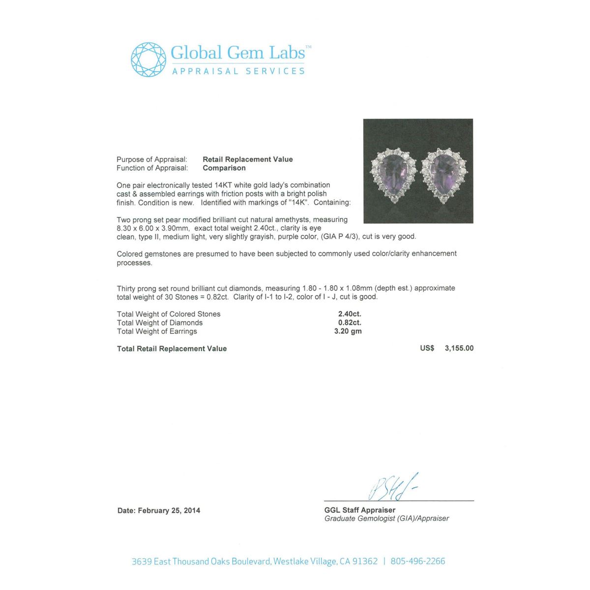 One pair electronically tested 14KT white gold Ladies combination cast & assembled earrings with friction posts with a bright polish finish. Condition is new. Identified with markings of "14K". Containing: Two prong set pear modified brilliant cut natural amethysts, measuring 8.30 x 6.00 x 3.90mm, exact total weight 2.40ct., clarity is eye clean, type II, medium light, very slightly grayish, purple color, (GIA P 4/3), cut is very good. Colored gemstones are presumed to have been subjected to commonly used color/clarity enhancement processes. Thirty prong set round brilliant cut diamonds, measuring 1.80 - 1.80 x 1.08mm (depth est.) approximate. Total Weight of 30 Stones = 0.82ct. Clarity: I-1 to I-2. Color: I - J, Cut is Good.. Total Weight of Colored Stones 2.40ct. Total Weight of Diamonds 0.82ct. Total Weight of Earrings 3.20 grams. GGL Appraised at $3,155.00.