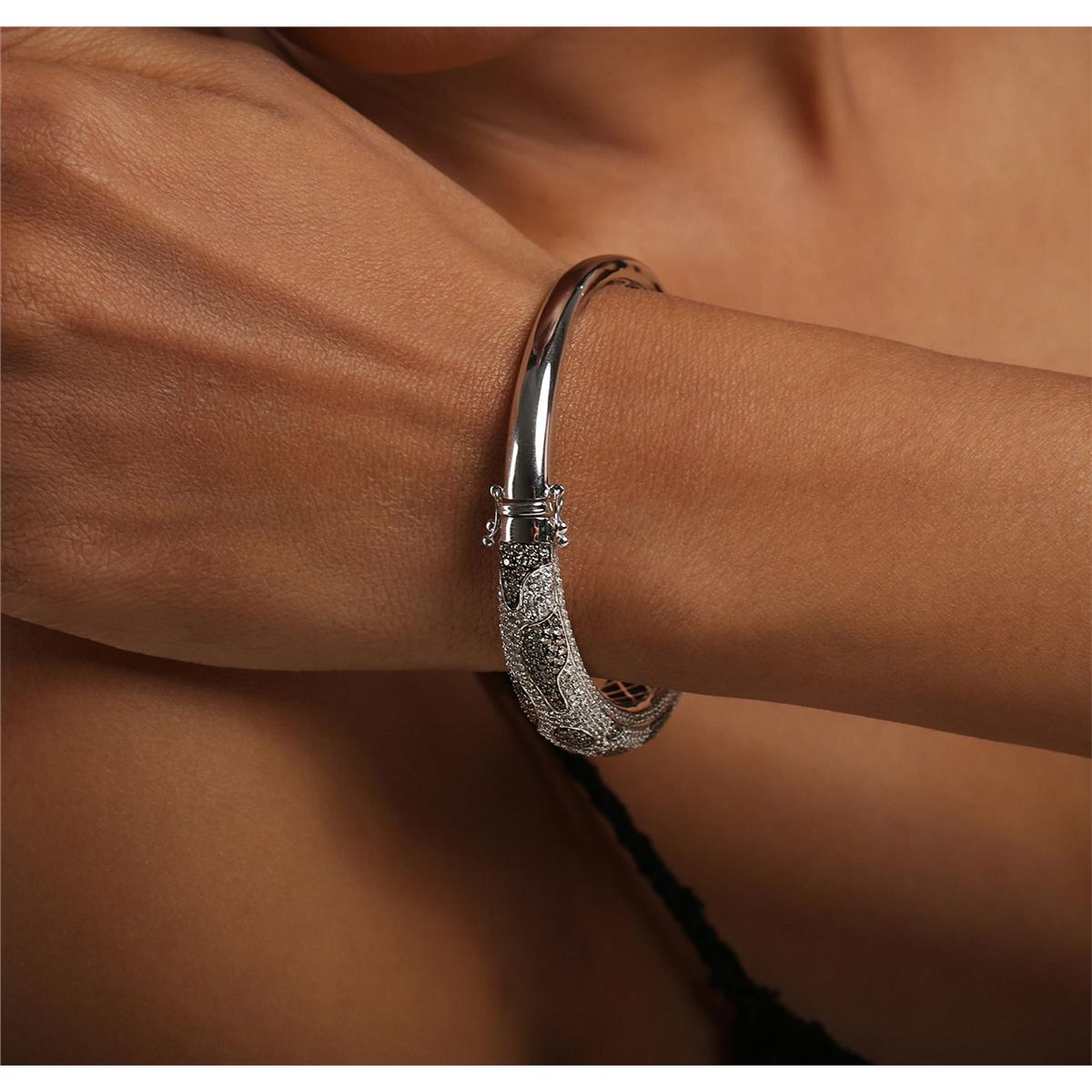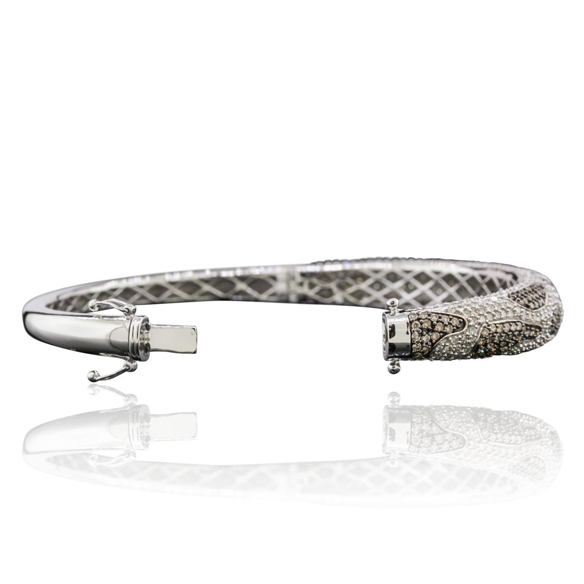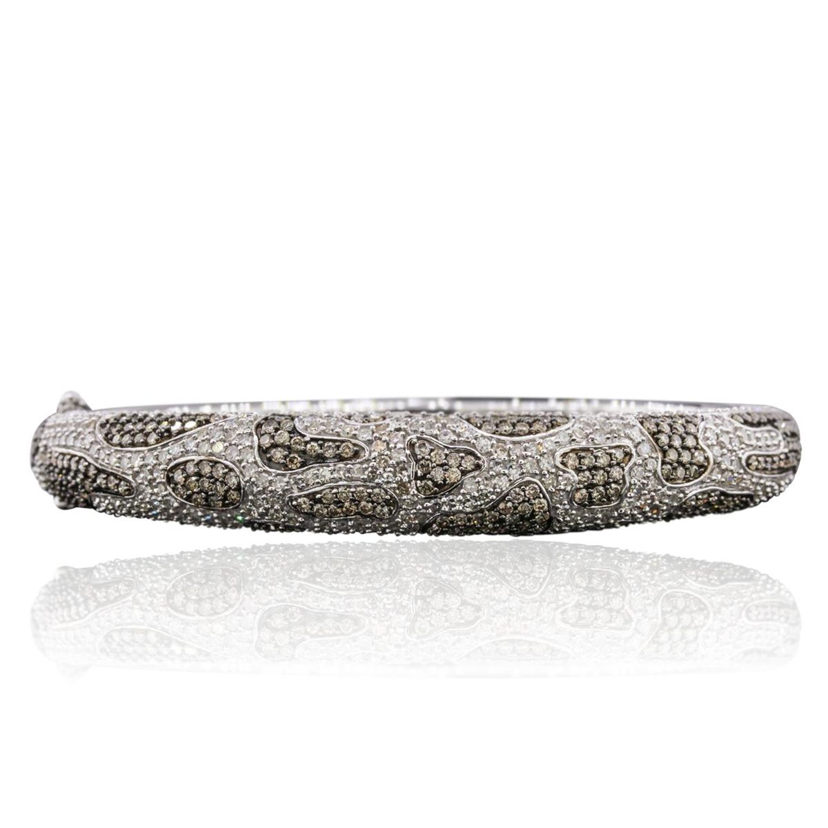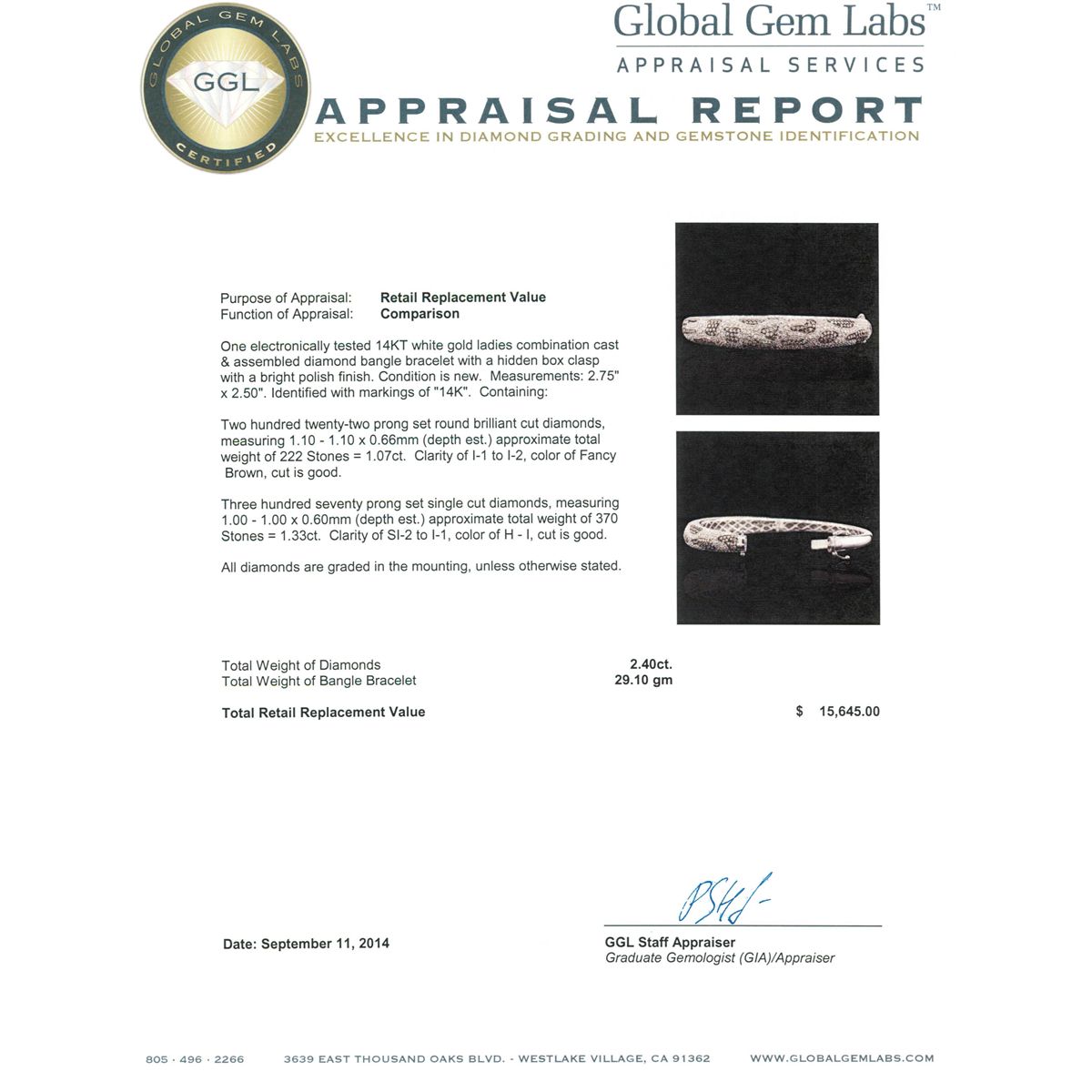 One electronically tested 14KT white gold ladies combination cast & assembled diamond bangle bracelet with a hidden box clasp with a bright polish finish. Measurements: 2.75" x 2.50". Identified with markings of "14K". Condition is new. Containing: Two Hundred Twenty-Two prong set round brilliant cut diamonds, measuring 1.10 - 1.10 x 0.66mm (depth est.) approximate total weight of 222 Stones = 1.07ct. Clarity: I-1 to I-2, color of Fancy Brown, cut is Good. Three Hundred Seventy prong set single cut diamonds, measuring 1.00 - 1.00 x 0.60mm (depth est.) approximate total weight of 370 Stones = 1.33ct. . Clarity: SI-2 to I-1. Color: H - I, Cut is Good. All diamonds are graded in the mounting, unless otherwise stated.. Total Weight of Diamonds 2.40ct.. Total Weight of Bangle Bracelet 29.10 grams. GGL Appraised at $15,645.00.