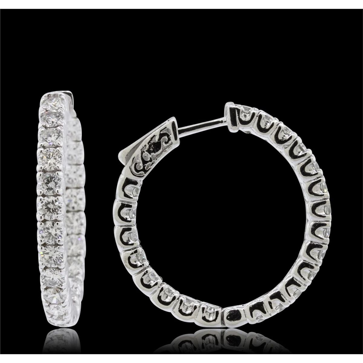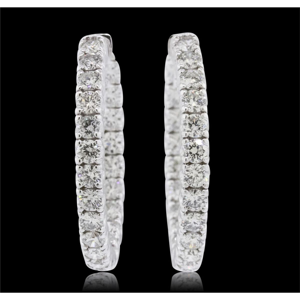 One pair electronically tested 14KT white gold ladies combination cast & assembled hoop earrings with hinged clip backs with a bright polish finish. Identified with markings of "14K". Condition is new. Containing: Forty-Two prong set round brilliant cut diamonds, measuring 2.50 - 2.50 x 1.50mm (depth est.) approximate total weight of 42 Stones = 2.40ct. Clarity: SI-2 to I-1. Color: I - J, Cut is Good. All diamonds are graded in the mounting, unless otherwise stated. Total Weight of Diamonds 2.40ct. Total Weight of Earrings 8.60 grams. GGL Appraised at $8,040.00.