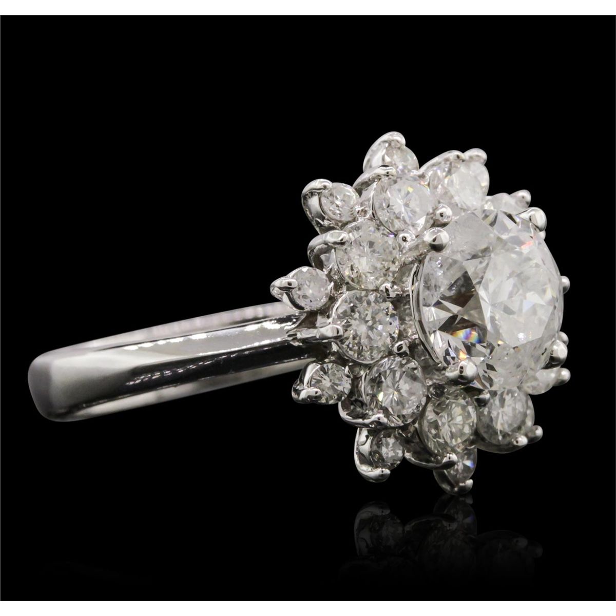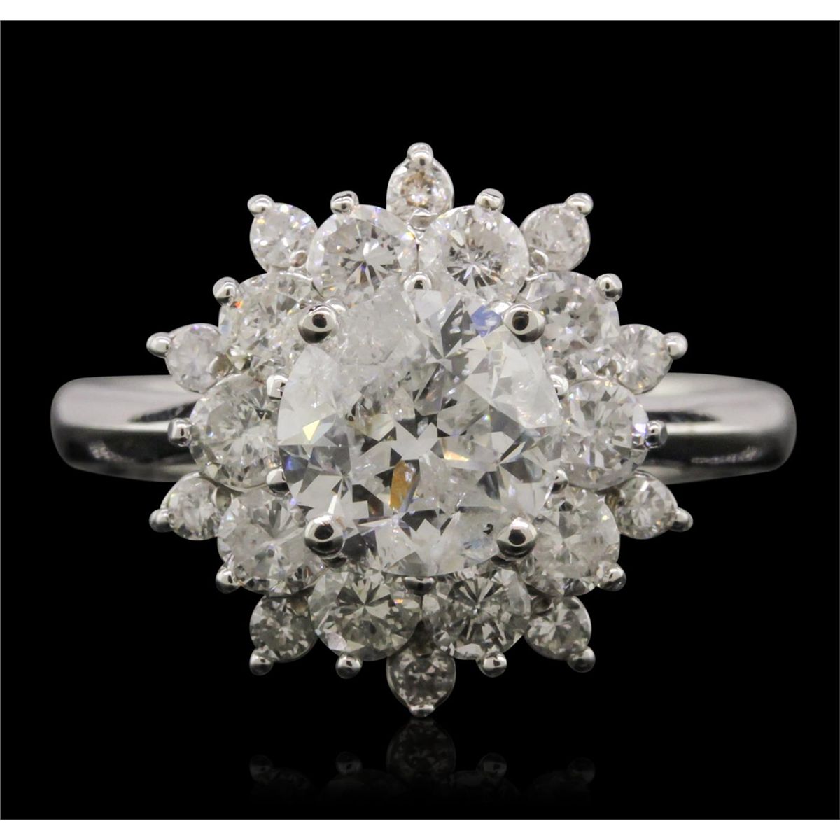 One electronically tested 14KT white gold Ladies combination cast & assembled engagement ring with a bright polish finish. Condition is new. Identified with markings of "14K". Containing: One prong set round brilliant cut diamond, measuring 7.01 - 6.99 x 4.64mm (depth est.) approximate. Total Weight of 1.42ct. Clarity: I-2. Color: E, Cut is Good. Twenty prong set round brilliant cut diamonds, measuring 2.30 - 2.30 x 1.38mm (depth est.) approximate. Total Weight of 20 Stones = 0.98ct. Clarity: SI-2 to SI-3. Color: G - H, Cut is Good. EGL USA GEM ID# US 911348429D. All diamonds are graded in the mounting, unless otherwise stated. Total Weight of Diamonds 2.40ct. Total Weight of Engagement Ring 4.40 grams. GGLAppraised at $19,315.00.