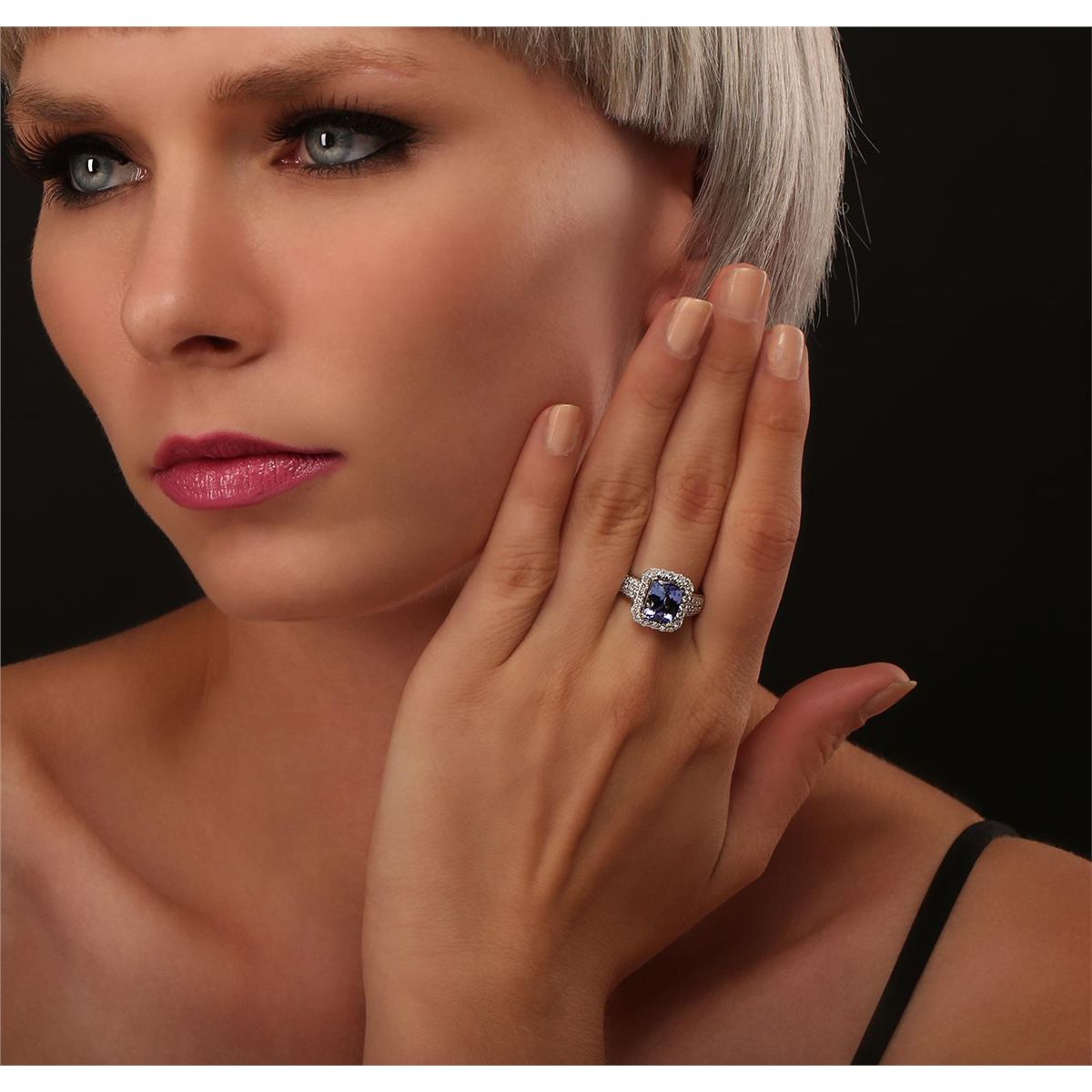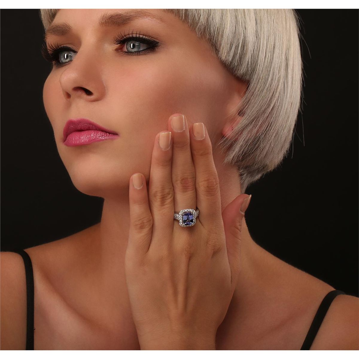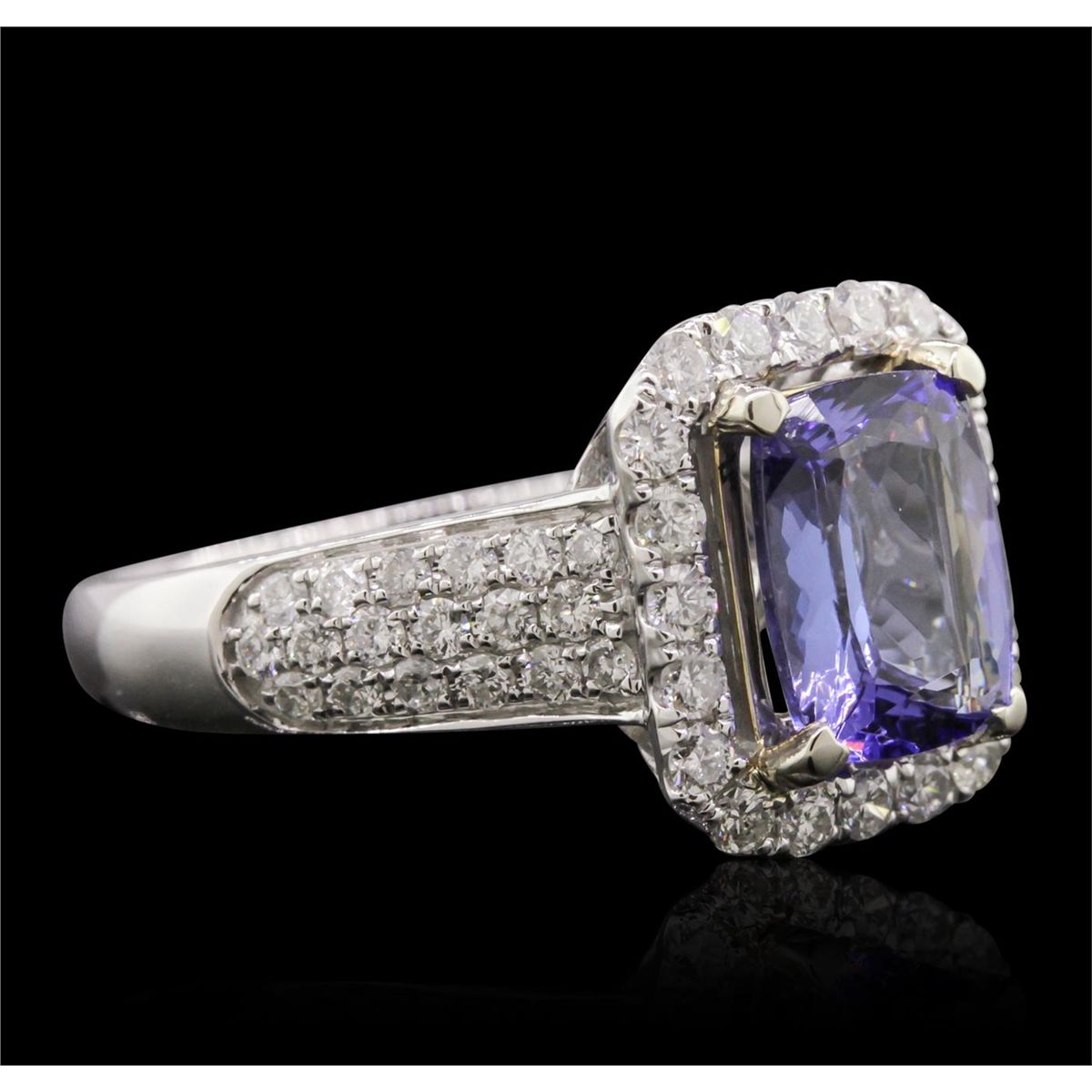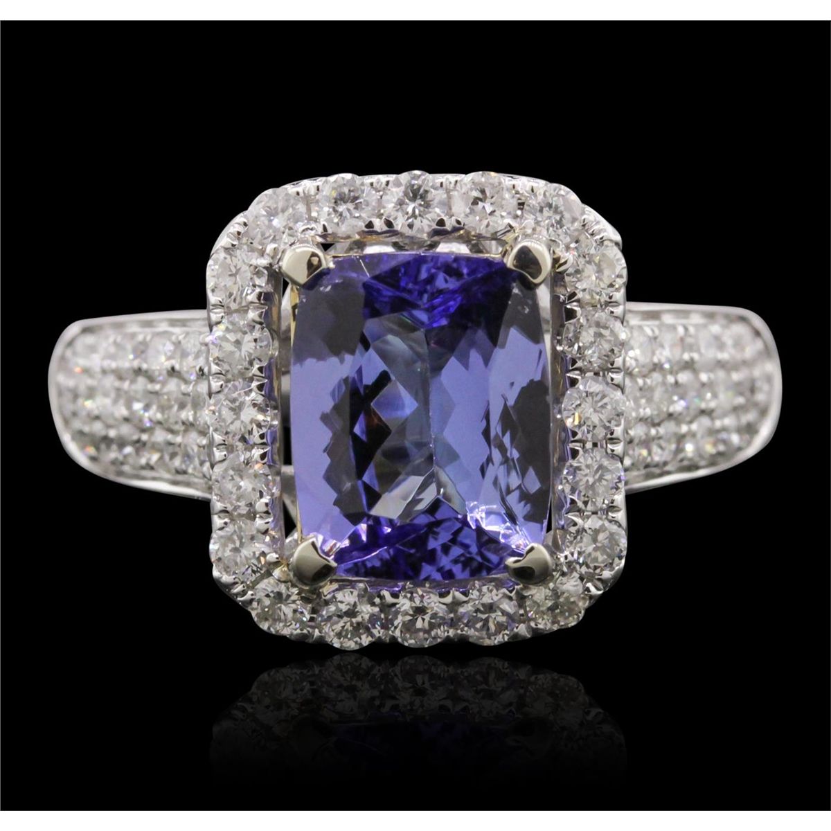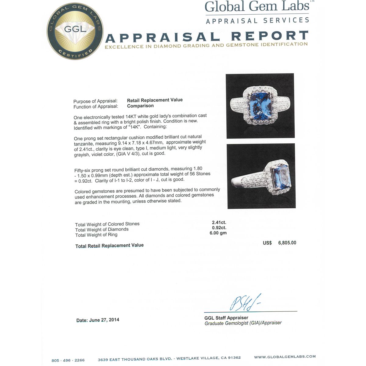 One electronically tested 14KT white gold Ladies combination cast & assembled ring with a bright polish finish. Condition is new. Identified with markings of "14K". Containing: One prong set rectangular cushion modified brilliant cut natural tanzanite, measuring 9.14 x 7.18 x 4.67mm, approximate weight of 2.41ct., clarity is eye clean, type I, medium light, very slightly grayish, violet color, (GIA V 4/3), cut is good. Fifty-Six prong set round brilliant cut diamonds, measuring 1.80 - 1.50 x 0.99mm (depth est.) approximate total weight of 56 Stones = 0.92ct. Clarity: I-1 to I-2. Color: I - J, Cut is Good. Colored gemstones are presumed to have been subjected to commonly used enhancement processes. All diamonds and colored gemstones are graded in the mounting, unless otherwise stated. Total Weight of Colored Stones 2.41ct. Total Weight of Diamonds 0.92ct. Total Weight of Ring 6.00 grams. GGL Appraised at $6,805.00.