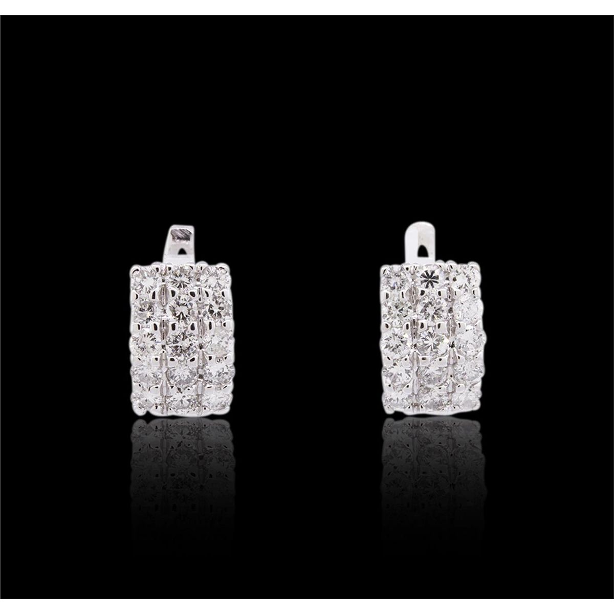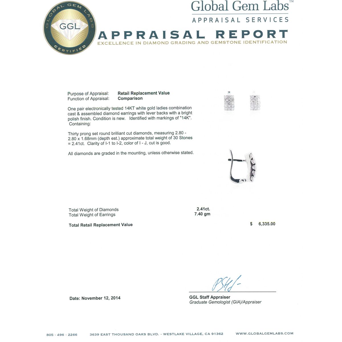 One pair electronically tested 14KT white gold ladies combination cast & assembled diamond earrings with lever backs with a bright polish finish. Identified with markings of "14K". Condition is new. Containing: Thirty prong set round brilliant cut diamonds, measuring 2.80 - 2.80 x 1.68mm (depth est.) approximate total weight of 30 Stones = 2.41ct. Clarity: I-1 to I-2. Color: I - J, Cut is Good. All diamonds are graded in the mounting, unless otherwise stated. Total Weight of Diamonds 2.41ct. Total Weight of Earrings 7.40 grams. GGL Appraised at $6,335.00.