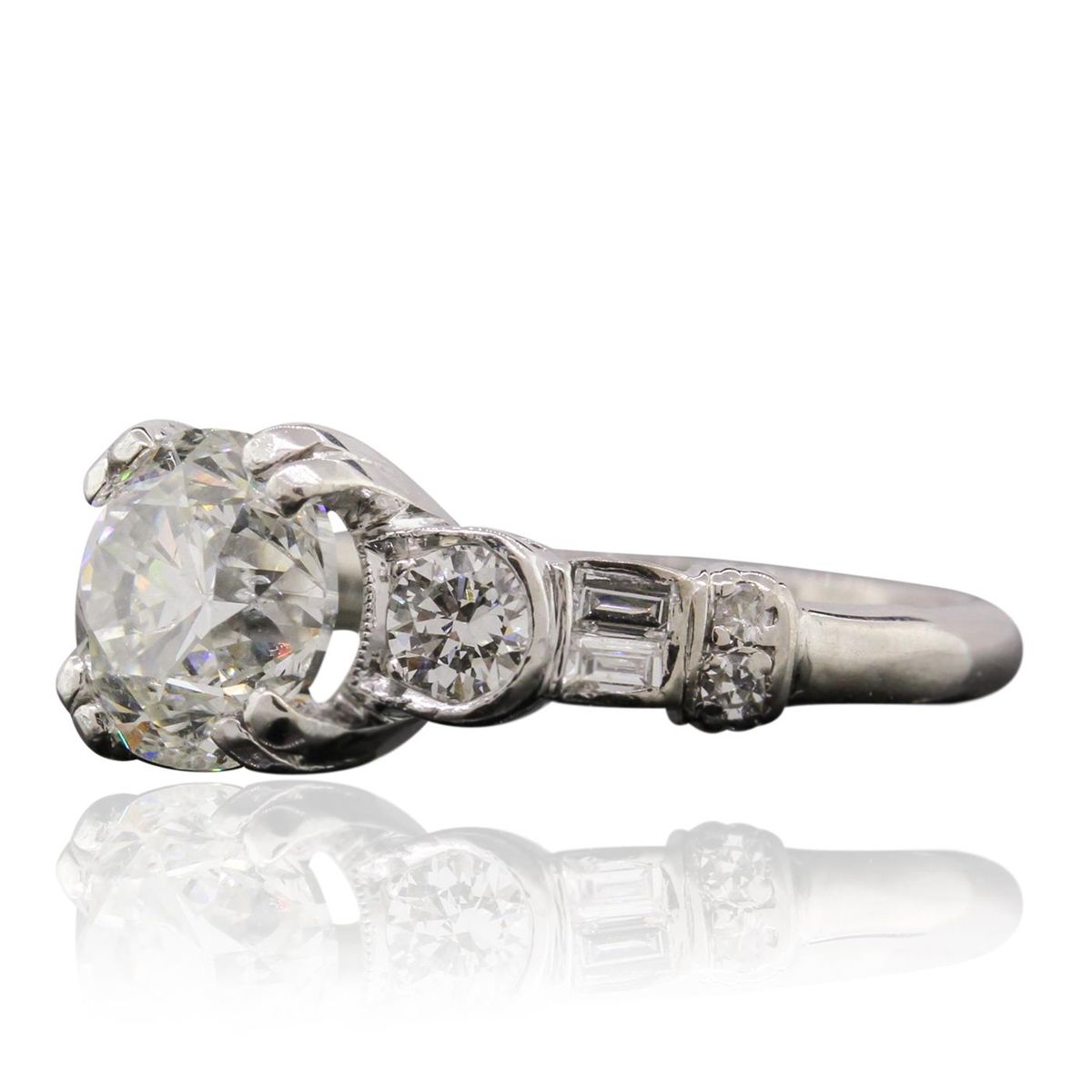 One electronically tested 14KT white gold Ladies combination cast & assembled engagement ring with a bright polish finish. Condition is new. Identified with markings of "14K". Containing: One prong set round brilliant cut diamond, measuring 7.60 - 7.60 x 5.40mm (depth est.) approximate weight of 1.90ct. Clarity: SI-2. Color: K, Cut is Good. Two prong set round brilliant cut diamonds, measuring 3.40 - 3.50 x 2.07mm (depth est.) approximate. Total Weight of 2 Stones = 0.30ct. Clarity: SI-1. Color: J, Cut is Good. Four prong set single cut diamonds, measuring 1.30 - 1.30 x 0.78mm (depth est.) approximate. Total Weight of 4 Stones = 0.03ct. Clarity: SI-2. Color: I, Cut is Good. Four channel set baguette cut diamonds, measuring 2.50 x 1.50 x 1.28mm (depth est.) approximate. Total Weight of 4 Stones = 0.18ct. Clarity: SI-1. Color: I, Cut is Good. Total Weight of Diamonds 2.41ct. Total Weight of Engagement Ring 4.80 grams. GGL Appraised at $29,115.00.