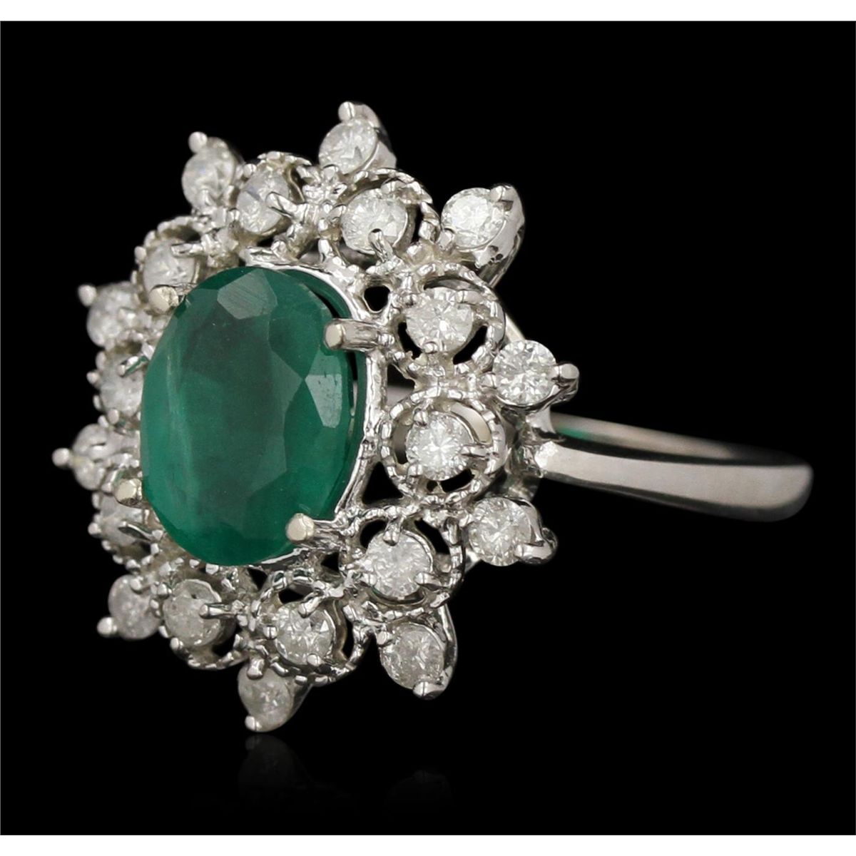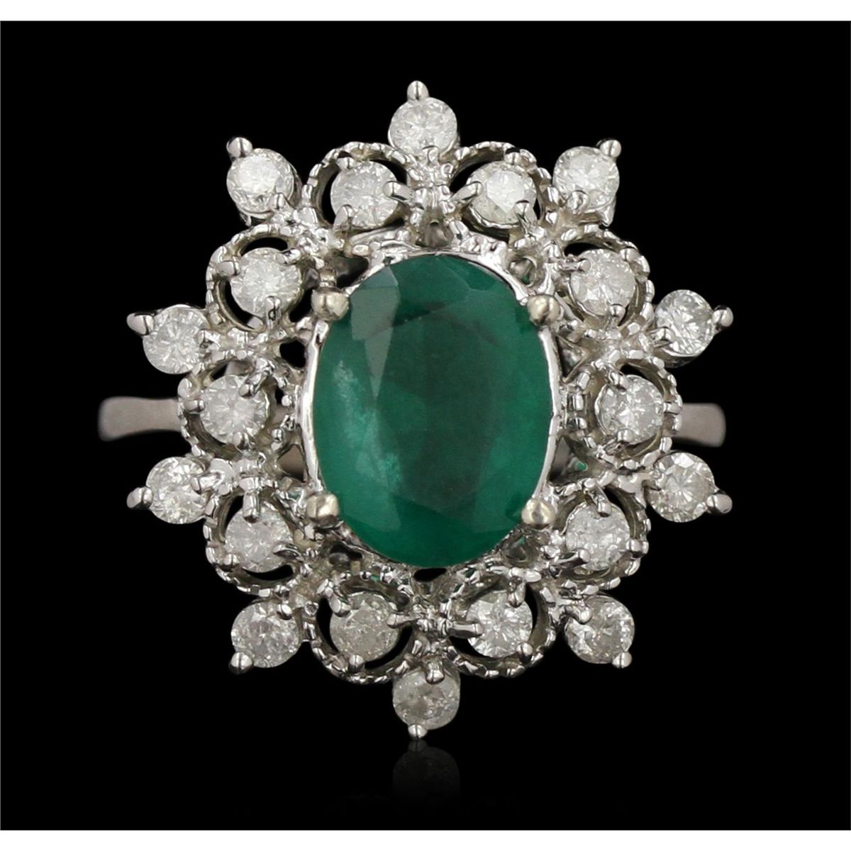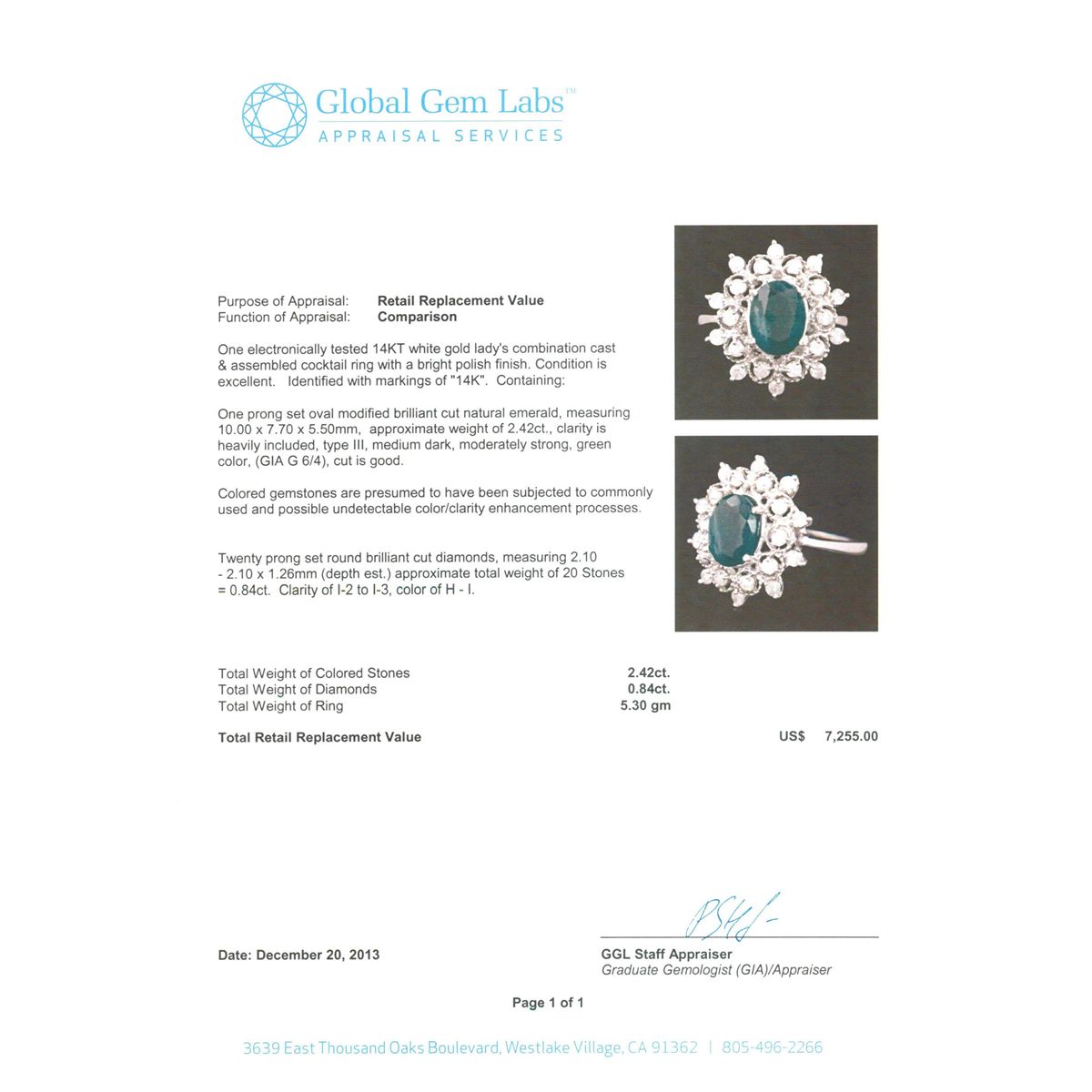 One electronically tested 14KT white gold Ladies combination cast & assembled cocktail ring with a bright polish finish. Identified with markings of "14K". Condition is excellent. Containing: One prong set oval modified brilliant cut natural emerald, measuring 10.00 x 7.70 x 5.50mm, approximate weight of 2.42ct., clarity is heavily included, type III, medium dark, moderately strong, green color, (GIA G 6/4), cut is good. Colored gemstones are presumed to have been subjected to commonly used and possible undetectable color/clarity enhancement processes. Twenty prong set round brilliant cut diamonds, measuring 2.10 - 2.10 x 1.26mm (depth est.) approximate total weight of 20 Stones = 0.84ct. Clarity of I-2 to I-3, Color of H - I. Total Weight of Colored Stones 2.42ct. Total Weight of Diamonds 0.84ct. Total Weight of Ring 5.30gm. GGL Appraised at $7,255.00.