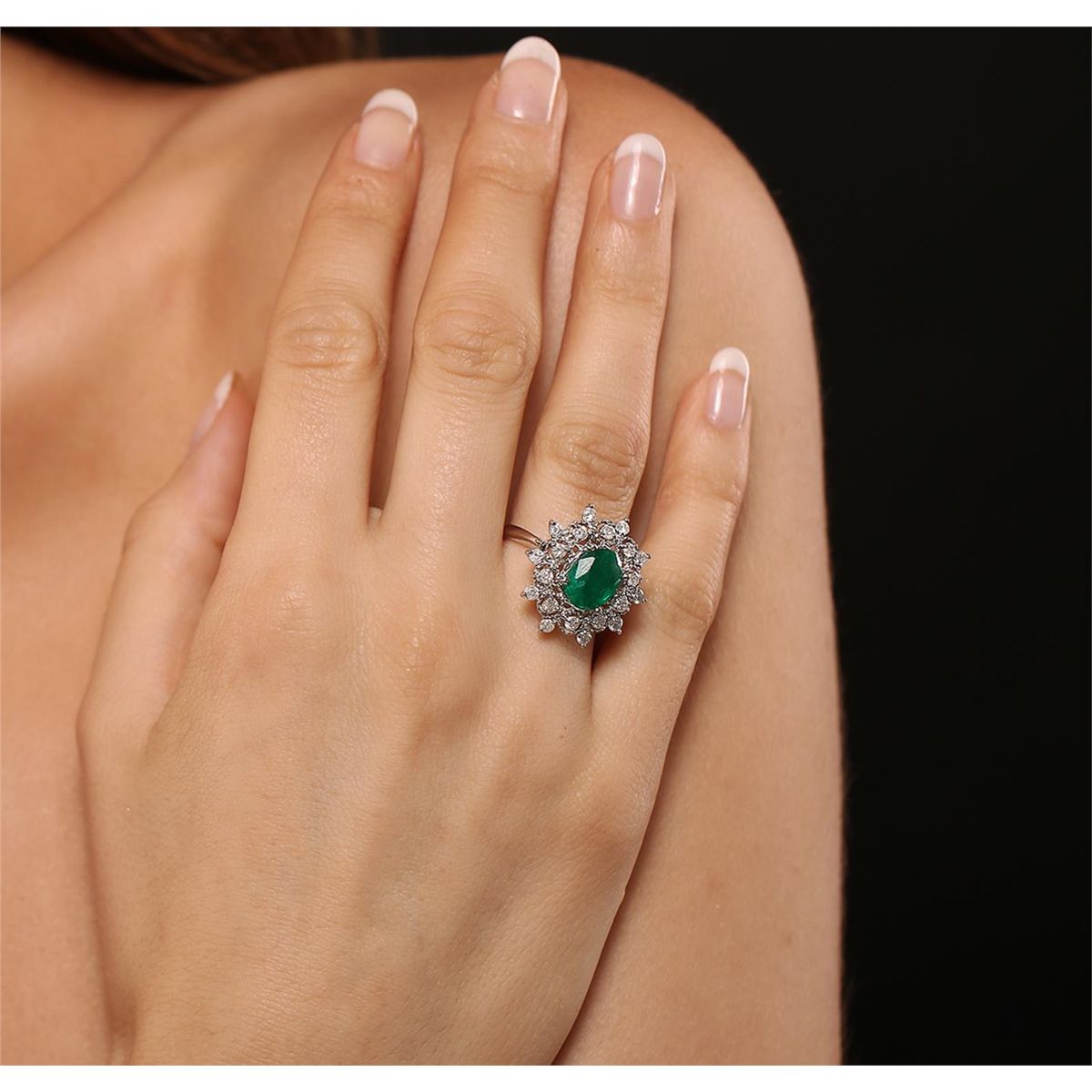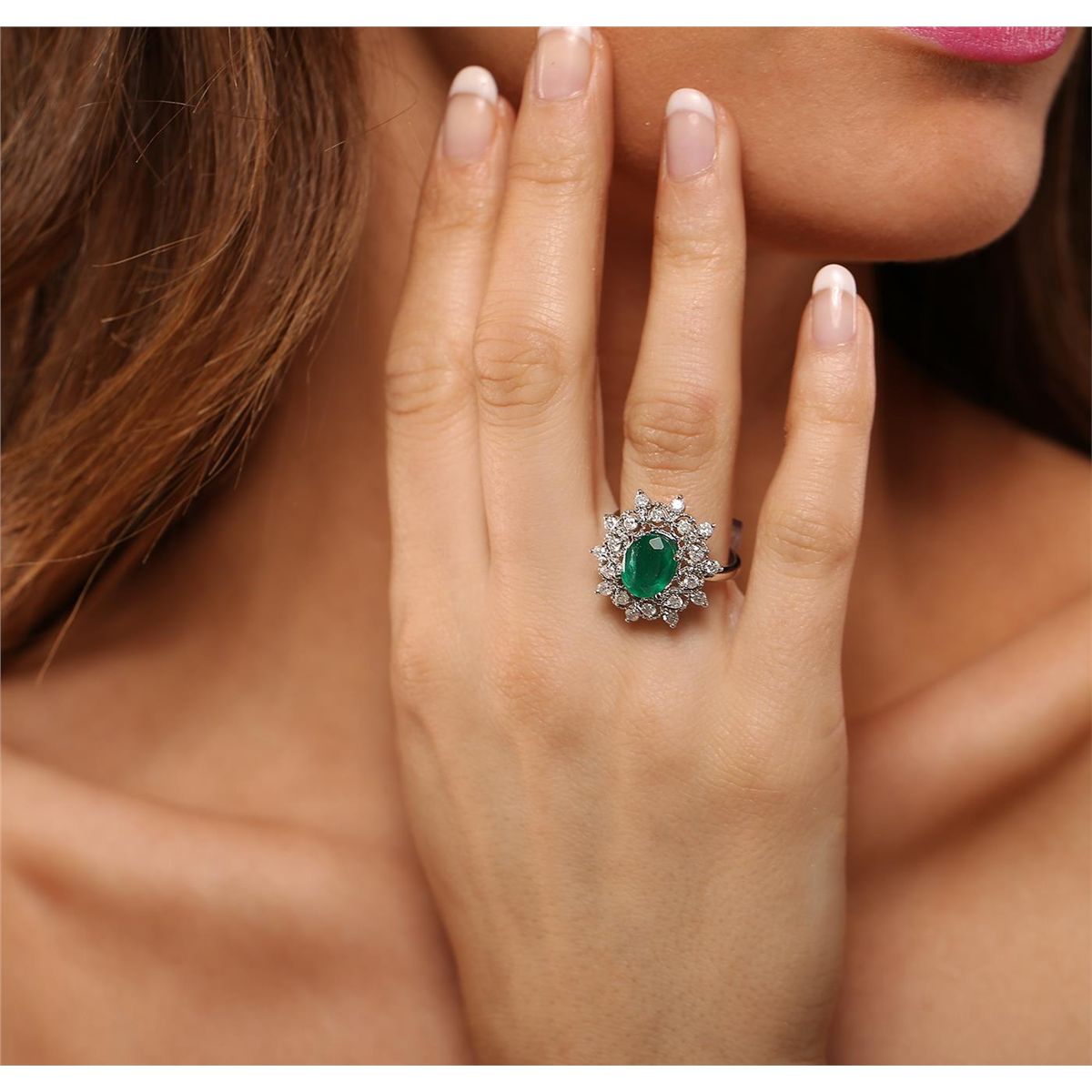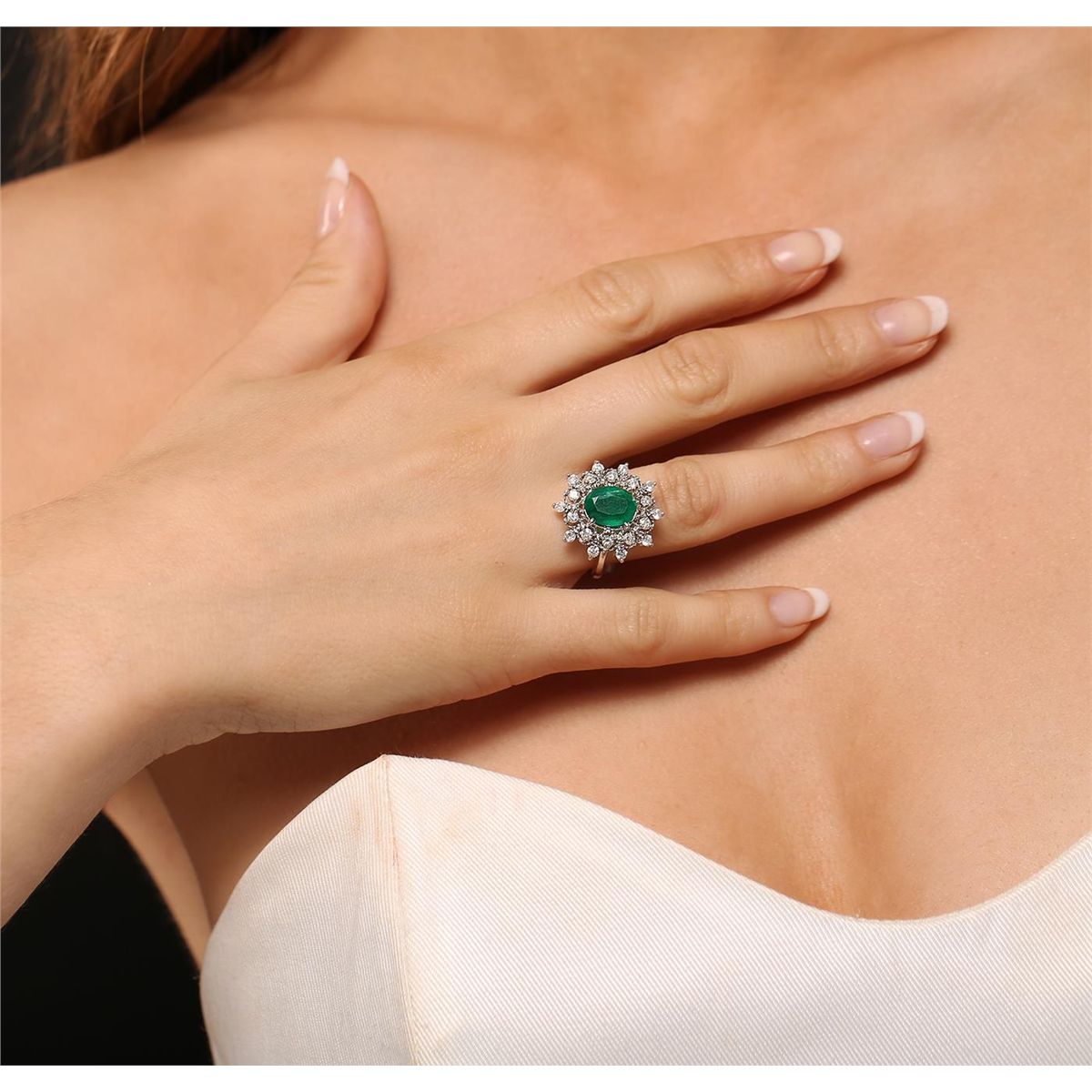 One electronically tested 14KT white gold Ladies combination cast & assembled cocktail ring with a bright polish finish. Identified with markings of "14K". Condition is excellent. Containing: One prong set oval modified brilliant cut natural emerald, measuring 10.00 x 7.70 x 5.50mm, approximate weight of 2.42ct., clarity is heavily included, type III, medium dark, moderately strong, green color, (GIA G 6/4), cut is good. Colored gemstones are presumed to have been subjected to commonly used and possible undetectable color/clarity enhancement processes. Twenty prong set round brilliant cut diamonds, measuring 2.10 - 2.10 x 1.26mm (depth est.) approximate total weight of 20 Stones = 0.84ct. Clarity of I-2 to I-3, Color of H - I. Total Weight of Colored Stones 2.42ct. Total Weight of Diamonds 0.84ct. Total Weight of Ring 5.30gm. GGL Appraised at $7,255.00.