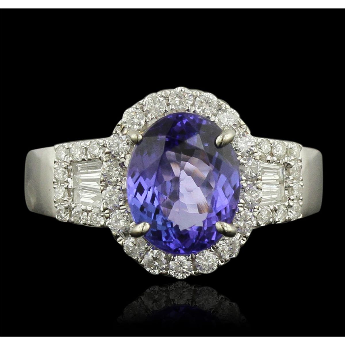 One electronically tested 14KT white gold Ladies combination cast & assembled ring with a bright polish finish. Condition is new. Identified with markings of "14K". Containing: One prong set oval modified mixed cut natural tanzanite, measuring 10.00 x 8.00 x 4.20mm, approximate weight of 2.42ct., clarity is eye clean, type I, violet color, (GIA V 0/0), cut is very good. Colored gemstones are presumed to have been subjected to commonly used color/clarity enhancement processes. Six channel set baguette cut diamonds, measuring 2.50 x 1.50 x 1.28mm (depth est.) approximate. Total Weight of 6 Stones = 0.26ct. Clarity: VS-2. Color: H - I, Cut is Good. Thirty-Four prong set round brilliant cut diamonds, measuring 1.40 - 1.30 x 0.81mm (depth est.) approximate. Total Weight of 34 Stones = 0.45ct. Clarity: I-1 to I-2. Color: H - I, Cut is Good. Total Weight of Colored Stones 2.42ct. Total Weight of Diamonds 0.71ct. Total Weight of Ring 5.10 grams. GGL Appraised at $7,605.00.