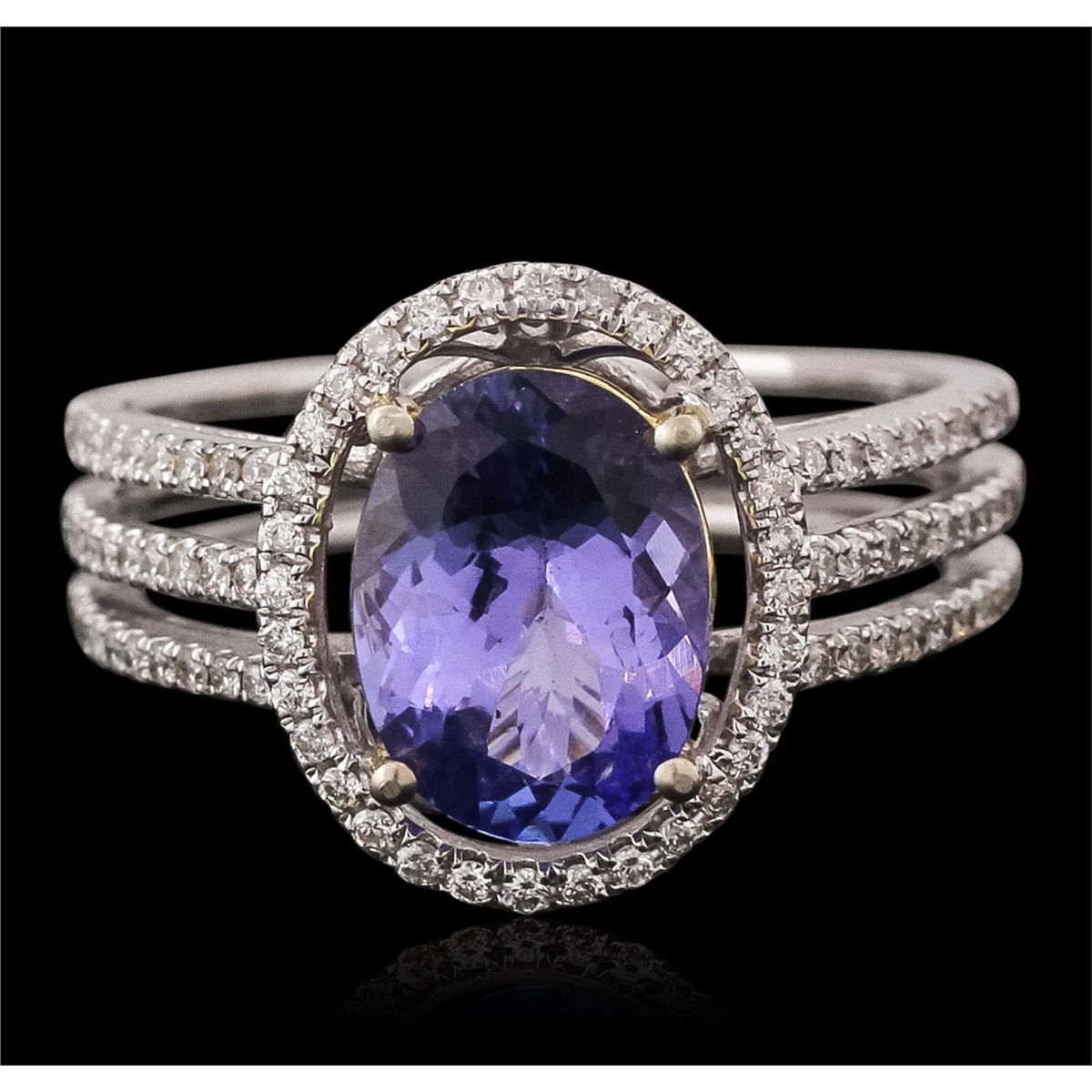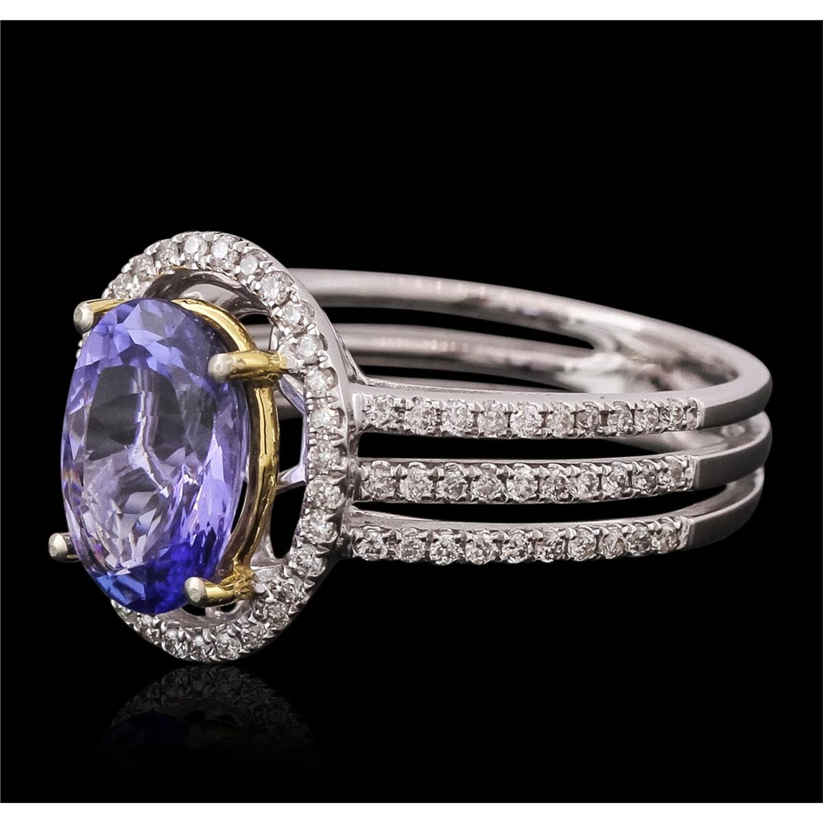 One electronically tested 14KT white gold ladies cast tanzanite & diamond ring with a bright finish. The featured tanzanite is set within an inner yellow gold accented frame, and an outer diamond set bezel, supported by an elaborate white gold under gallery and diamond set shoulders, completed by a four millimeter wide band. Identified with markings of "14K". Condition is new, good workmanship. Containing: One prong set oval mixed cut natural tanzanite, measuring 10.00 x 8.00 x 4.20mm, 6% bulge factor, approximate weight of 2.42ct., clarity is slightly included, type I, medium dark, slightly grayish, bluish violet color, (GIA bV 6/2), cut is good. Transmitting light with no distortion, transparent. Naturally occurring internal characteristics are present. Graded in the setting. Tanzanite is a very rare gemstone that is only found in the country of Tanzania. Tanzanite was originally discovered in 1967. Tiffany & Company, named the stone "Tanzanite" after the country of origin. Tanzanite is found in the Usumburu Mountains that border the Umba Valley of northern Tanzania. This region is inhabited by the Masai tribes-people. The mining area is located just south of the Kenya border near Mt. Kilimanjaro. Tanzanite occurs in colors of gray, brown, violet, blue, reddish-purple, & green. The gem is interesting because of its exceptional pleochroism. Rotated in different directions a tanzanite will exhibit multiple changes of color. Tanzanite has a low tolerance to ultrasonic cleaning, and should not be cleaned using this method. Ninety-Two prong set round brilliant cut diamonds, measuring 1.10 - 1.00 x 0.65mm (depth est.) approximate total weight of 92 Stones = 0.40ct. Graded in the setting. Clarity: SI-2 to I-1. Color: G - I. Total Weight of Colored Stones 2.42ct. Total Weight of Diamonds 0.40ct. Total Weight of Ring 4.45 grams. AIG Appraised at $5,750.00.