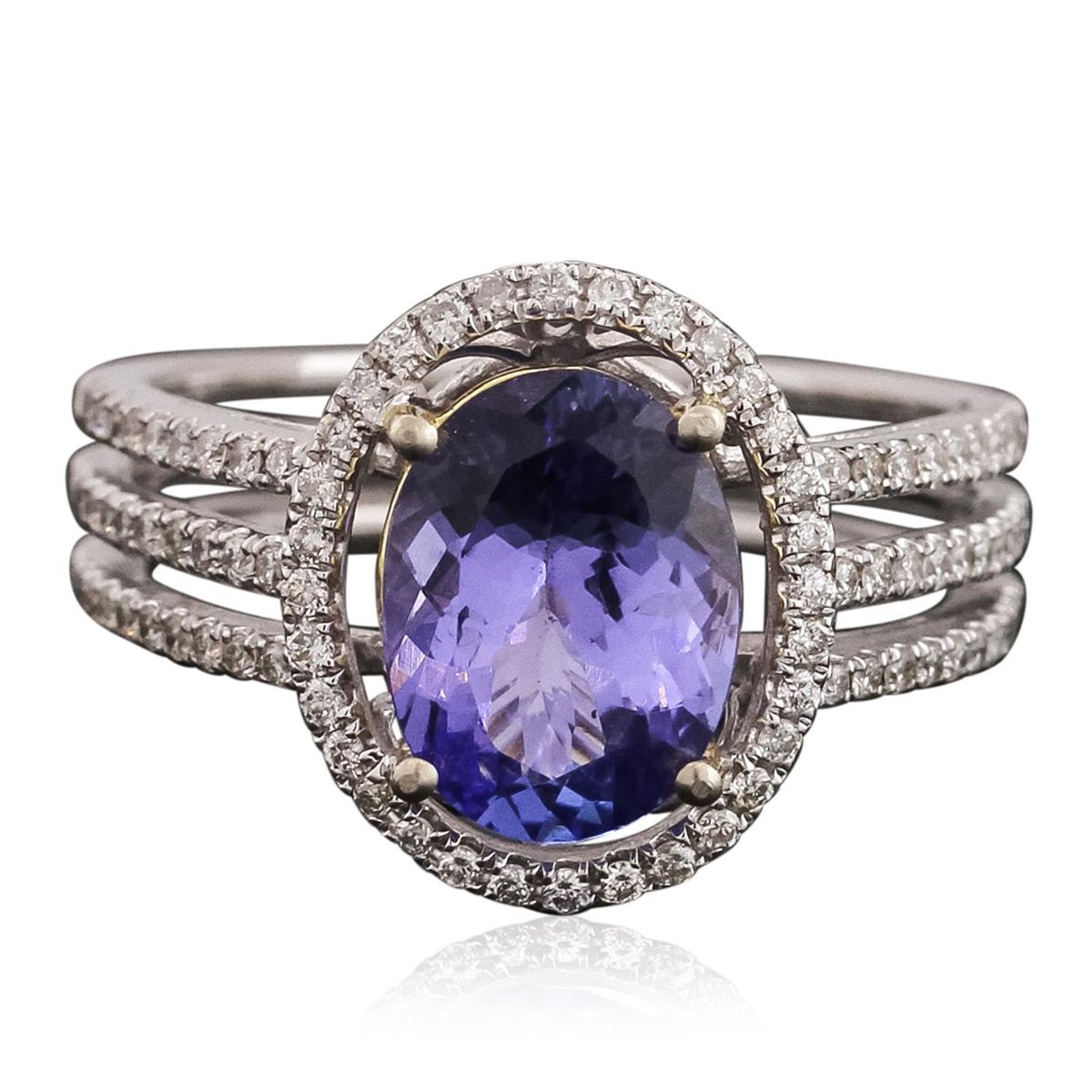 One electronically tested 14KT white gold ladies cast tanzanite & diamond ring with a bright finish. The featured tanzanite is set within an inner yellow gold accented frame, and an outer diamond set bezel, supported by an elaborate white gold under gallery and diamond set shoulders, completed by a four millimeter wide band. Identified with markings of "14K". Condition is new, good workmanship. Containing: One prong set oval mixed cut natural tanzanite, measuring 10.00 x 8.00 x 4.20mm, 6% bulge factor, approximate weight of 2.42ct., clarity is slightly included, type I, medium dark, slightly grayish, bluish violet color, (GIA bV 6/2), cut is good. Transmitting light with no distortion, transparent. Naturally occurring internal characteristics are present. Graded in the setting. Tanzanite is a very rare gemstone that is only found in the country of Tanzania. Tanzanite was originally discovered in 1967. Tiffany & Company, named the stone "Tanzanite" after the country of origin. Tanzanite is found in the Usumburu Mountains that border the Umba Valley of northern Tanzania. This region is inhabited by the Masai tribes-people. The mining area is located just south of the Kenya border near Mt. Kilimanjaro. Tanzanite occurs in colors of gray, brown, violet, blue, reddish-purple, & green. The gem is interesting because of its exceptional pleochroism. Rotated in different directions a tanzanite will exhibit multiple changes of color. Tanzanite has a low tolerance to ultrasonic cleaning, and should not be cleaned using this method. Ninety-Two prong set round brilliant cut diamonds, measuring 1.10 - 1.00 x 0.65mm (depth est.) approximate total weight of 92 Stones = 0.40ct. Graded in the setting. Clarity: SI-2 to I-1. Color: G - I. Total Weight of Colored Stones 2.42ct. Total Weight of Diamonds 0.40ct. Total Weight of Ring 4.45 grams. AIG Appraised at $5,750.00.