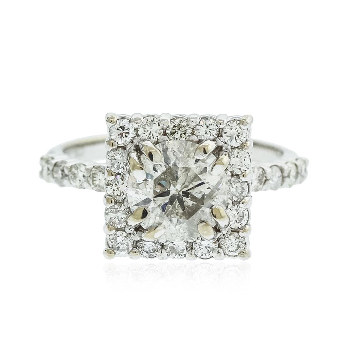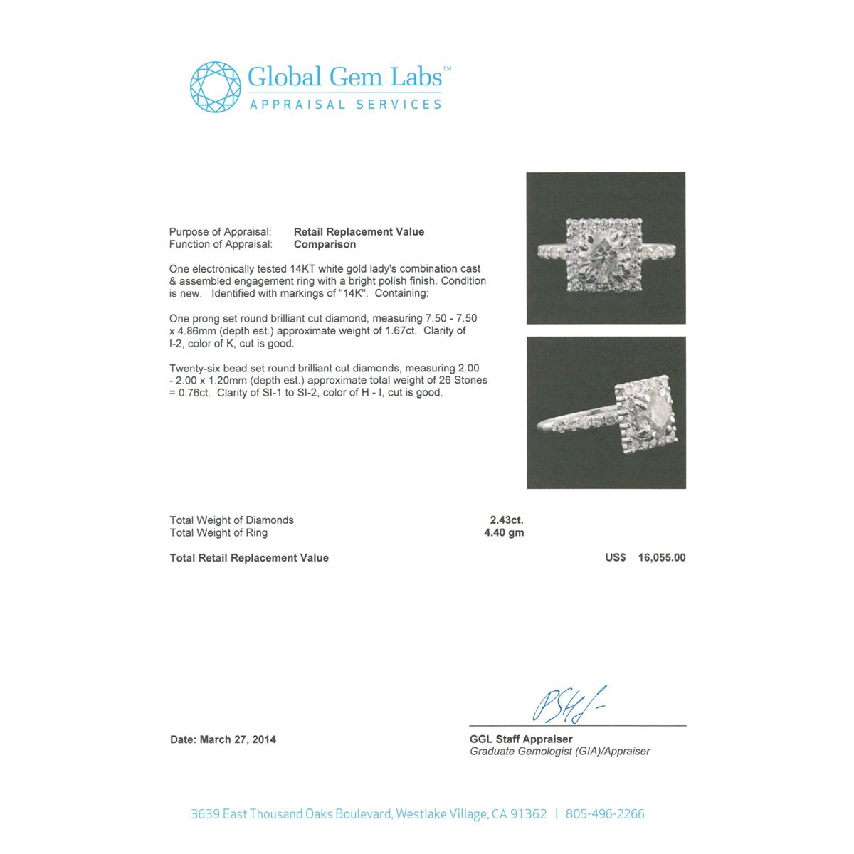 One electronically tested 14KT white gold Ladies combination cast & assembled engagement ring with a bright polish finish. Condition is new. Identified with markings of "14K". Containing: One prong set round brilliant cut diamond, measuring 7.50 - 7.50 x 4.86mm (depth est.) approximate weight of 1.67ct. Clarity: I-2. Color: K, Cut is Good. Twenty-Six bead set round brilliant cut diamonds, measuring 2.00. - 2.00. x 1.20mm (depth est.) approximate. Total Weight of 26 Stones = 0.76ct. Clarity: SI-1 to SI-2. Color: H - I, Cut is Good. Total Weight of Diamonds 2.43ct. Total Weight of Ring 4.40 grams. GGL Appraised at $16,055.00.