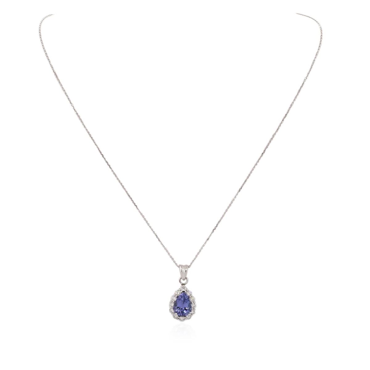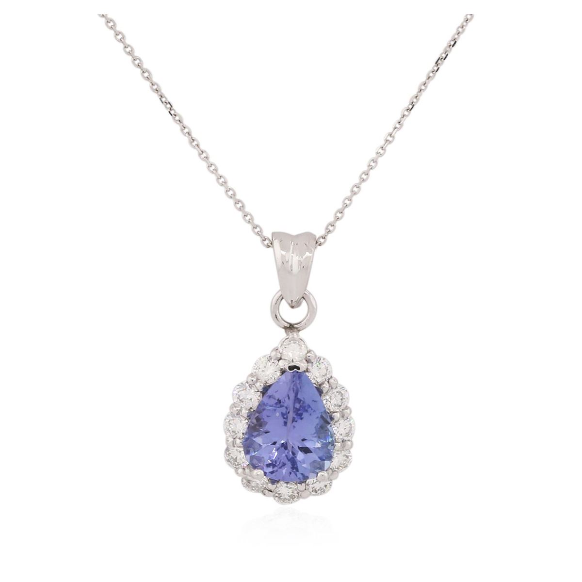 One electronically tested 14KT white gold ladies cast tanzanite and diamond pendant & chain 16.0" long, cable link with a spring ring clasp with a bright and brushed finish. Identified with markings of "14K". Condition is new. Containing: One prong set pear modified brilliant cut natural tanzanite, measuring 9.25 x 7.77 x 5.05mm, approximate weight of 2.43ct., clarity is eye clean, type I, medium, moderately strong, violet color, (GIA V 5/4), cut is good. Twelve prong set round brilliant cut diamonds, measuring 2.50 - 2.50 x 1.50mm (depth est.) approximate total weight of 12 Stones = 0.69ct. Clarity: SI-1 to SI-2. Color: I - J, Cut is Good. Colored gemstones are presumed to have been subjected to commonly used enhancement processes. All diamonds and colored gemstones are graded in the mounting, unless otherwise stated. Total Weight of Colored Stones 2.43ct. Total Weight of Diamonds 0.69ct. Total Weight of Pendant & Chain 3.80 grams. GGL Appraised at $3,590.00.