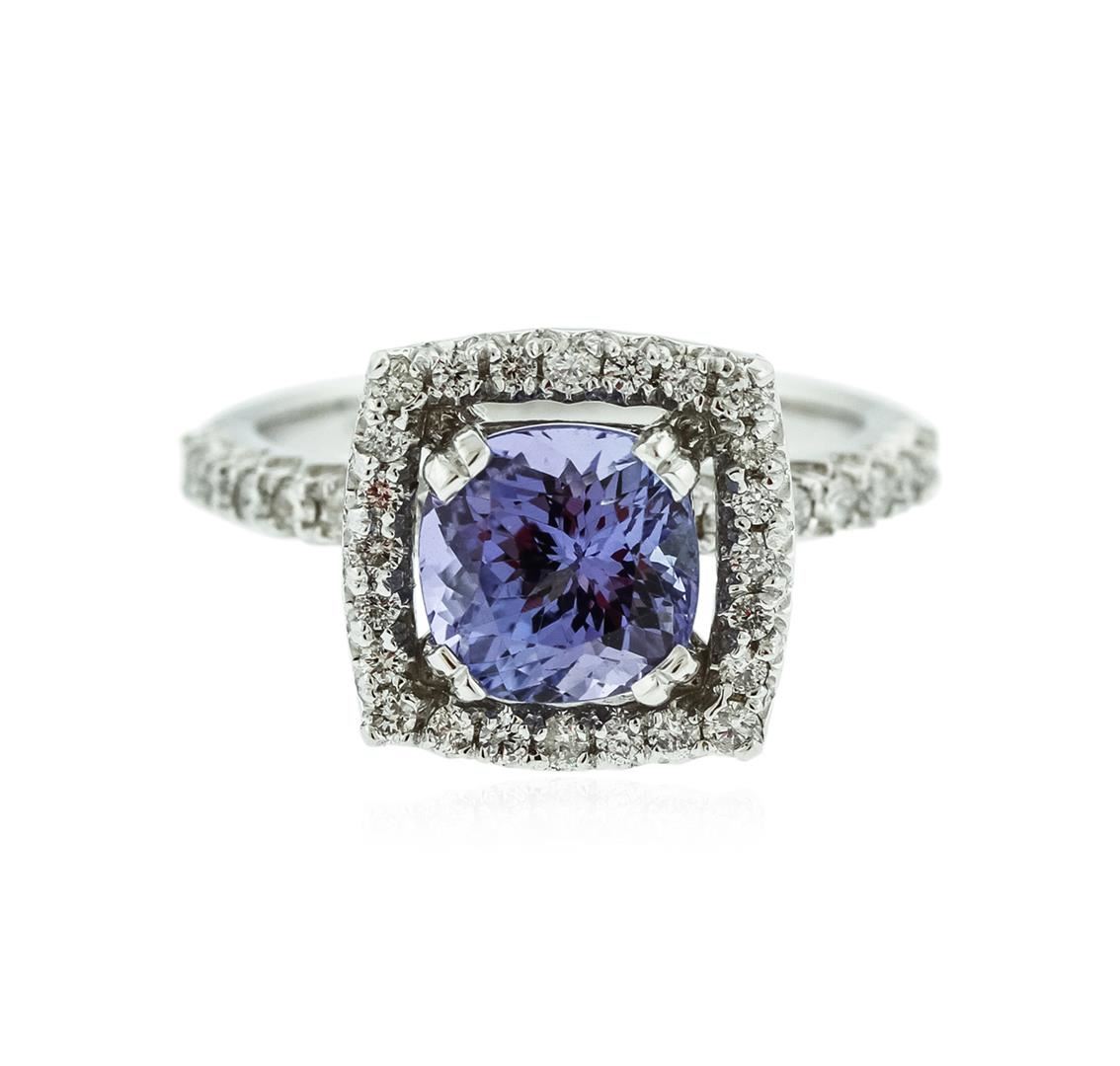 One electronically tested 14KT white gold ladies cast tanzanite and diamond ring with a bright polish finish. Identified with markings of "14K". Condition is new. Containing: One prong set square cushion modified brilliant cut natural tanzanite, measuring 7.80 x 7.80 x 5.07mm, approximate weight of 2.43ct., clarity is eye clean, type I, medium light, very slightly grayish, violet color, (GIA V 4/3), cut is good. Forty-Two prong set round brilliant cut diamonds, measuring 1.50 - 1.30 x 0.84mm (depth est.) approximate total weight of 42 Stones = 0.42ct. Clarity: SI-1 to I-1. Color: I - J, Cut is Good. Colored gemstones are presumed to have been subjected to commonly used enhancement processes. All diamonds and colored gemstones are graded in the mounting, unless otherwise stated. Total Weight of Colored Stones 2.43ct. Total Weight of Diamonds 0.42ct. Total Weight of Ring 5.60 grams. GGL Appraised at $3,500.00.