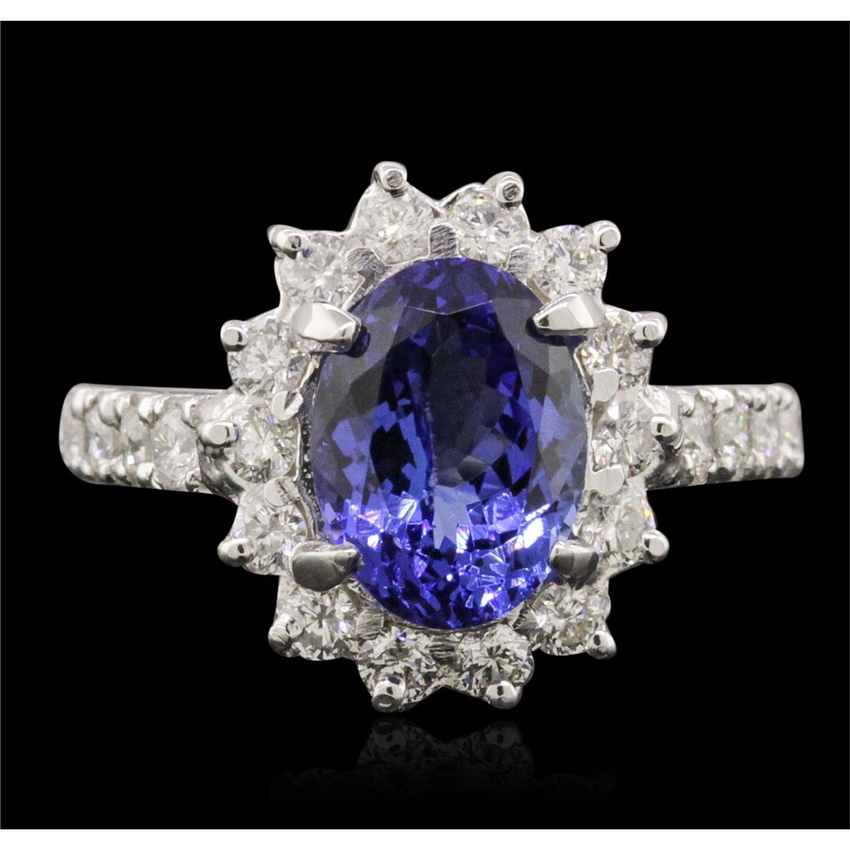One electronically tested 14KT white gold ladies combination cast & assembled ring with a bright polish finish. Condition is new. Identified with markings of "K14". Containing: One prong set oval modified brilliant cut natural tanzanite, measuring 9.47 x 7.25 x 5.19mm, approximate weight of 2.43ct., clarity is eye clean, type I, medium, moderately strong, violetish blue color, (GIA vB 5/4), cut is good. Twenty-Two prong set round brilliant cut diamonds, measuring 2.10 - 2.10 x 1.26mm (depth est.) approximate. Total Weight of 22 Stones = 0.75ct. Clarity: SI-1 to I-1. Color: I - J, Cut is Good. Colored gemstones are presumed to have been subjected to commonly used enhancement processes. All diamonds and colored gemstones are graded in the mounting, unless otherwise stated. Total Weight of Colored Stones 2.43ct. Total Weight of Diamonds 0.75ct. Total Weight of Ring 4.50 grams. GGL Appraised at $6,965.00.