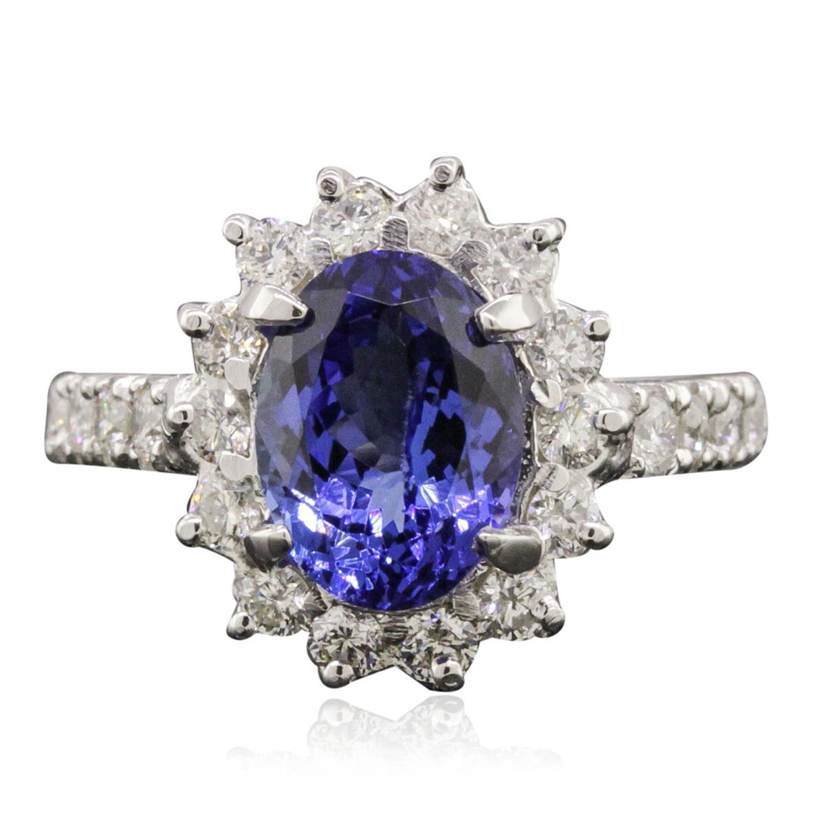 One electronically tested 14KT white gold ladies combination cast & assembled ring with a bright polish finish. Condition is new. Identified with markings of "K14". Containing: One prong set oval modified brilliant cut natural tanzanite, measuring 9.47 x 7.25 x 5.19mm, approximate weight of 2.43ct., clarity is eye clean, type I, medium, moderately strong, violetish blue color, (GIA vB 5/4), cut is good. Twenty-Two prong set round brilliant cut diamonds, measuring 2.10 - 2.10 x 1.26mm (depth est.) approximate. Total Weight of 22 Stones = 0.75ct. Clarity: SI-1 to I-1. Color: I - J, Cut is Good. Colored gemstones are presumed to have been subjected to commonly used enhancement processes. All diamonds and colored gemstones are graded in the mounting, unless otherwise stated. Total Weight of Colored Stones 2.43ct. Total Weight of Diamonds 0.75ct. Total Weight of Ring 4.50 grams. GGL Appraised at $6,965.00.