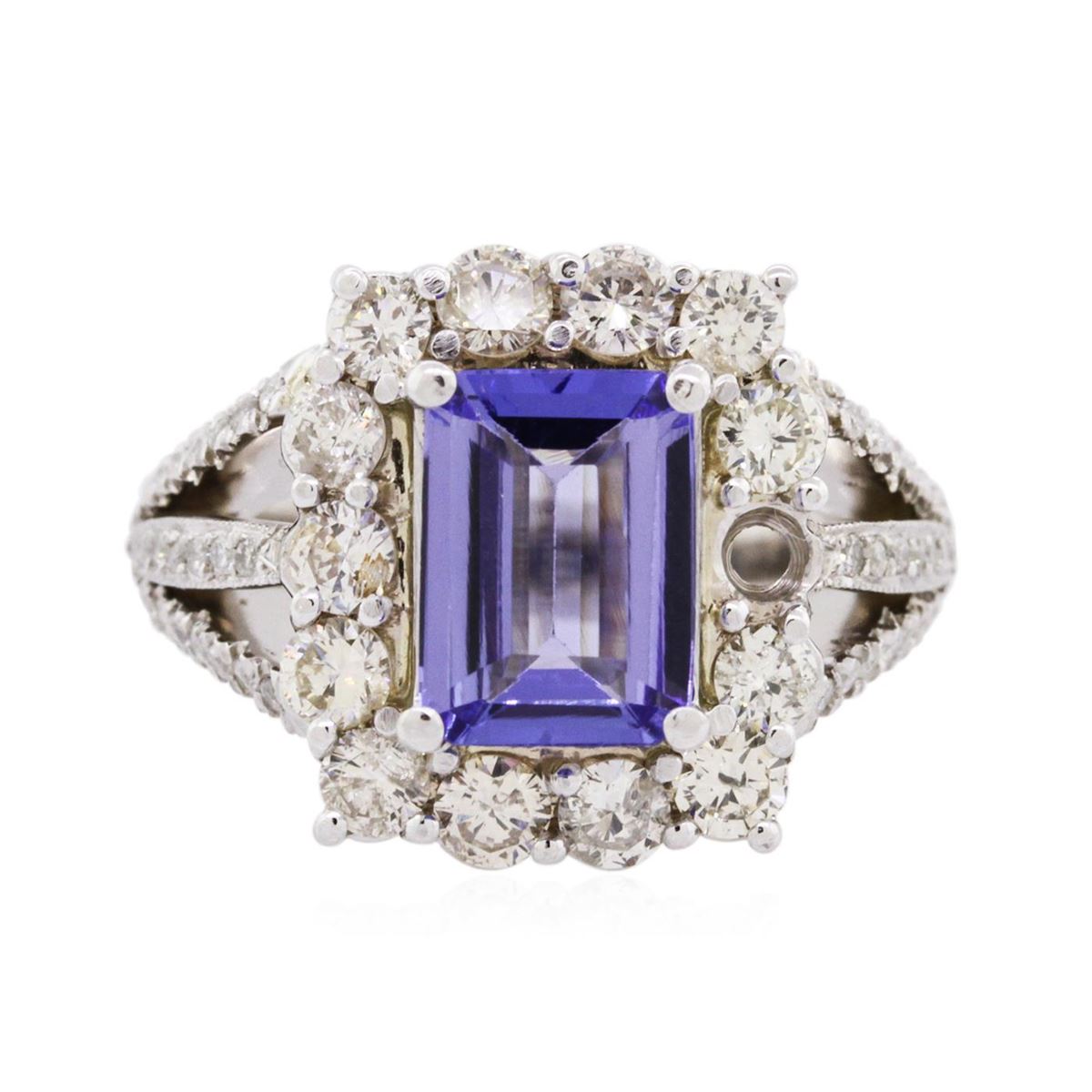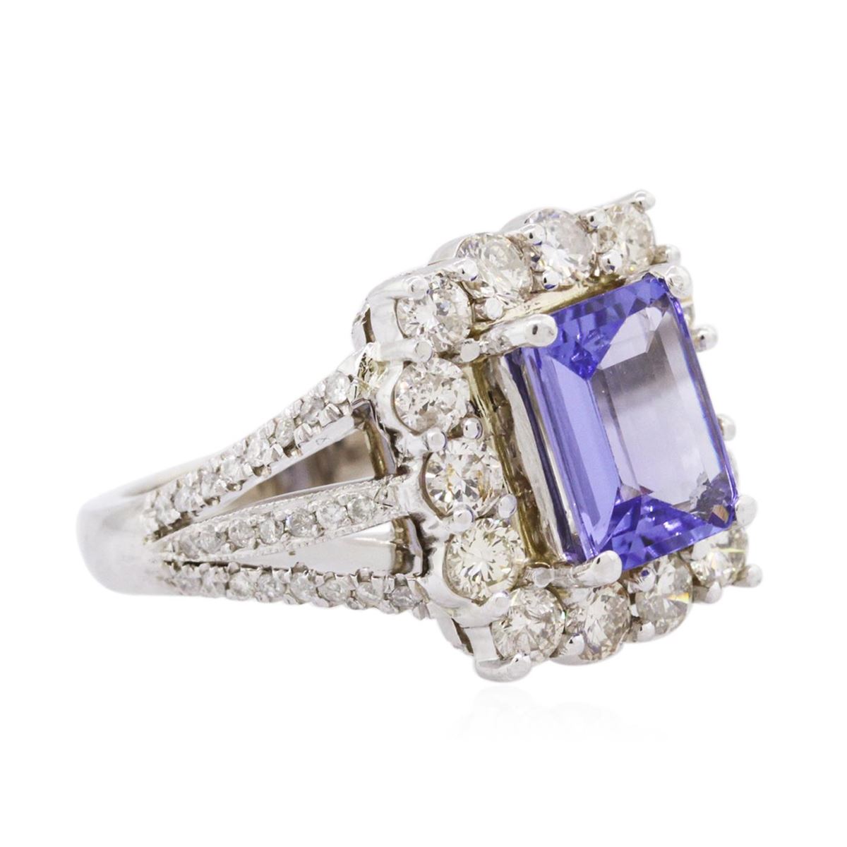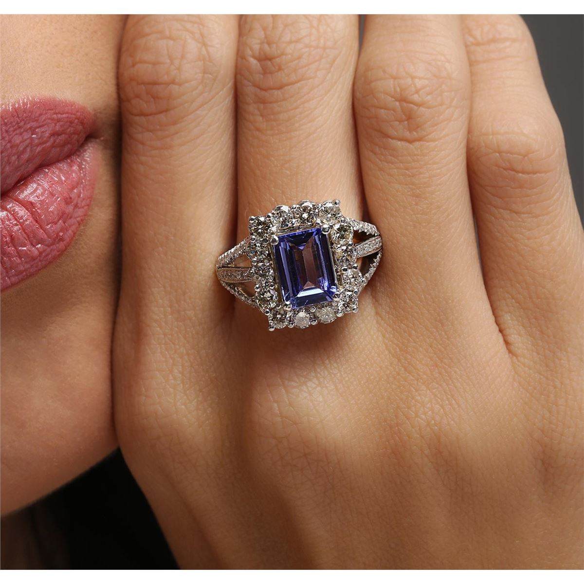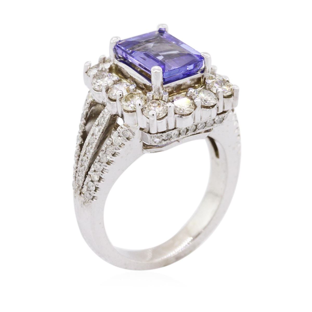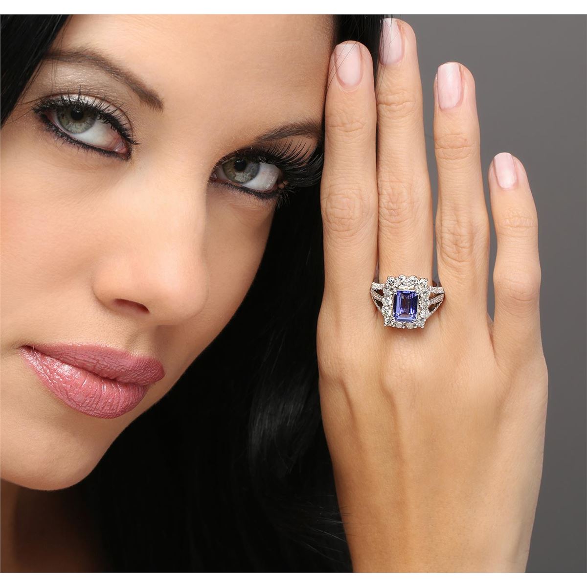 One electronically tested 14KT white gold ladies cast tanzanite and diamond ring with a bright polish finish. The featured tanzanite is set within a diamond bezel supported by diamond set three-way split shoulders, completed by a three millimeter wide band. Identified with markings of "14K". Condition is new, good workmanship. Containing: One prong set rectangular step cut natural tanzanite, measuring 9.50 x 6.67 x 3.60mm, 6% bulge factor, approximate weight of 2.43ct., clarity is eye clean, type I, medium dark, very slightly grayish, bluish violet color, (GIA bV 6/3), cut is good. Transmitting light with no distortion, transparent. Graded in the setting. Tanzanite is a very rare gemstone that is only found in the country of Tanzania. Originally discovered in 1967. Tiffany & Company, named the stone Tanzanite. It is found in the Usumburu Mountains that border the Umba Valley of northern Tanzania. Tanzanite occurs in gray, brown, violet, blue, reddish-purple, & green. The gem is interesting because of its exceptional pleochroism. Rotated in different directions a tanzanite will exhibit multiple changes of color. Tanzanite has a low tolerance to ultrasonic cleaning, and should not be cleaned using this method. Fourteen prong set round brilliant cut diamonds, measuring 3.10 - 3.00 x 1.83mm (depth est.) approximate total weight of 14 Stones = 1.55ct. Faint brown secondary color throughout. Graded in the setting. Clarity: SI-1 to I-1. Color: I - K Forty-Six prong set round brilliant cut diamonds, measuring 1.20 - 1.10 x 0.69mm (depth est.) approximate total weight of 46 Stones = 0.35ct. Graded in the setting. Clarity: I-1 to I-2. Color: H - J. Total Weight of Colored Stones 2.43ct. Total Weight of Diamonds 1.90ct. Total Weight of Ring 11.35 grams. AIG Appraised at $11,575.00.