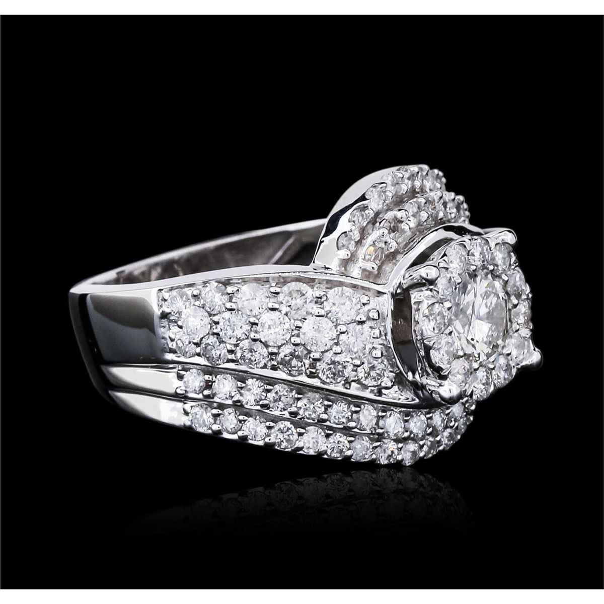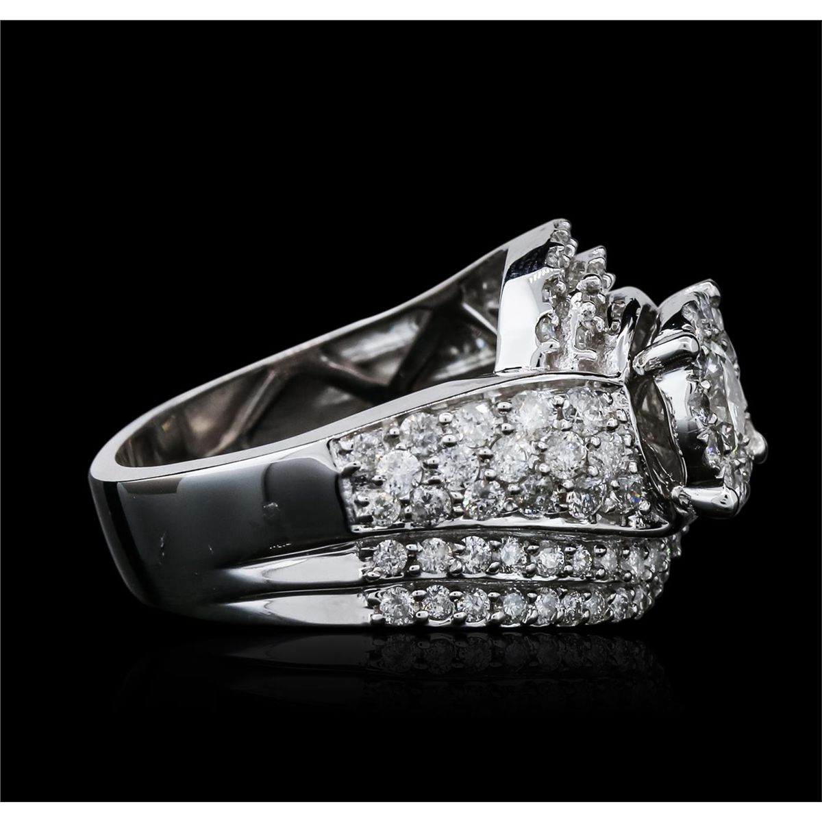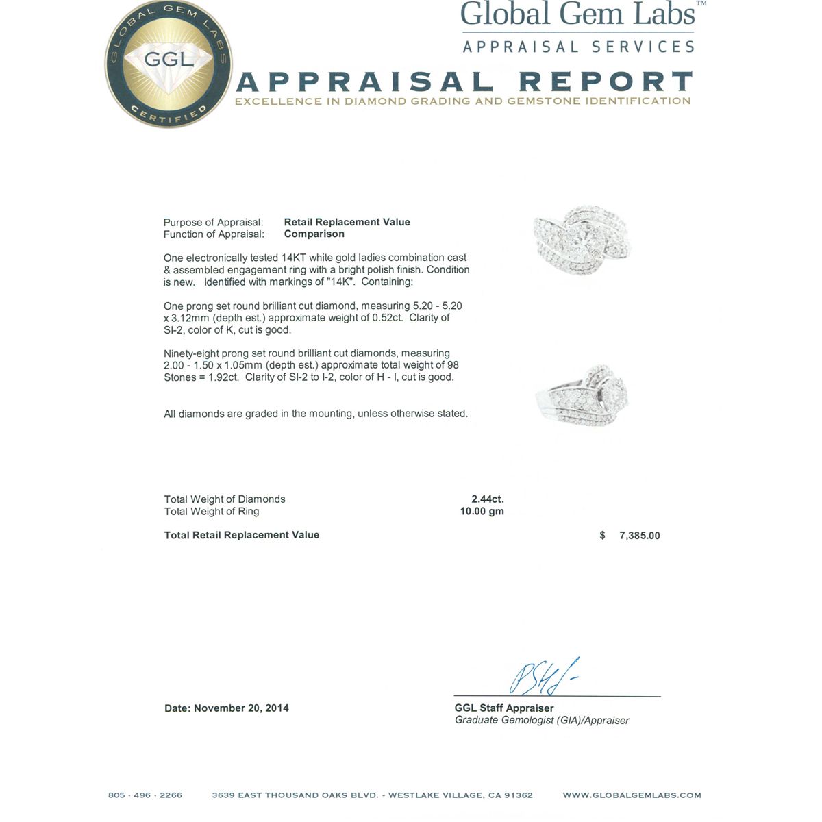 One electronically tested 14KT white gold ladies combination cast & assembled engagement ring with a bright polish finish. Identified with markings of "14K". Condition is new. Containing: One prong set round brilliant cut diamond, measuring 5.20 - 5.20 x 3.12mm (depth est.) approximate weight of 0.52ct. Clarity: SI-2. Color: K, Cut is Good. Ninety-Eight prong set round brilliant cut diamonds, measuring 2.00 - 1.50 x 1.05mm (depth est.) approximate total weight of 98 Stones = 1.92ct. Clarity: SI-2 to I-2. Color: H - I, Cut is Good. All diamonds are graded in the mounting, unless otherwise stated. Total Weight of Diamonds 2.44ct. Total Weight of Ring 10.00 grams. GGL Appraised at $7,385.00.