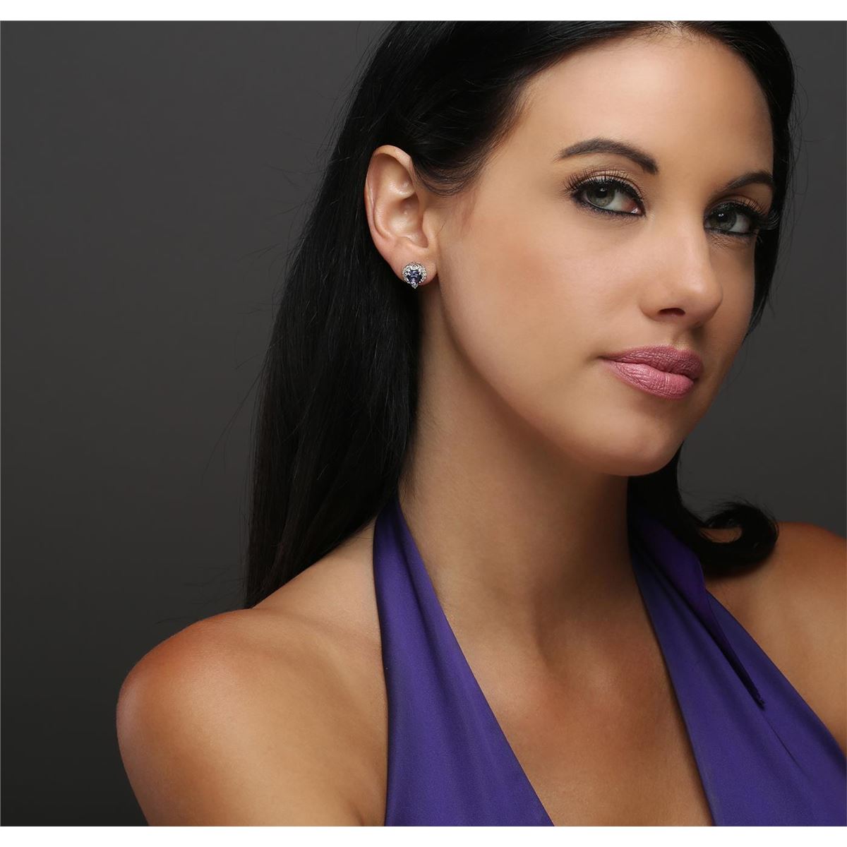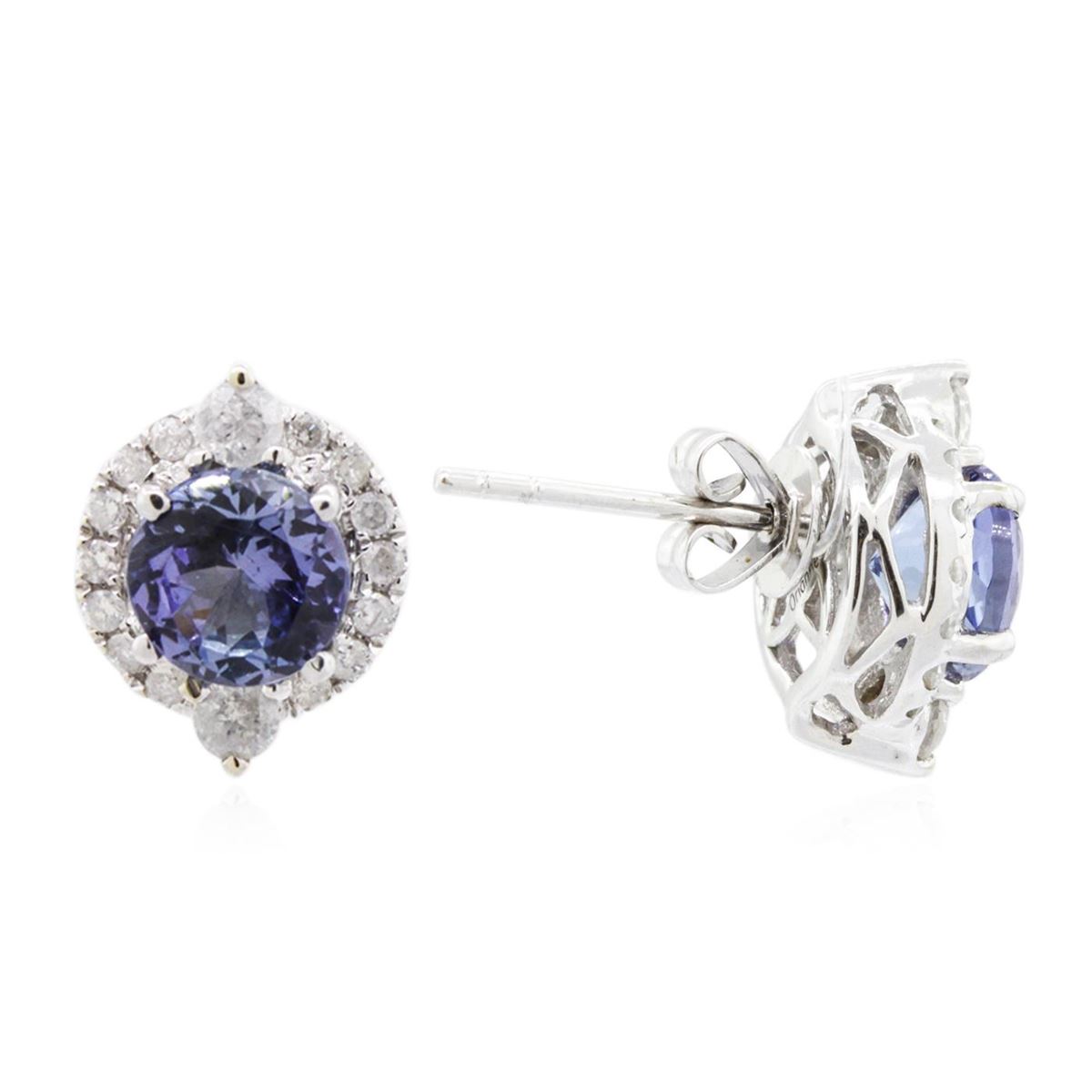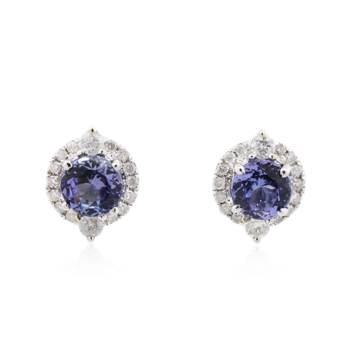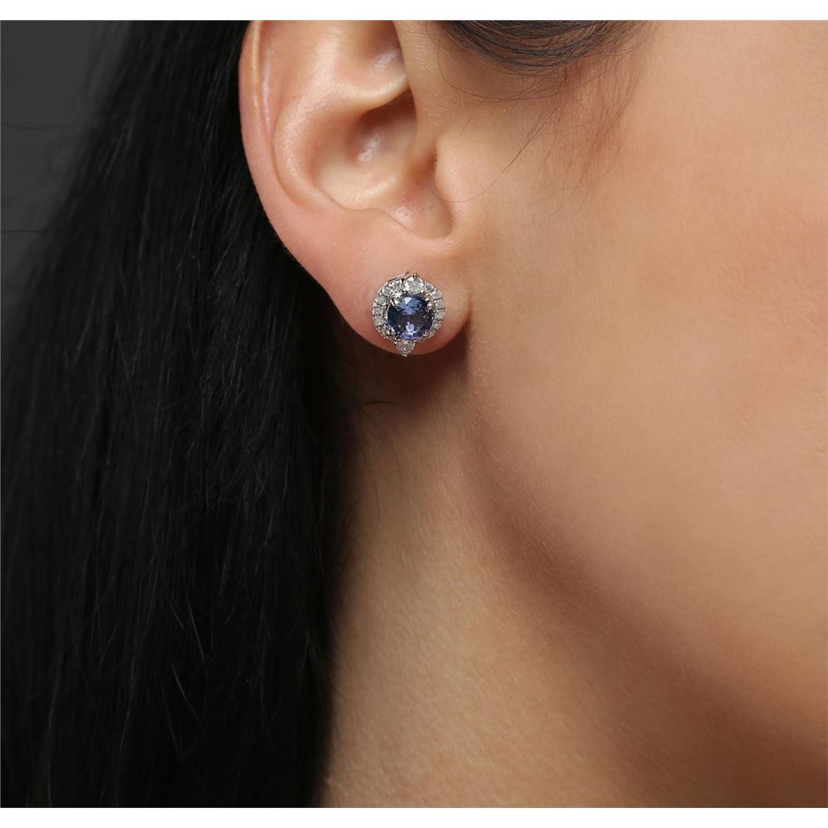 One pair electronically tested 14KT white gold ladies cast & assembled tanzanite & diamond earrings with standard backs. Each earring features a tanzanite set within a tiered diamond bezel. Trademark is Orianne. Identified with markings of "14K". Condition is good. Containing: Two prong set round mixed cut natural tanzanites, measuring 6.50 - 6.30 x 4.00 mm, 8% bulge factor, approximate total weight of 2.44ct., clarity is eye clean, type I, dark, slightly grayish, violetish blue color, (GIA vB 7/2), cut is good. Measurements are an average for the pair. Transmitting light with no distortion, transparent. Graded in the setting. Tanzanite is a very rare gemstone that is only found in the country of Tanzania. Originally discovered in 1967. Tiffany & Company, named the stone Tanzanite. It is found in the Usumburu Mountains that border the Umba Valley of northern Tanzania. Tanzanite occurs in gray, brown, violet, blue, reddish-purple, & green. The gem is interesting because of its exceptional pleochroism. Rotated in different directions a tanzanite will exhibit multiple changes of color. Tanzanite has a low tolerance to ultrasonic cleaning, and should not be cleaned using this method. Four prong set round brilliant cut diamonds, measuring 2.60 - 2.50 x 1.53mm (depth est.) approximate total weight of 4 Stones = 0.24ct. Graded in the setting. Clarity: I-1 to I-2. Color: H - J Twenty-Eight prong set round brilliant cut diamonds, measuring 1.35 - 1.30 x 0.80mm (depth est.) approximate total weight of 28 Stones = 0.24ct. Graded in the setting. Clarity: I-1 to I-3. Color: H - I. Total Weight of Colored Stones 2.44ct. Total Weight of Diamonds 0.48ct. Total Weight of Earrings 3.30gm. AIG Appraised at $4,950.00.