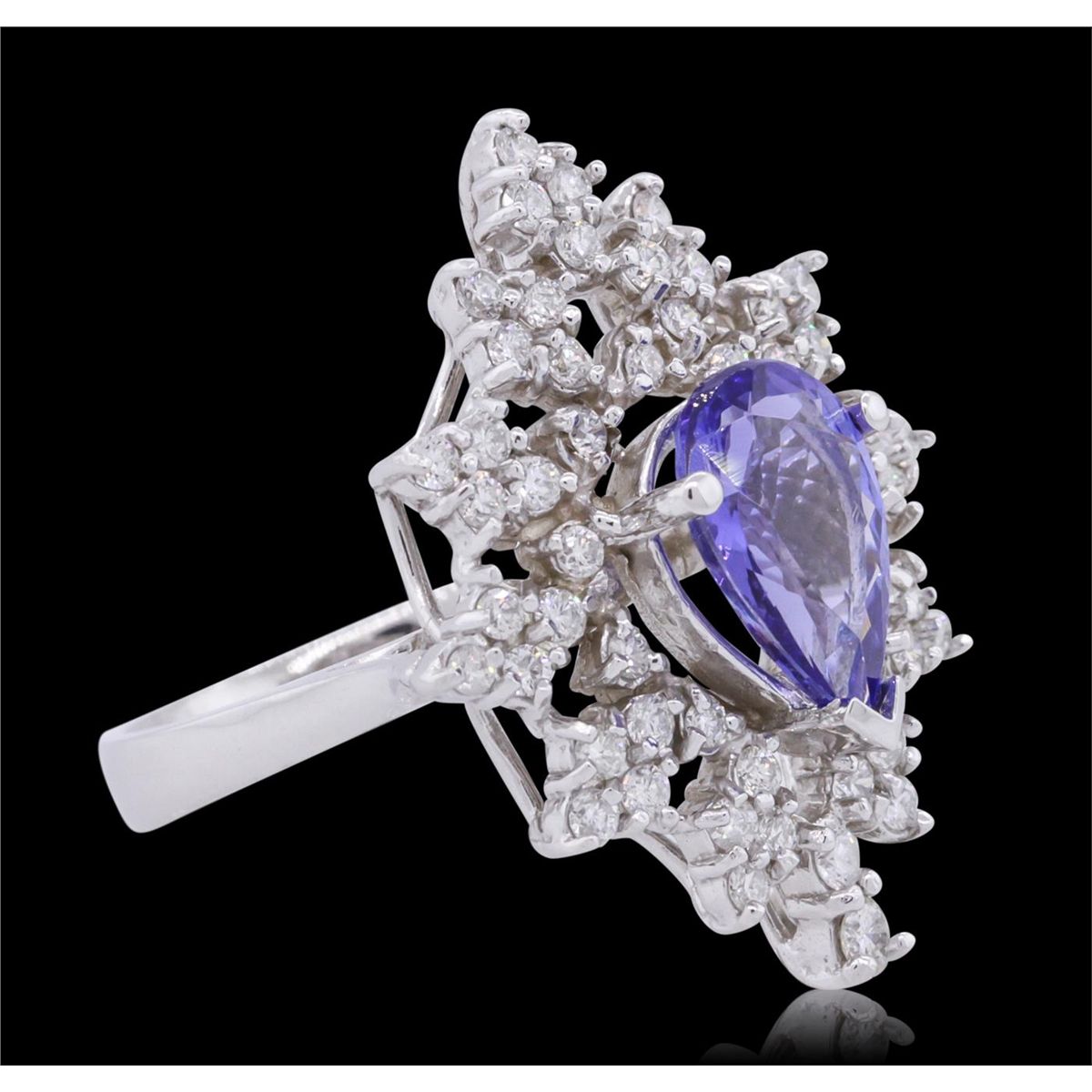 One electronically tested 14KT white gold ladies combination cast & assembled tanzanite and diamond ring with a bright polish finish. Identified with markings of "K14". Condition is new. Containing: One prong set pear modified brilliant cut natural tanzanite, measuring 10.00 x 7.50 x 4.88mm, approximate weight of 2.45ct., clarity is eye clean, type I, medium, moderately strong, violet color, (GIA V 5/4), cut is good. Fifty-Five prong set round brilliant cut diamonds, measuring 1.50 - 1.30 x 0.84mm (depth est.) approximate total weight of 55 Stones = 0.55ct. Clarity: SI-2 to I-1. Color: H - I, Cut is Good. Colored gemstones are presumed to have been subjected to commonly used enhancement processes. All diamonds and colored gemstones are graded in the mounting, unless otherwise stated. Total Weight of Colored Stones 2.45ct. Total Weight of Diamonds 0.55ct. Total Weight of Ring 7.10 grams. GGL Appraised at $5,680.00.