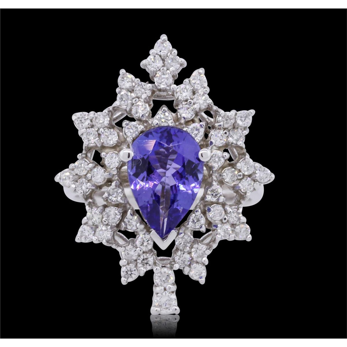 One electronically tested 14KT white gold ladies combination cast & assembled tanzanite and diamond ring with a bright polish finish. Identified with markings of "K14". Condition is new. Containing: One prong set pear modified brilliant cut natural tanzanite, measuring 10.00 x 7.50 x 4.88mm, approximate weight of 2.45ct., clarity is eye clean, type I, medium, moderately strong, violet color, (GIA V 5/4), cut is good. Fifty-Five prong set round brilliant cut diamonds, measuring 1.50 - 1.30 x 0.84mm (depth est.) approximate total weight of 55 Stones = 0.55ct. Clarity: SI-2 to I-1. Color: H - I, Cut is Good. Colored gemstones are presumed to have been subjected to commonly used enhancement processes. All diamonds and colored gemstones are graded in the mounting, unless otherwise stated. Total Weight of Colored Stones 2.45ct. Total Weight of Diamonds 0.55ct. Total Weight of Ring 7.10 grams. GGL Appraised at $5,680.00.