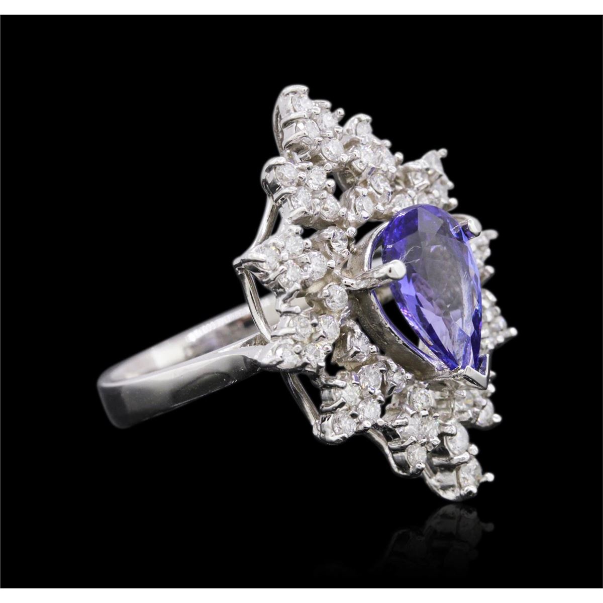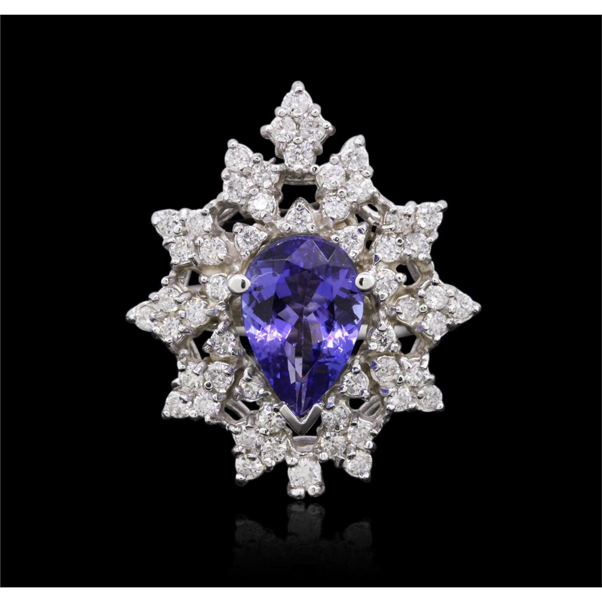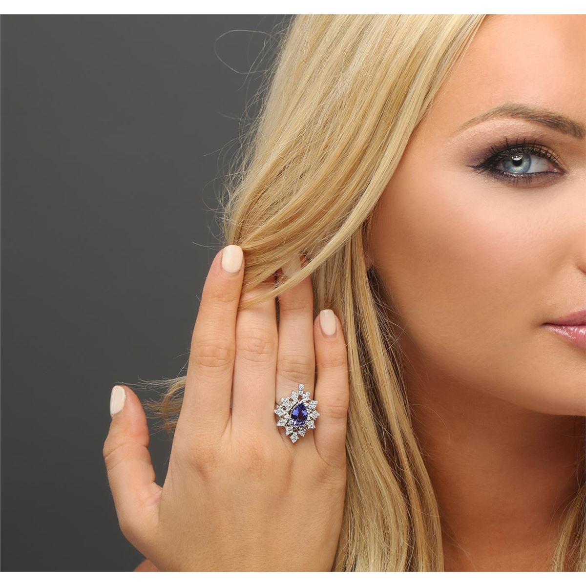 One electronically tested 14KT white gold ladies combination cast & assembled tanzanite and diamond ring with a bright polish finish. Identified with markings of "K14". Condition is new. Containing: One prong set pear modified brilliant cut natural tanzanite, measuring 10.00 x 7.50 x 4.88mm, approximate weight of 2.45ct., clarity is eye clean, type I, medium, moderately strong, violet color, (GIA V 5/4), cut is good. Fifty-Five prong set round brilliant cut diamonds, measuring 1.50 - 1.30 x 0.84mm (depth est.) approximate total  weight of 55 Stones = 0.55ct. Clarity: SI-2 to I-1. Color: H - I, Cut is Good. Colored gemstones are presumed to have been subjected to commonly used enhancement processes. All diamonds and colored gemstones are graded in the mounting, unless otherwise stated. Total Weight of Colored Stones 2.45ct. Total Weight of Diamonds 0.55ct. Total Weight of Ring 7.10 grams. GGL Appraised at $5,680.00.
