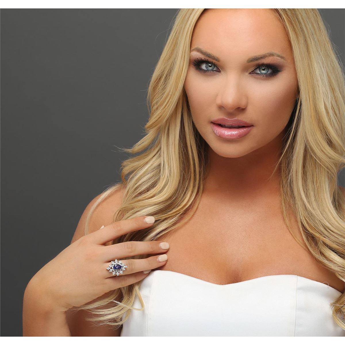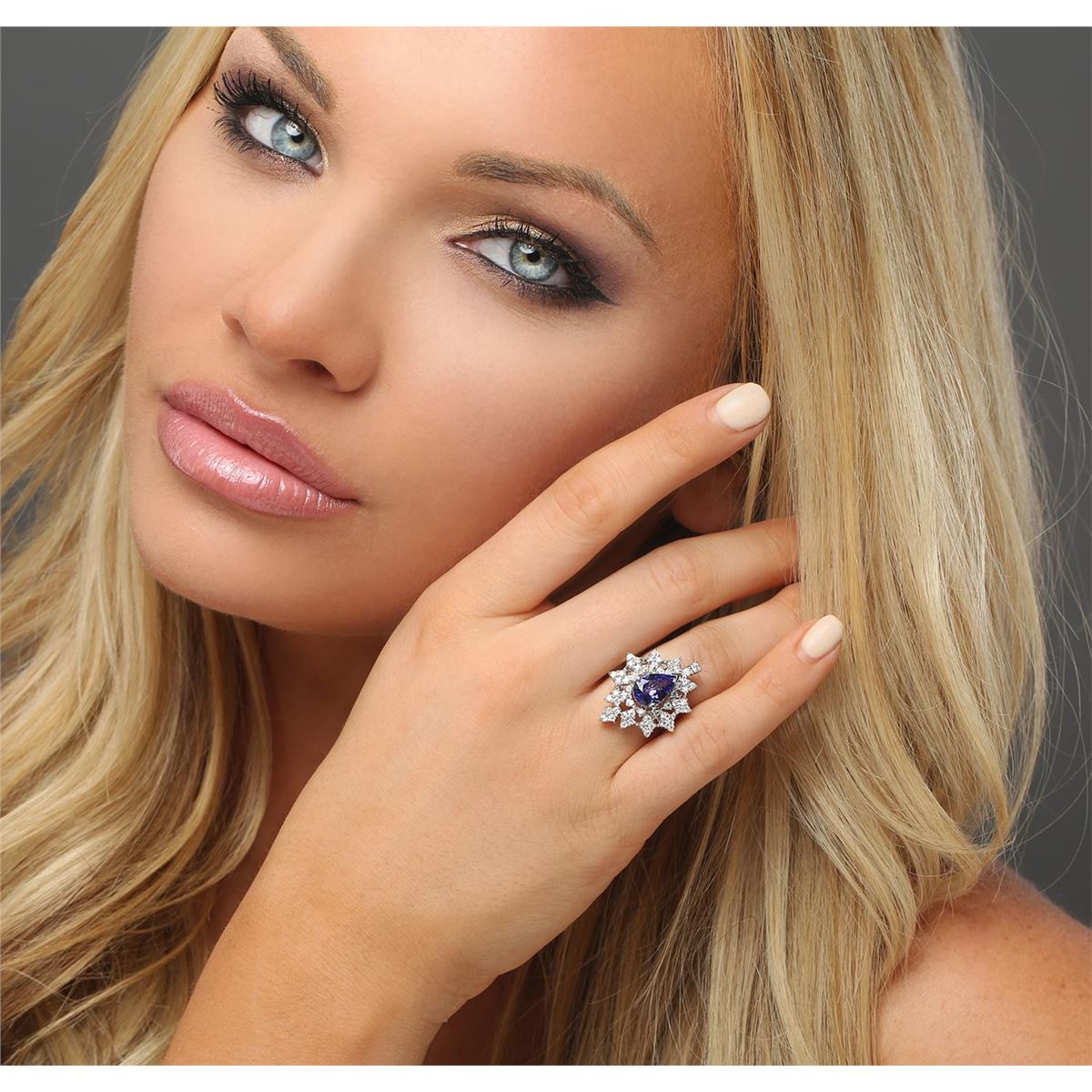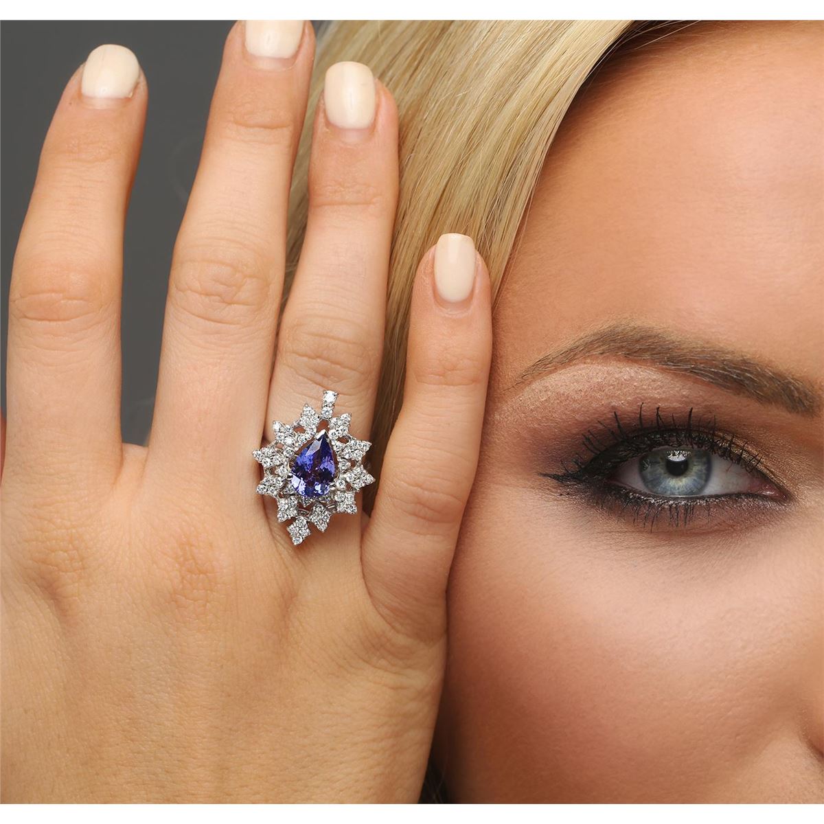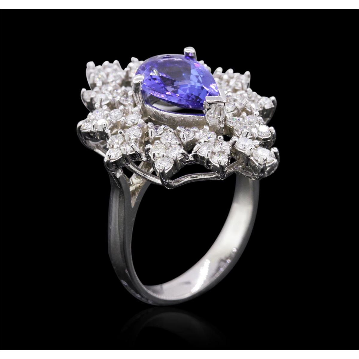 One electronically tested 14KT white gold ladies combination cast & assembled tanzanite and diamond ring with a bright polish finish. Identified with markings of "K14". Condition is new. Containing: One prong set pear modified brilliant cut natural tanzanite, measuring 10.00 x 7.50 x 4.88mm, approximate weight of 2.45ct., clarity is eye clean, type I, medium, moderately strong, violet color, (GIA V 5/4), cut is good. Fifty-Five prong set round brilliant cut diamonds, measuring 1.50 - 1.30 x 0.84mm (depth est.) approximate total  weight of 55 Stones = 0.55ct. Clarity: SI-2 to I-1. Color: H - I, Cut is Good. Colored gemstones are presumed to have been subjected to commonly used enhancement processes. All diamonds and colored gemstones are graded in the mounting, unless otherwise stated. Total Weight of Colored Stones 2.45ct. Total Weight of Diamonds 0.55ct. Total Weight of Ring 7.10 grams. GGL Appraised at $5,680.00.