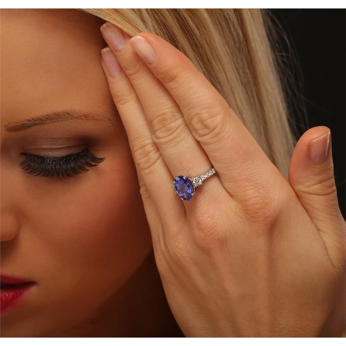 One electronically tested 14KT white gold ladies combination cast & assembled ring with a bright polish finish. Condition is new. Identified with markings of "14K". Containing: One prong set oval modified brilliant cut natural tanzanite, measuring 11.00 x 6.70 x 4.69mm, approximate weight of 2.46ct., clarity is eye clean, type I, medium, moderately strong, bluish violet color, (GIA bV 5/4), cut is good. Two prong set round brilliant cut diamonds, measuring 3.50 - 3.50 x 2.10mm (depth est.) approximate total weight of 2 Stones = 0.31ct. Clarity: I-1 to I-2. Color: J - K, Cut is Good. Twenty prong set round brilliant cut diamonds, measuring 1.70 - 1.70 x 1.02mm (depth est.) approximate total weight of 20 Stones = 0.36ct. Clarity: I-1 to I-2. Color: H - I, Cut is Good. Colored gemstones are presumed to have been subjected to commonly used enhancement processes. All diamonds and colored gemstones are graded in the mounting, unless otherwise stated. Total Weight of Colored Stones 2.46ct. Total Weight of Diamonds 0.67ct. Total Weight of Ring 3.90 grams. GGL Appraised at $6,435.00.