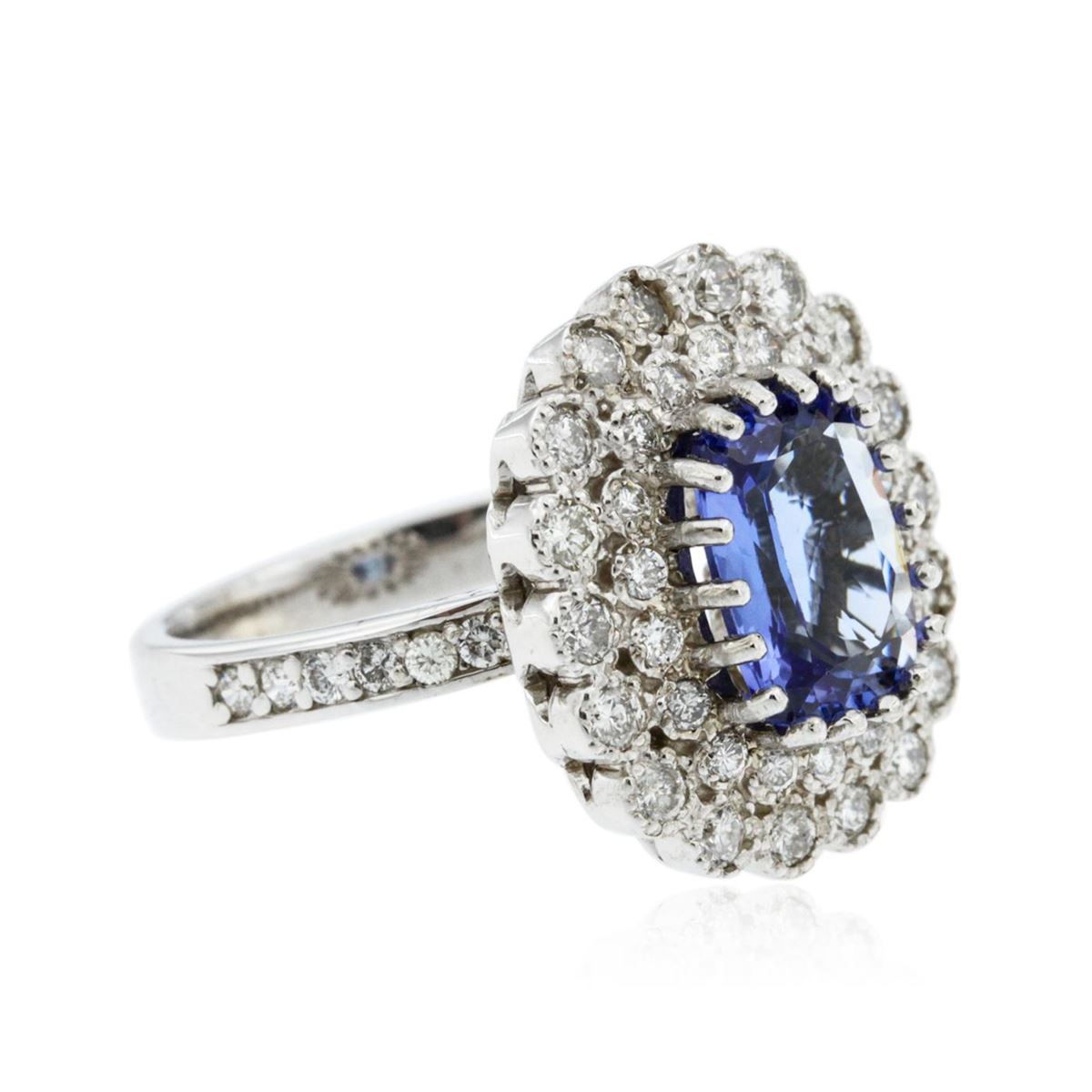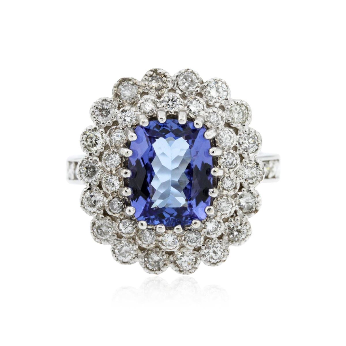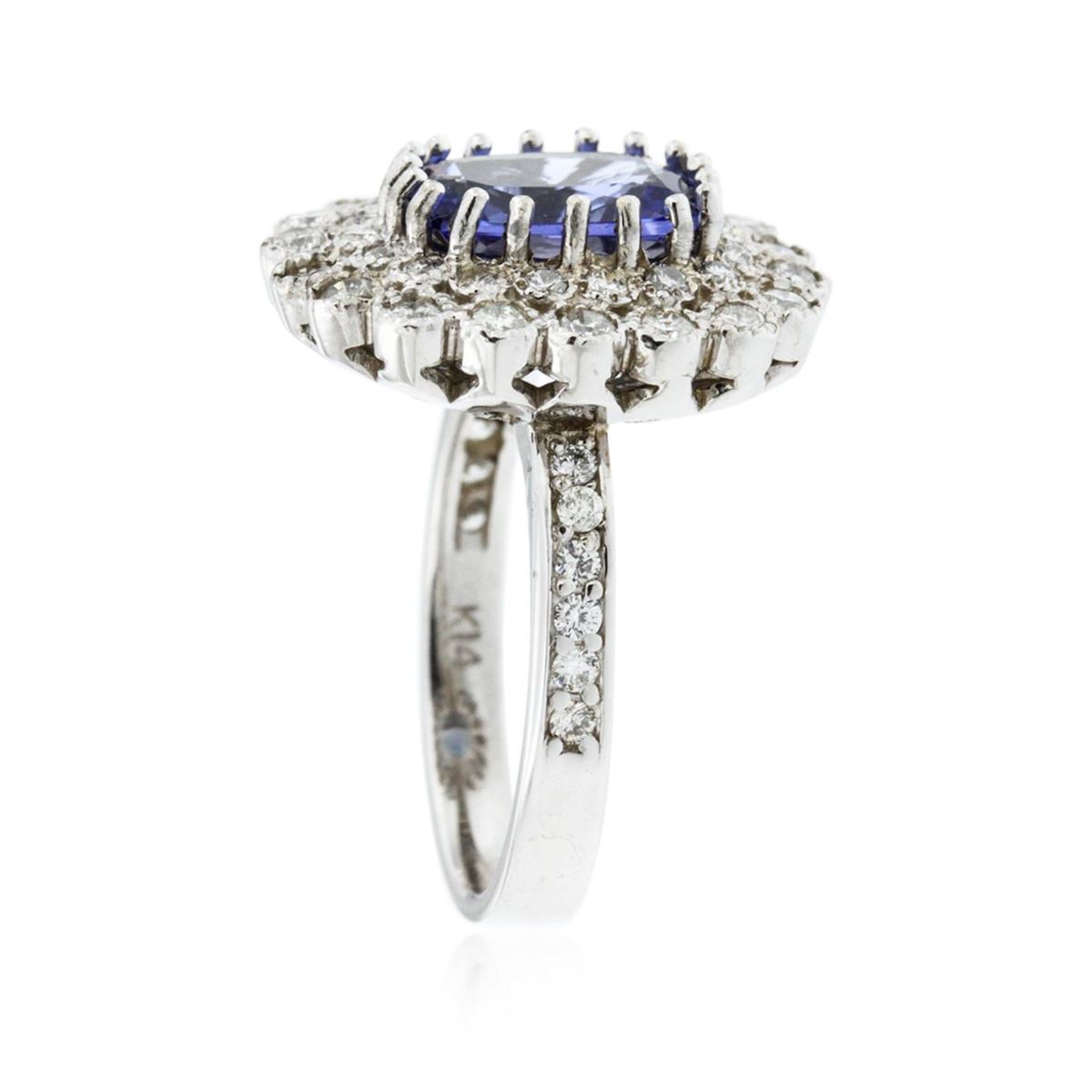 One electronically tested 14KT white gold Ladies combination cast & assembled ring with a bright polish finish. Condition is new. Identified with markings of "K14". Containing: One prong set rectangular cushion modified brilliant cut natural tanzanite, measuring 10.00 x 8.00 x 3.90mm, approximate weight of 2.46ct., clarity is eye clean, type I, medium light, very slightly grayish, violet color, (GIA V 4/3), cut is very good. Colored gemstones are presumed to have been subjected to commonly used color/clarity enhancement processes. Forty-Eight prong set round brilliant cut diamonds, measuring 1.80 - 1.50 x 0.55mm (depth est.) approximate. Total Weight of 48 Stones = 0.44ct. Clarity: I-1 to I-2. Color: J - K, Cut is Good. Total Weight of Colored Stones 2.46ct. Total Weight of Diamonds 0.44ct. Total Weight of Ring 7.20 grams. GGL Appraised at $6,265.00.