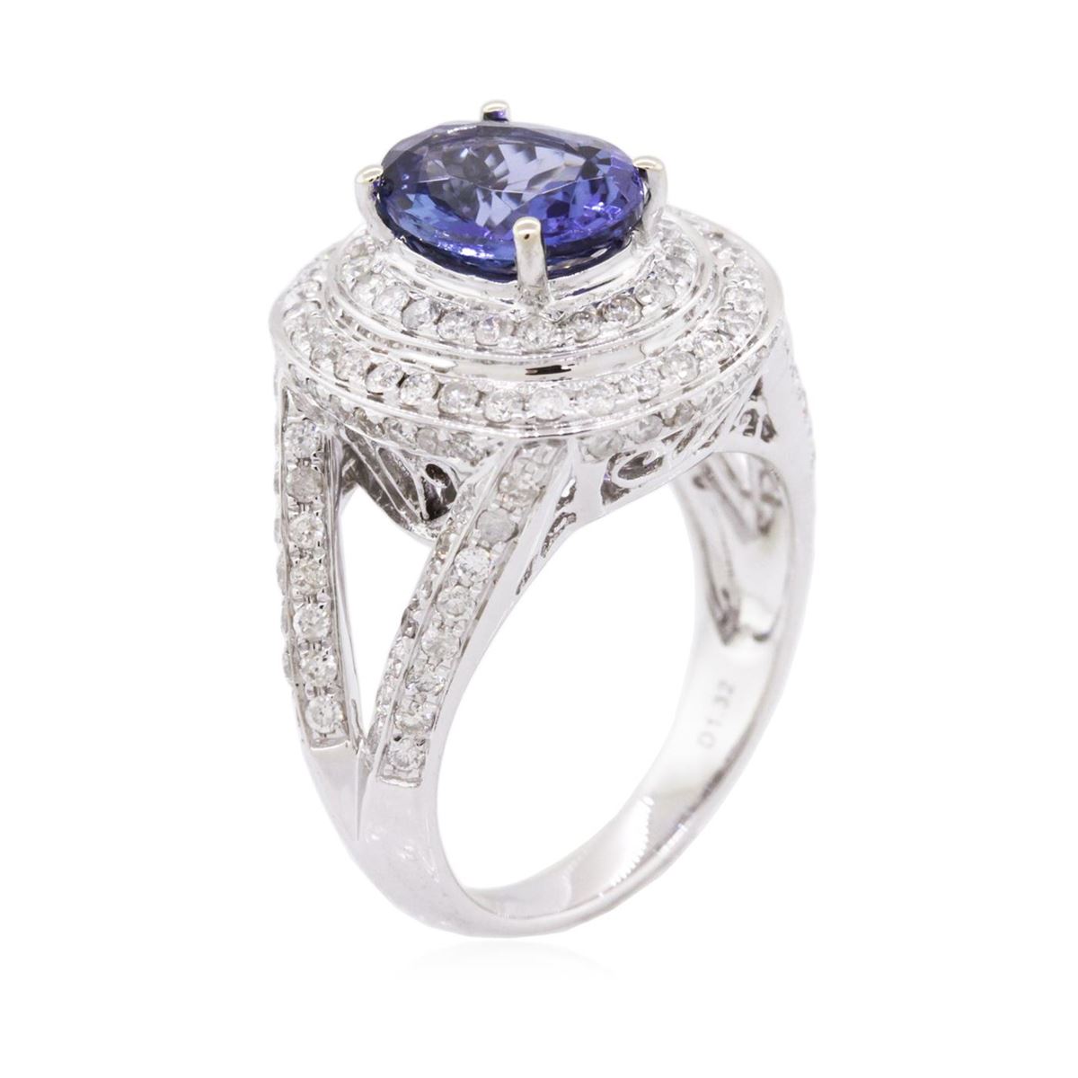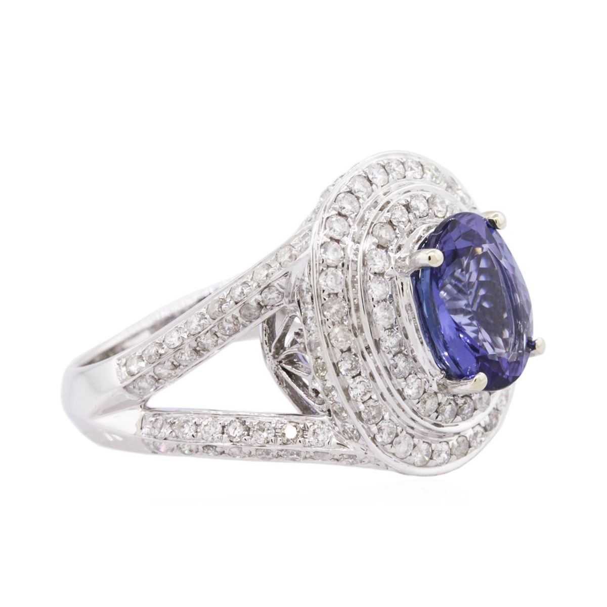 One electronically tested 14KT white gold ladies combination cast & assembled tanzanite and diamond ring with a split shank with a bright polish finish. Identified with markings of "14K". Condition is new. Containing: One prong set oval modified brilliant cut natural tanzanite, measuring 9.78 x 7.54 x 4.90mm, approximate weight of 2.46ct., clarity is eye clean, type I, medium, moderately strong, violet color, (GIA V 5/4), cut is good. One Hundred Twenty-Six prong set round brilliant cut diamonds, measuring 1.20 - 1.20 x 0.72mm (depth est.) approximate total weight of 126 Stones = 0.79ct. Clarity: I-1 to I-2. Color: I - J, Cut is Good. Colored gemstones are presumed to have been subjected to commonly used enhancement processes. All diamonds and colored gemstones are graded in the mounting, unless otherwise stated. Total Weight of Colored Stones 2.46ct. Total Weight of Diamonds 0.79ct. Total Weight of Ring 7.00 grams. GGL Appraised at $6,840.00.