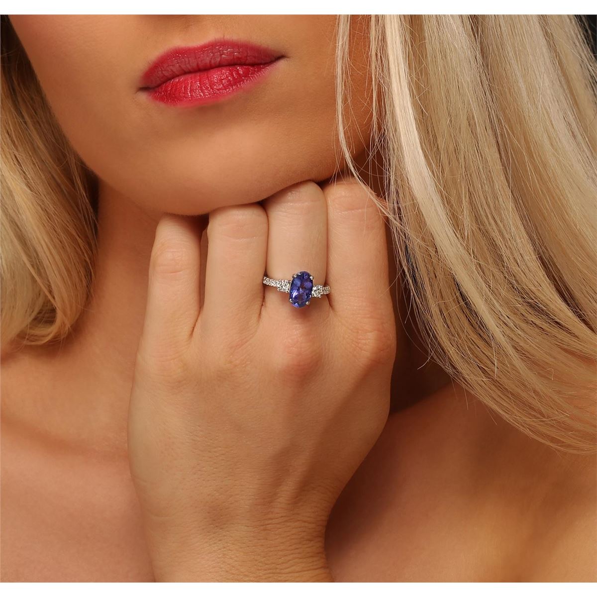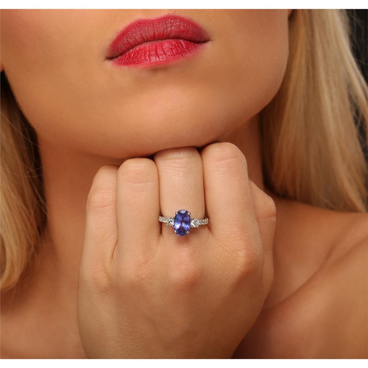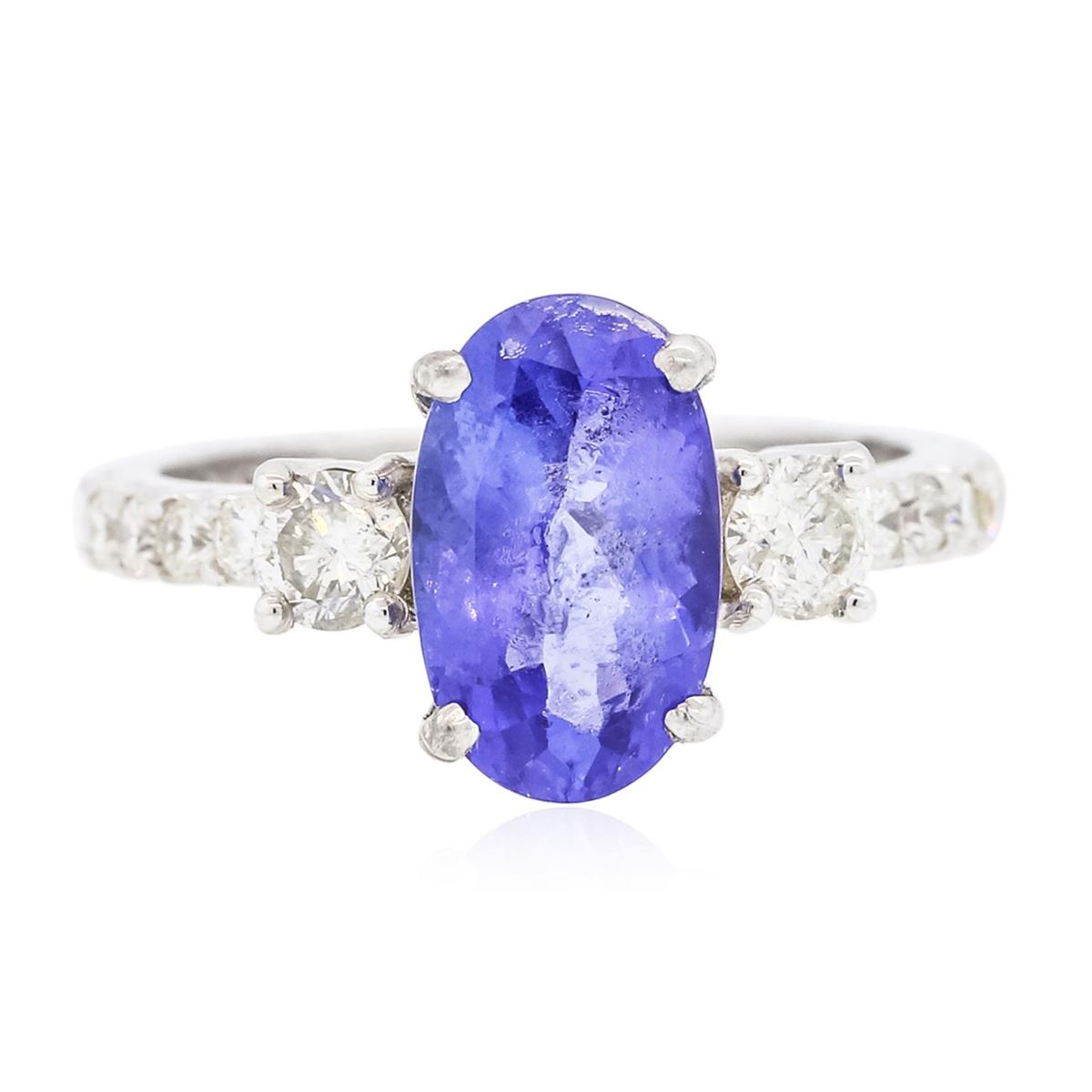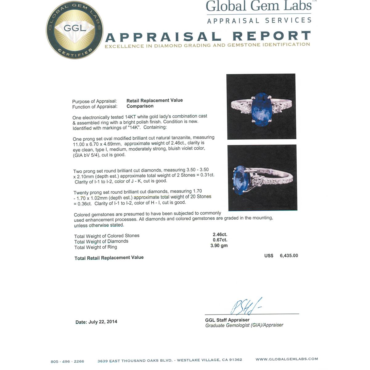One electronically tested 14KT white gold ladies combination cast & assembled ring with a bright polish finish. Condition is new. Identified with markings of "14K". Containing: One prong set oval modified brilliant cut natural tanzanite, measuring 11.00 x 6.70 x 4.69mm, approximate weight of 2.46ct., clarity is eye clean, type I, medium, moderately strong, bluish violet color, (GIA bV 5/4), cut is good. Two prong set round brilliant cut diamonds, measuring 3.50 - 3.50 x 2.10mm (depth est.) approximate total weight of 2 Stones = 0.31ct. Clarity: I-1 to I-2. Color: J - K, Cut is Good. Twenty prong set round brilliant cut diamonds, measuring 1.70 - 1.70 x 1.02mm (depth est.) approximate total weight of 20 Stones = 0.36ct. Clarity: I-1 to I-2. Color: H - I, Cut is Good. Colored gemstones are presumed to have been subjected to commonly used enhancement processes. All diamonds and colored gemstones are graded in the mounting, unless otherwise stated. Total Weight of Colored Stones 2.46ct. Total Weight of Diamonds 0.67ct. Total Weight of Ring 3.90 grams. GGL Appraised at $6,435.00.