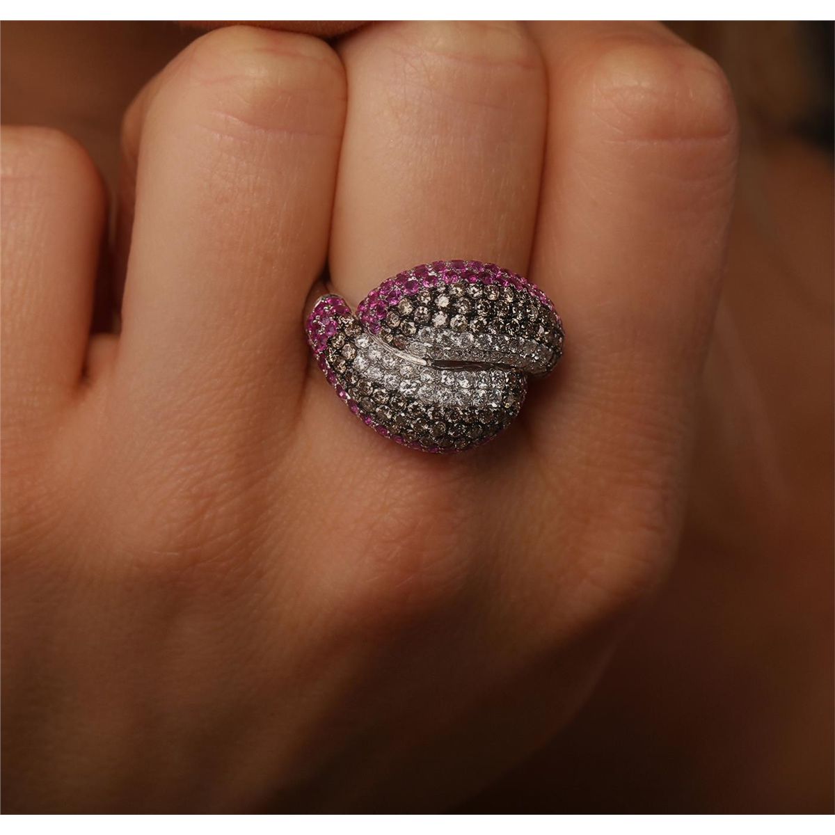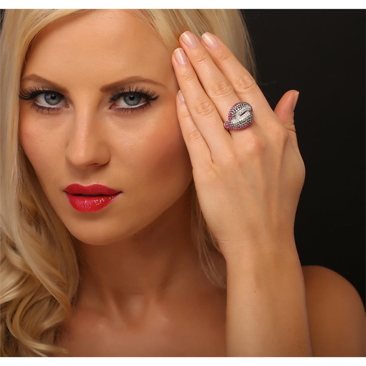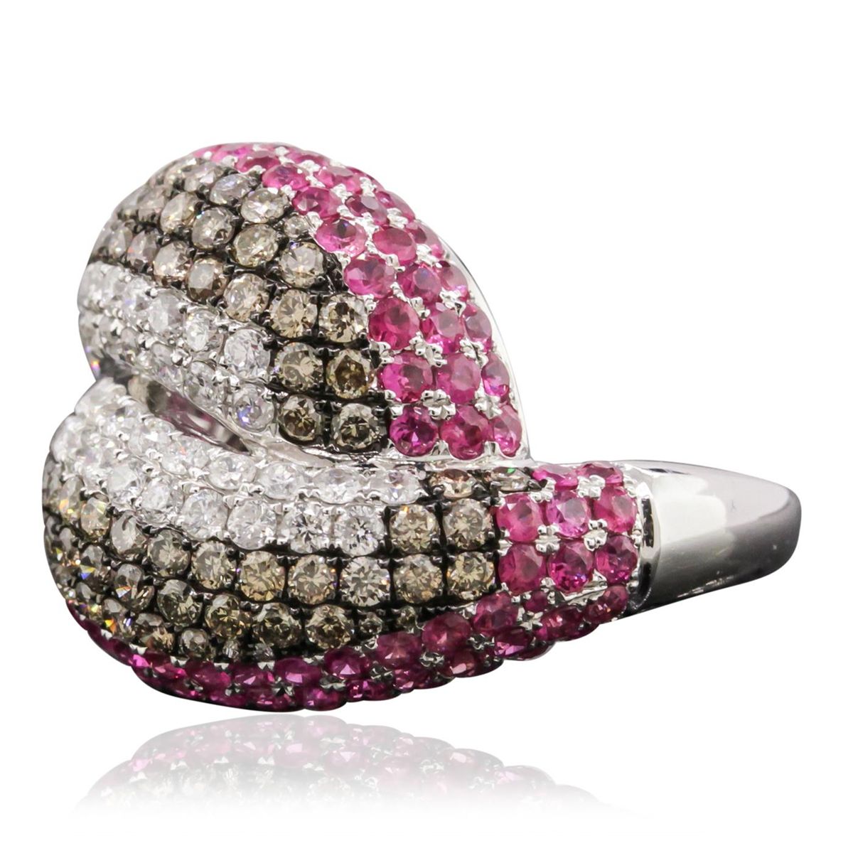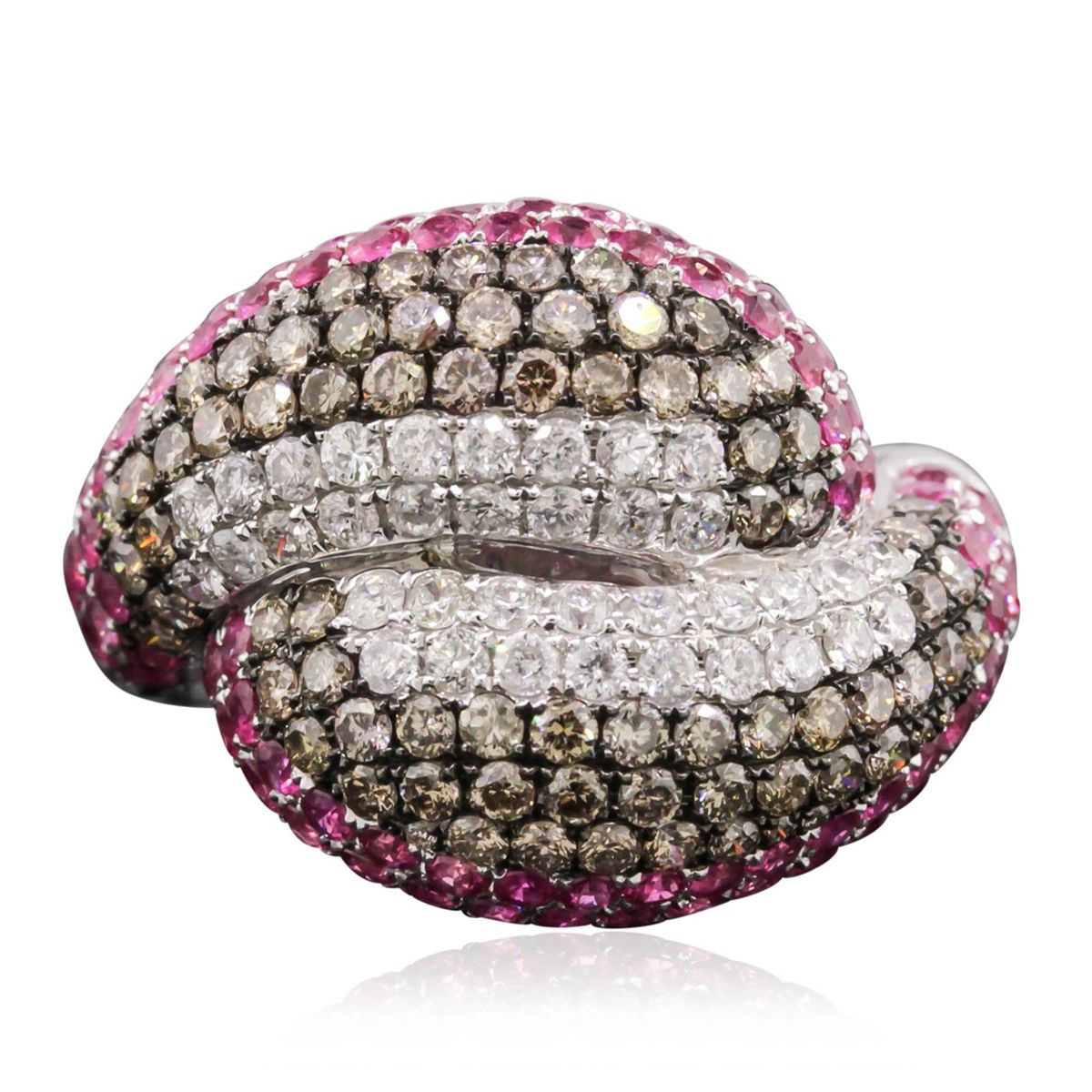 One electronically tested 14KT white gold ladies cast ruby and diamond ring with a bright and anodized finish. Condition is new, good workmanship. The ring features two mirroring ruby and diamond curvatures, completed by a two and one-half millimeter wide band. Trademark is CJ. Identified with markings of "14K". Containing: One hundred eighteen pave set round brilliant cut natural rubies, measuring 1.60 - 1.40 x 0.98 mm, approximate total weight of 2.46ct., clarity is moderately included, type II, very dark, moderately strong, slightly purplish red color, (GIA slpR 8/4), cut is good. Transmitting light somewhat diffusely, transparent to translucent. Naturally occurring internal & external characteristics are present. Measurements & the color grade are an average for the group. Graded in the setting. Thirty-Six pave set round brilliant cut diamonds, measuring 1.70 - 1.50 x 0.96mm (depth est.) approximate total weight of 36 Stones = 0.63ct. Graded in the setting. Clarity I-1 to I-2. Color H - J. Eighty pave set round brilliant cut diamonds, measuring 1.70 - 1.50 x 0.96mm (depth est.) approximate total weight of 80 Stones = 1.10ct. Color grade is an average for the group. Graded in the setting. Clarity SI-1 to I-1. Color fancy brown. Total Weight of Colored Stones 2.46 ct. Total Weight of Diamonds 1.73 ct. Total Weight of Ring 7.93 grams. AIG Appraised at $9,155.00.