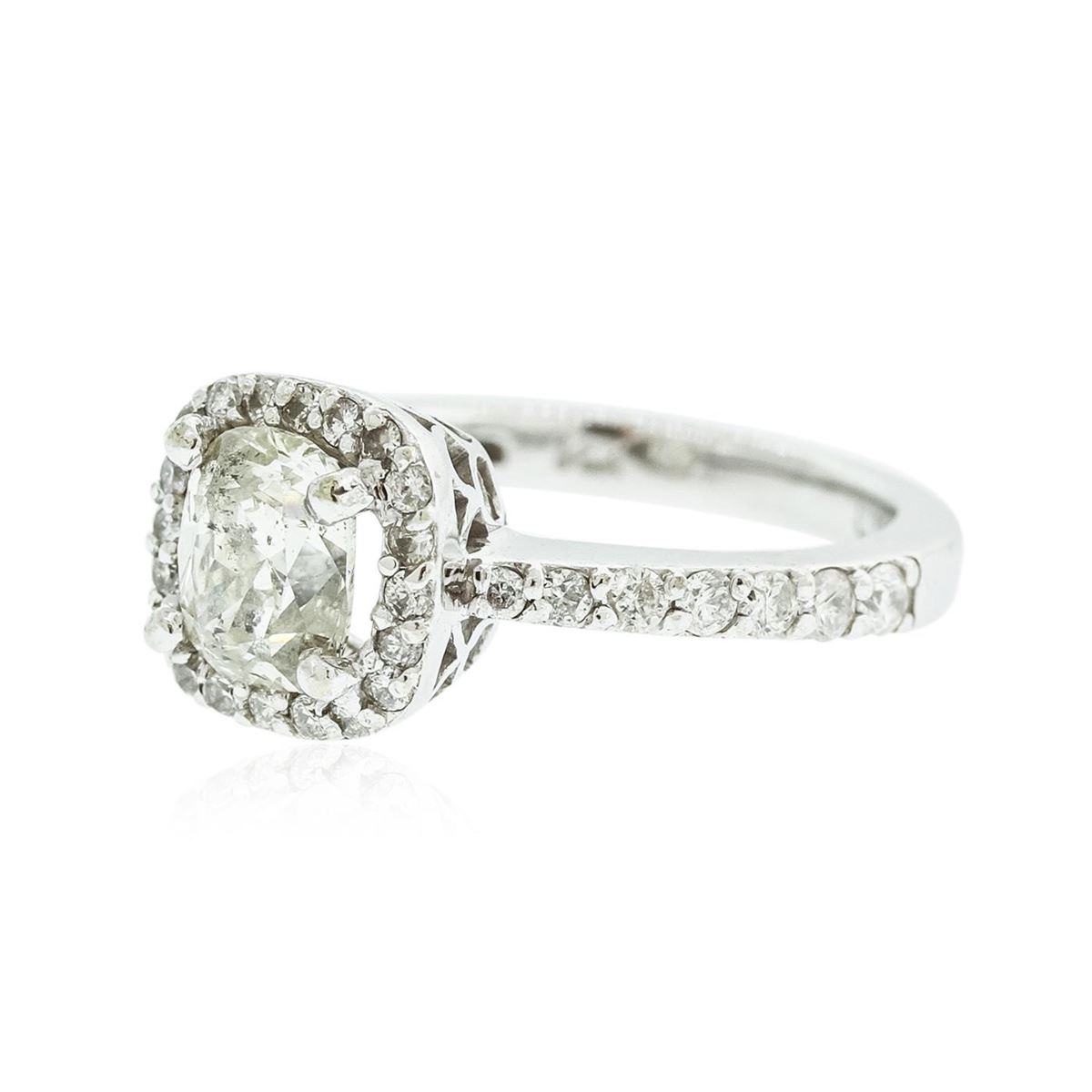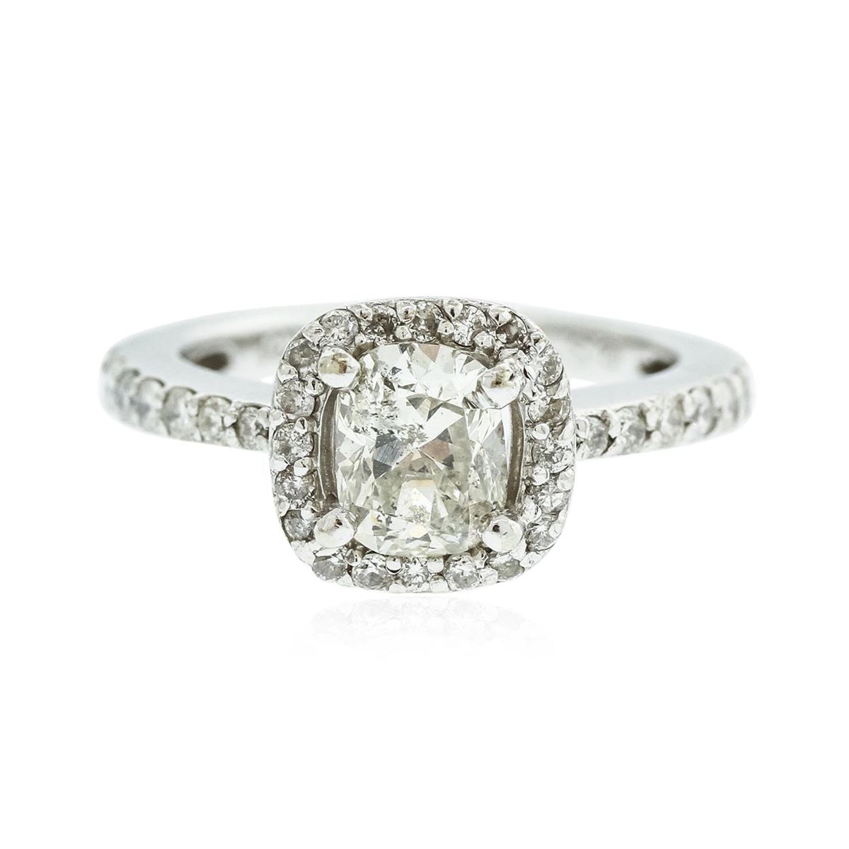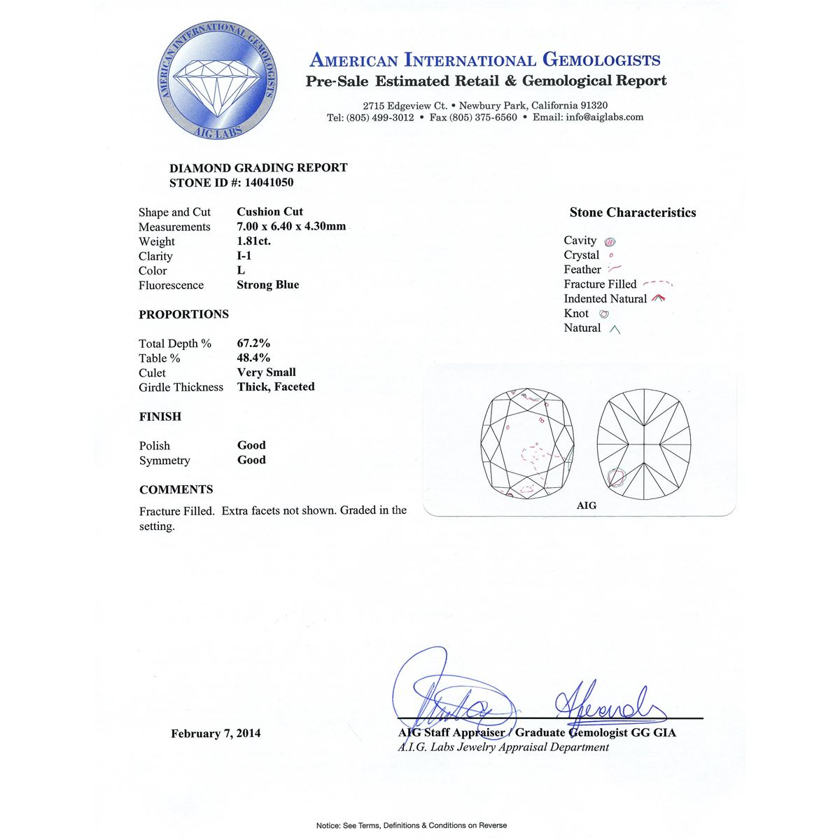 One electronically tested 14KT white gold ladies cast diamond ring with a bright polish finish. Condition is new, good workmanship. The featured diamond is set within a diamond bezel, supported by diamond set shoulders and completed by a two and one-half millimeter wide band. Identified with markings of "14K". Containing: One prong set cushion cut diamond, measuring 7.00 x 6.40 x 4.30mm approximate weight of 1.81ct, clarity enhanced with a strong blue fluorescence. Diamond Grading Report attached. Graded in the setting. Clarity: I-1. Color: L Depth 67.2%. Table 48.4%. Thirty-Four prong set round brilliant cut diamonds, measuring 2.00 - 1.50 x 1.05mm (depth est.) approximate. Total Weight of 34 Stones = 0.66ct. Graded in the setting. Clarity: SI-2 to I-1. Color: H - J. Total Weight of Diamonds 2.47ct. Total Weight of Ring 4.30 grams. AIG Appraised at $12,600.00.