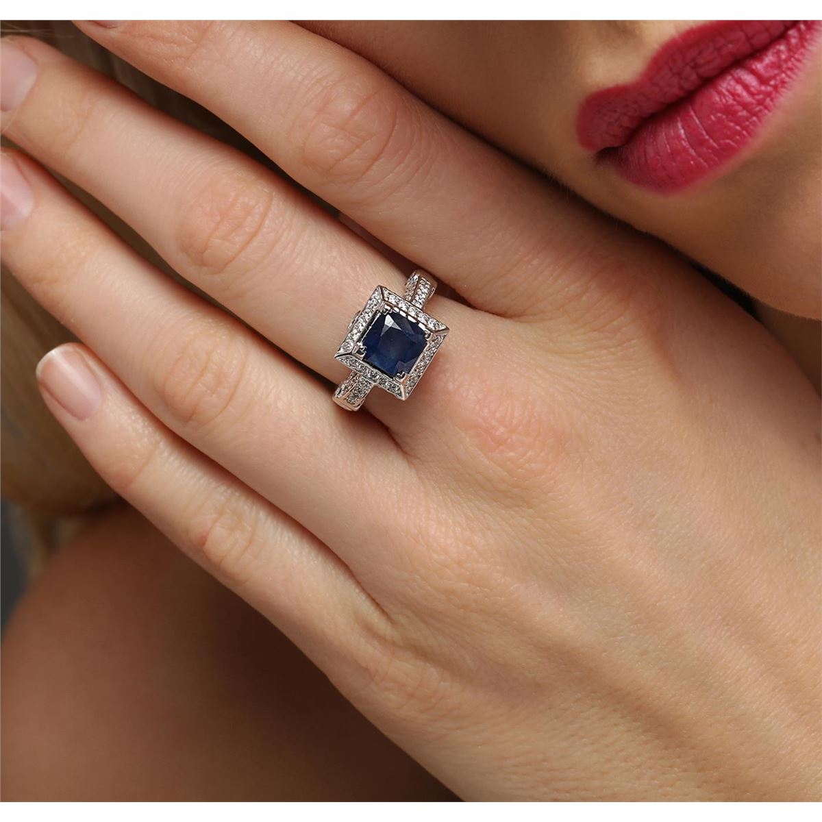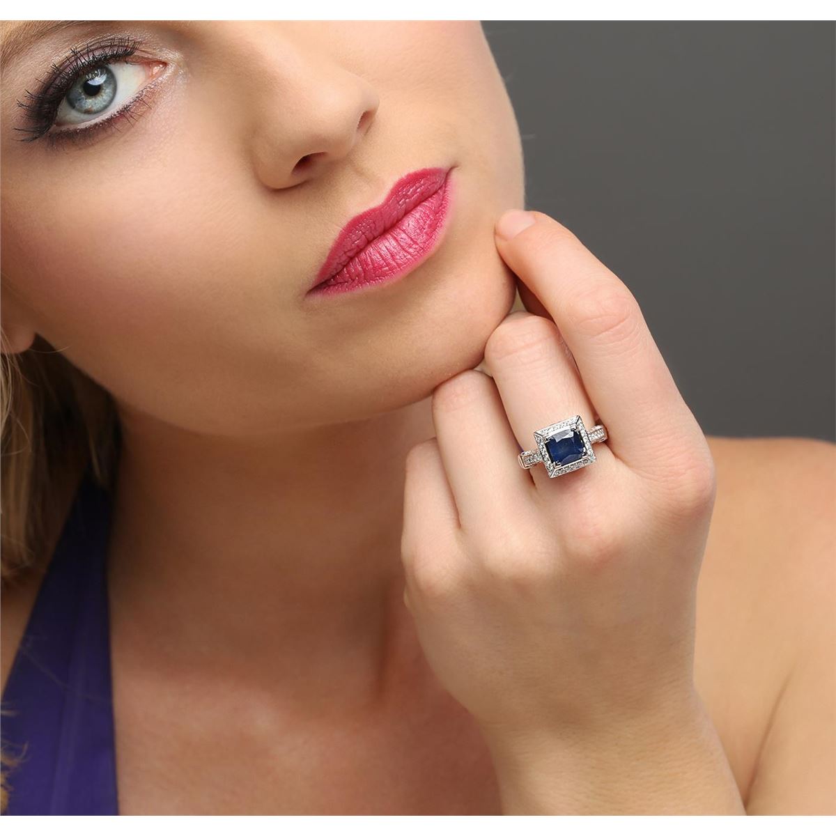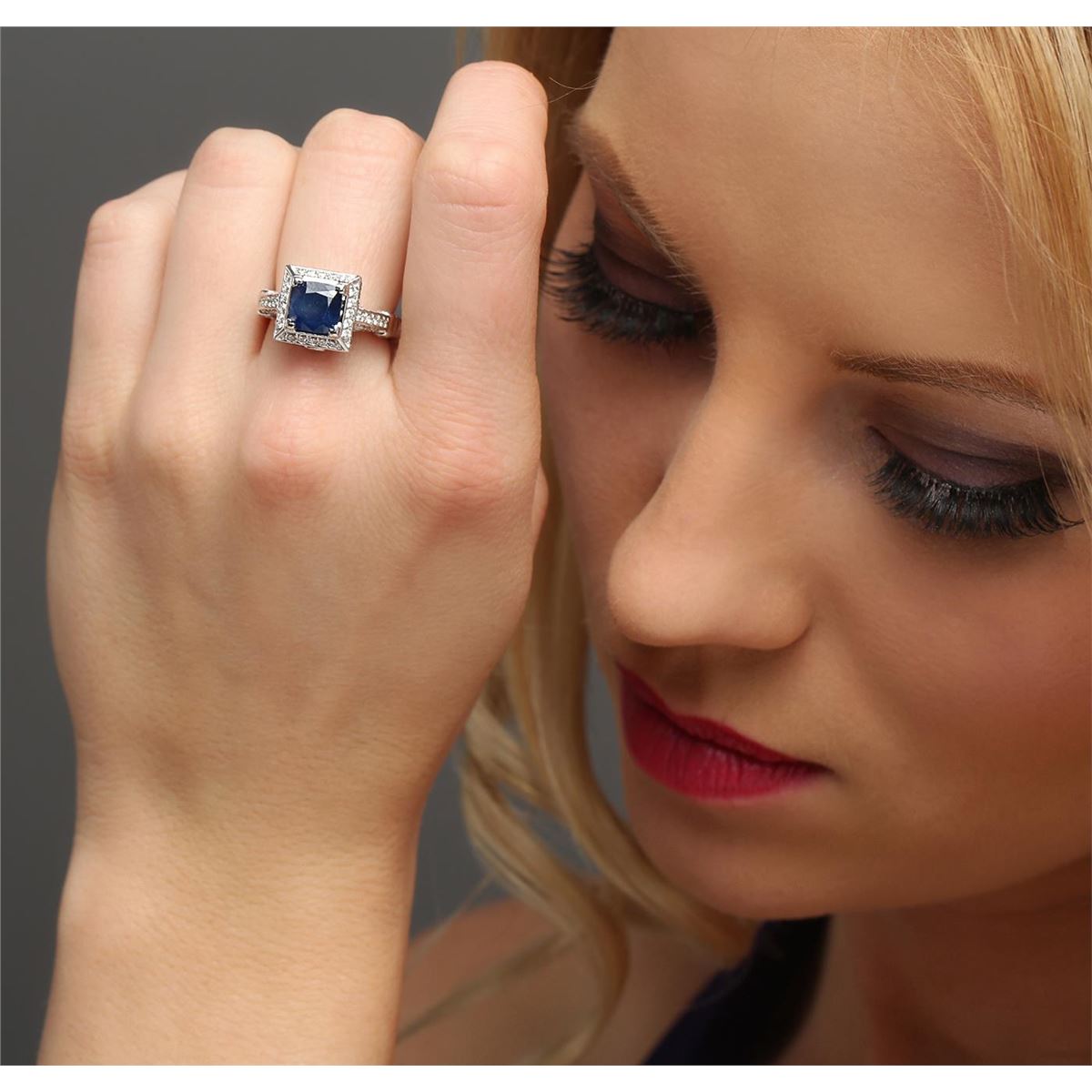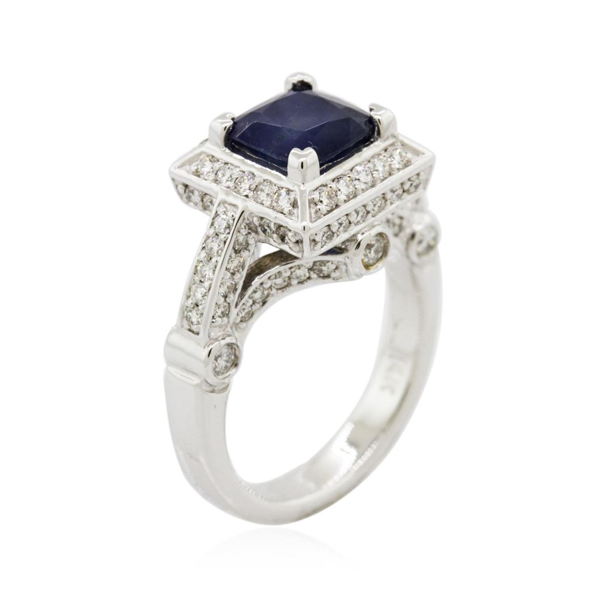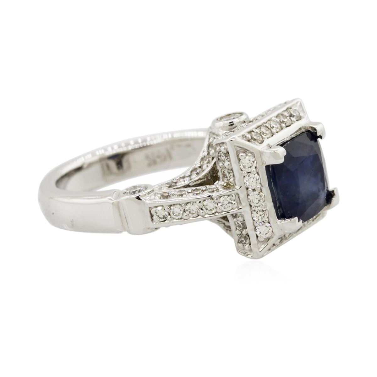 One electronically tested 14KT white gold ladies cast sapphire and diamond ring with a bright polish finish. The featured sapphire is set within a diamond bezel supported by an elaborate diamond set under gallery and diamond set shoulders, completed by a three and one-half millimeter wide band. Identified with markings of "14K". Condition is new, good workmanship. Containing: One prong set square cushion mixed cut natural blue sapphire, measuring 7.35 x 7.25 x 4.65mm, 6% bulge factor, approximate weight of 2.47ct., clarity is heavily included, type II, medium dark, very slightly grayish, violetish blue color, (GIA vB 6/3), cut is good. Transmitting light somewhat diffusely, translucent. Naturally occurring internal & external characteristics are present, including partial color zoning. Graded in the setting. Six bezel set round brilliant cut diamonds, measuring 2.30 - 2.20 x 1.35mm (depth est.) approximate total weight of 6 Stones = 0.25ct. Graded in the setting. Clarity: I-1. Color: G - I Eighty-Six prong set round brilliant cut diamonds, measuring 1.50 - 1.40 x 0.87mm (depth est.) approximate total weight of 86 Stones = 1.05ct. Graded in the setting. Clarity: VS-2 to SI-1. Color: G - I. Total Weight of Colored Stones 2.47ct. Total Weight of Diamonds 1.30ct. Total Weight of Ring 9.51 grams. AIG Appraised at $6,375.00.