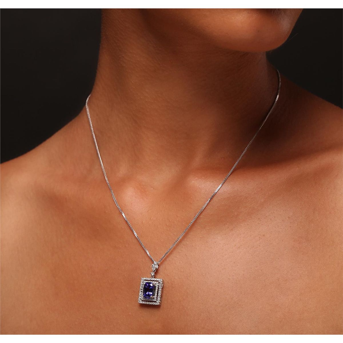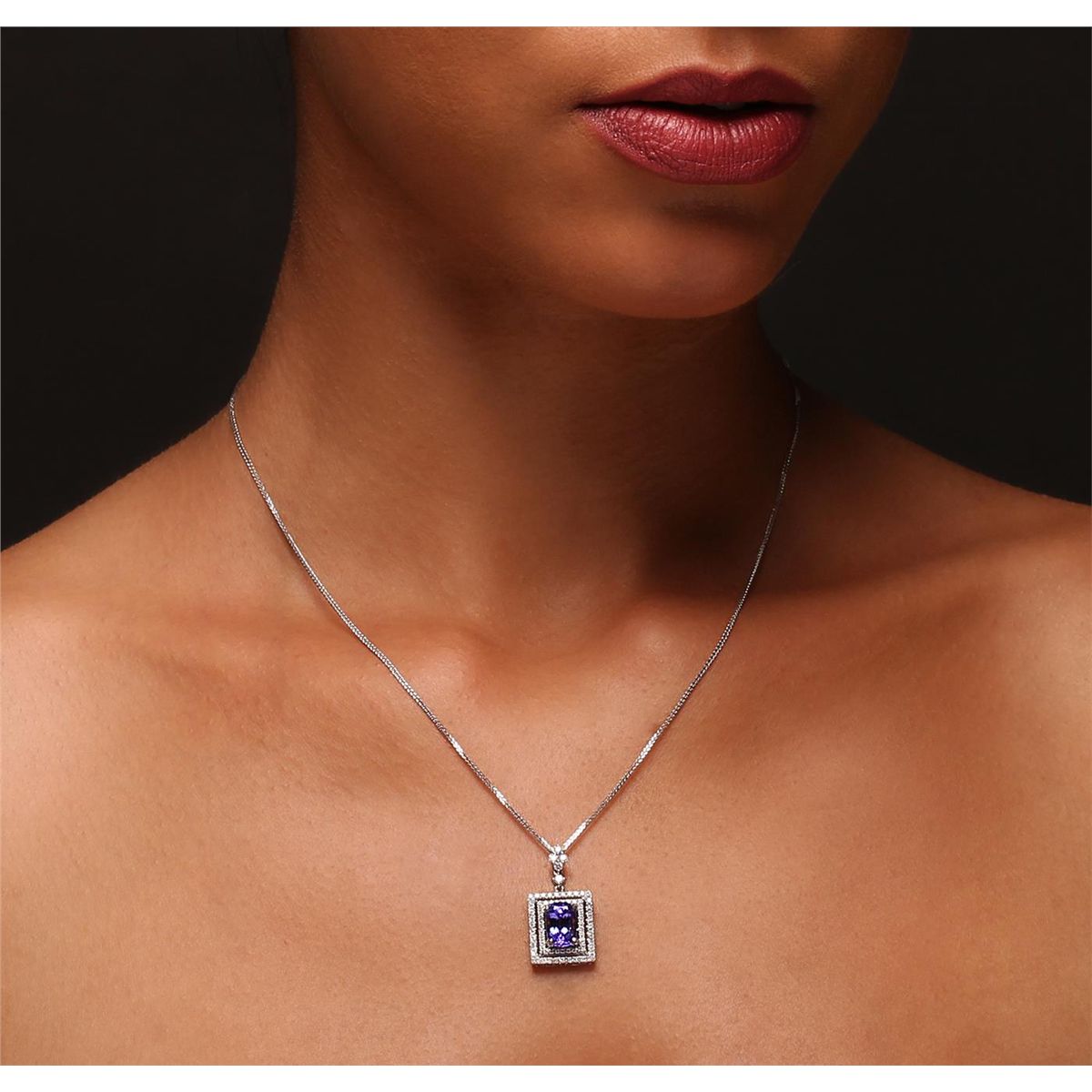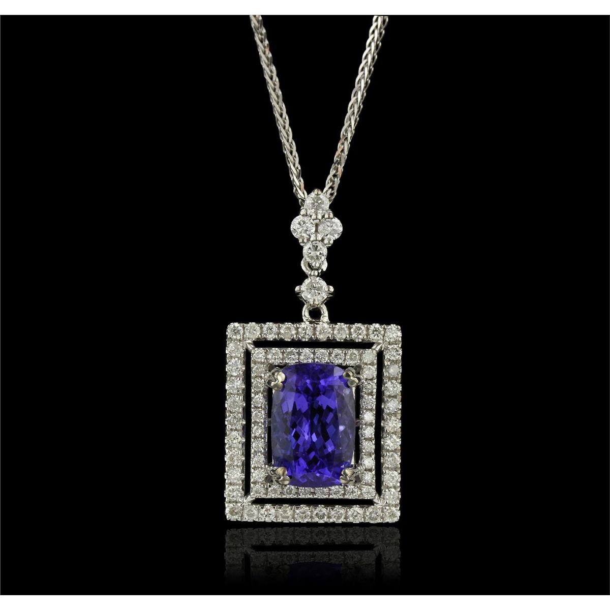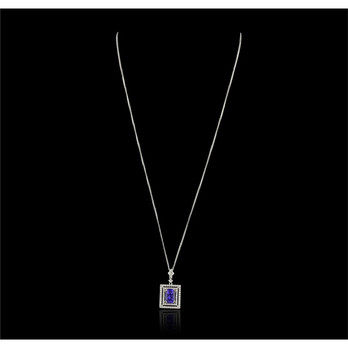 One electronically tested 14KT white gold Ladies combination cast & assembled pendant with a bright polish finish. Condition is new. Identified with markings of "14K". Containing: Five bead set round brilliant cut diamonds, measuring 1.90 - 1.90 x 1.14mm (depth est.) approximate. Total Weight of 5 Stones = 0.13ct. Clarity: SI-1 to SI-2. Color: H - I, Cut is Good. Thirty-Five prong set round brilliant cut diamonds, measuring 1.00 - 1.00 x 0.60mm (depth est.) approximate. Total Weight of 35 Stones = 0.21ct. Clarity: SI-2 to I-1. Color: H - I, Cut is Good. Thirty-Six prong set round brilliant cut diamonds, measuring 1.30 - 1.30 x 0.78mm (depth est.) approximate. Total Weight of 36 Stones = 0.27ct. Clarity: SI-2 to I-1. Color: H - I, Cut is Good. One prong set oval modified brilliant cut natural tanzanite, measuring 9.30 x 6.30 x 5.10mm, exact weight 2.47ct., clarity is eye clean, type I, medium light, moderately strong, bluish violet color, (GIA bV 4/4), cut is very good. Colored gemstones are presumed to have been subjected to commonly used color/clarity enhancement processes. Total Weight of Colored Stones 2.47ct. Total Weight of Diamonds 0.61ct. Total Weight of Pendant 4.70 grams. GGL Appraised at $6,735.00.