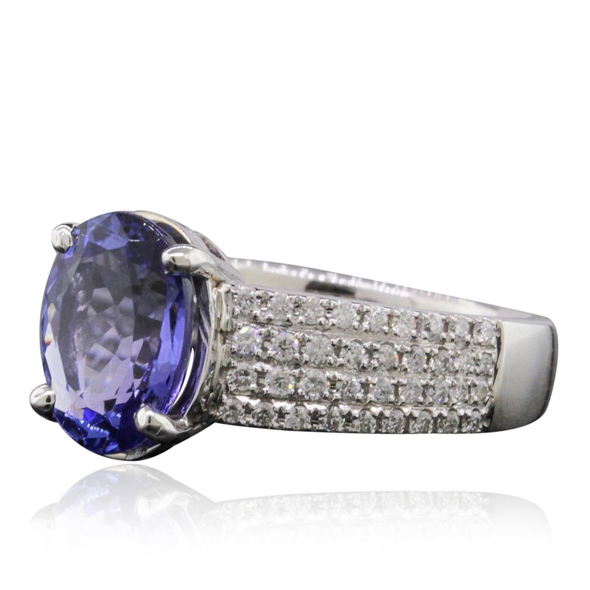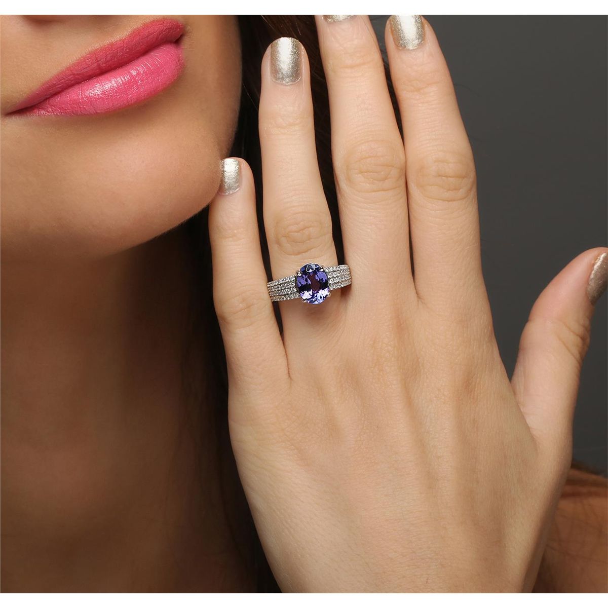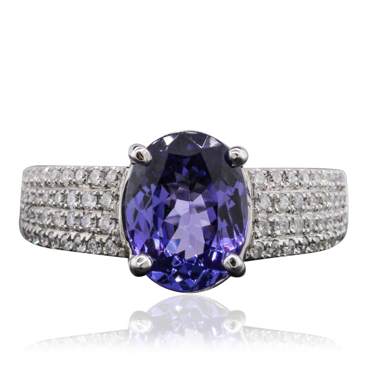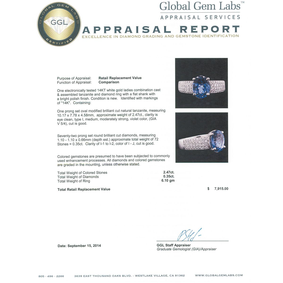 One electronically tested 14KT white gold ladies combination cast & assembled tanzanite and diamond ring with a flat shank with a bright polish finish. Identified with markings of "14K". Condition is new. Containing: One prong set oval modified brilliant cut natural tanzanite, measuring 10.17 x 7.78 x 4.58mm, approximate weight of 2.47ct., clarity is eye clean, type I, medium, moderately strong, violet color, (GIA V 5/4), cut is good. Seventy-Two prong set round brilliant cut diamonds, measuring 1.10 - 1.10 x 0.66mm (depth est.) approximate total weight of 72 Stones = 0.35ct. Clarity: I-1 to I-2. Color: I - J, Cut is Good. Colored gemstones are presumed to have been subjected to commonly used enhancement processes. All diamonds and colored gemstones are graded in the mounting, unless otherwise stated total weight of Colored Stones 2.47ct. Total Weight of Diamonds 0.35ct. Total Weight of Ring 6.10 grams.
